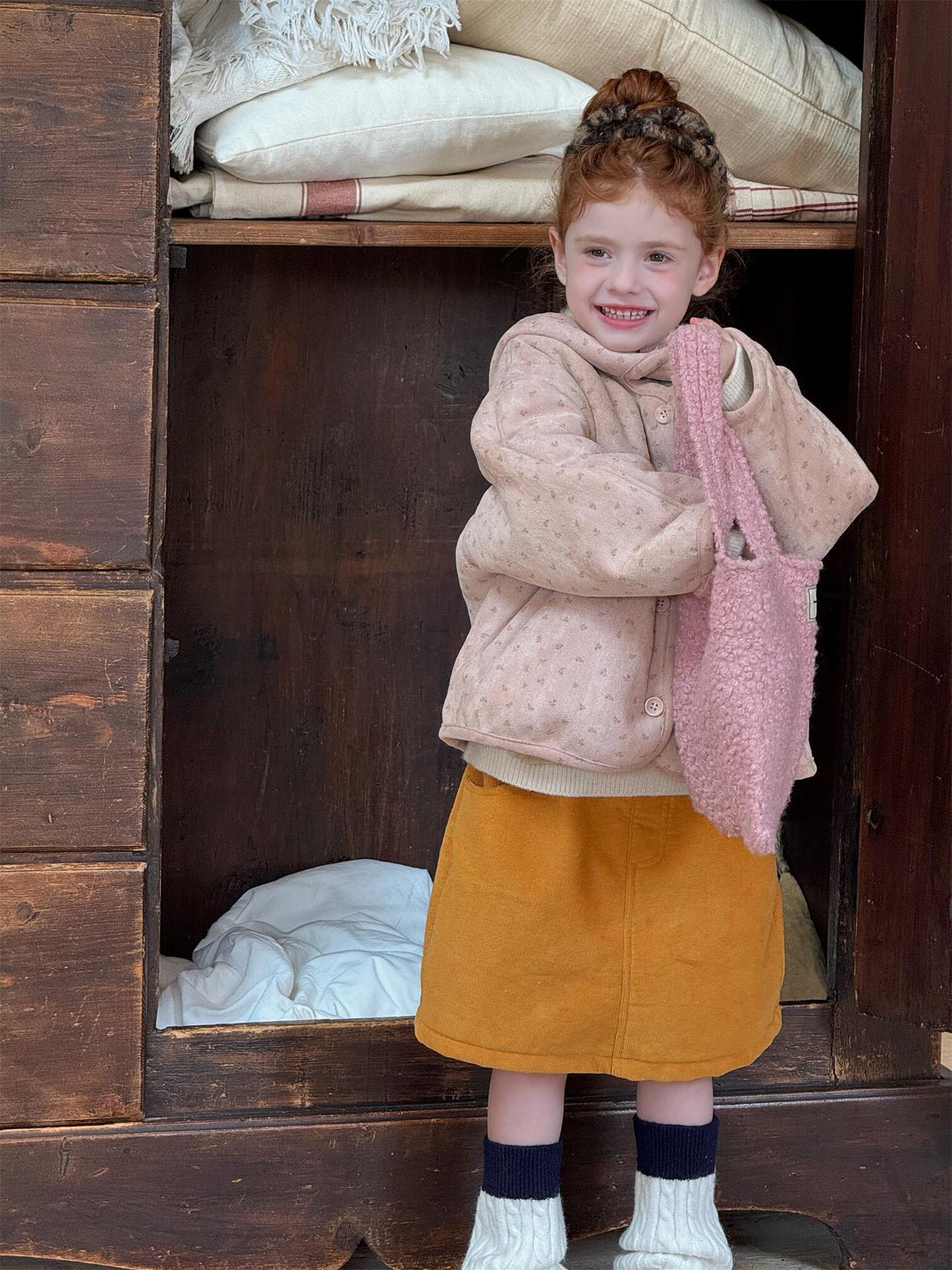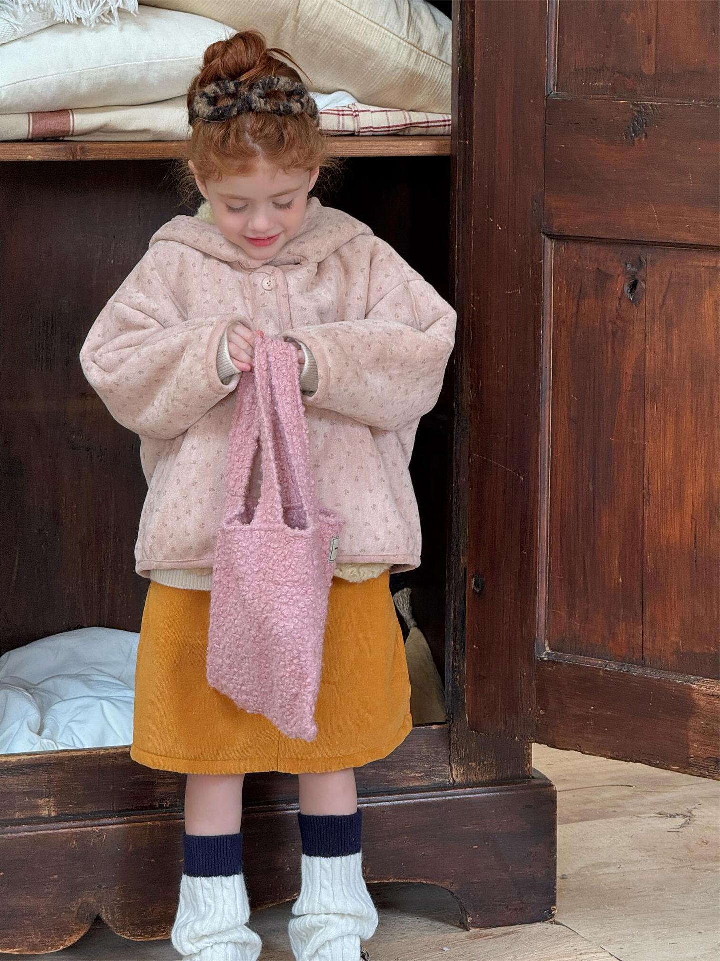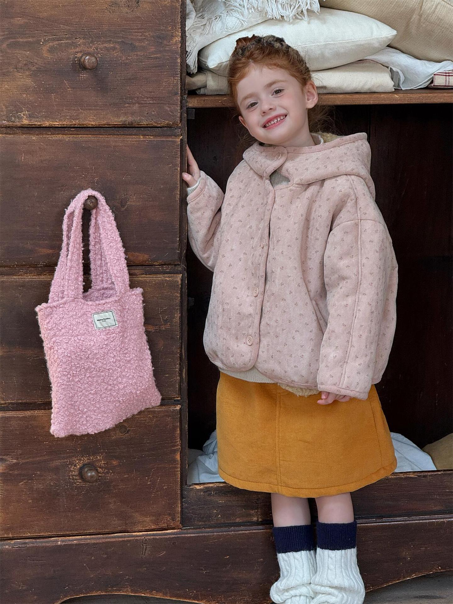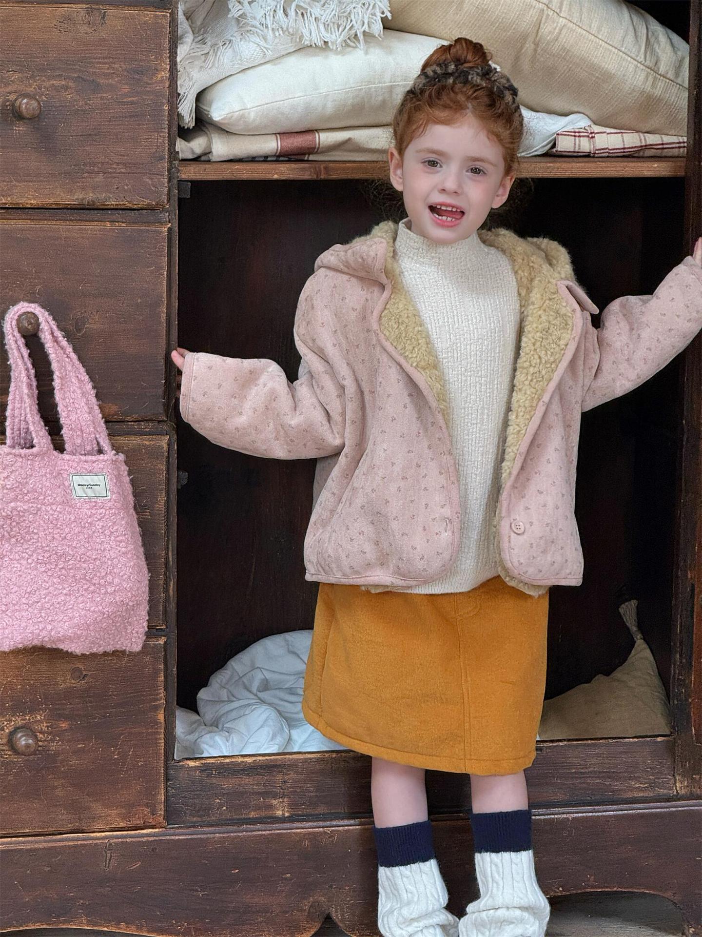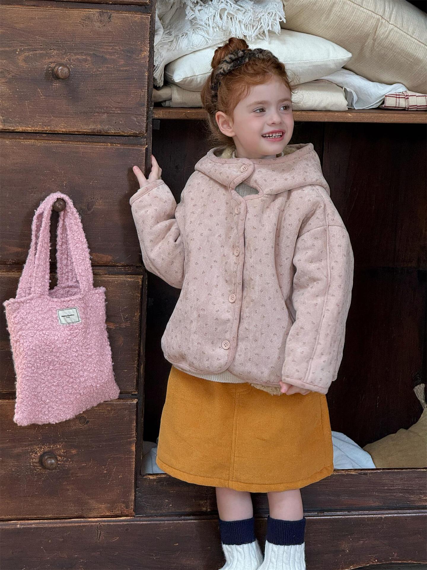 愛らしいフラワープリントが散りばめられた、フーディジャケットです。表面はスエード調の滑らかな素材感で、裏地には暖かいボアフリースを使用しているため、真冬でも快適な着心地を提供します。フード付きのデザインがカジュアルな印象を与え、ピンクの華やかな色合いがコーディネートの主役になります。暖かさと可愛らしさを兼ね備えた、冬のおしゃれに欠かせない子ども服のアウターです。