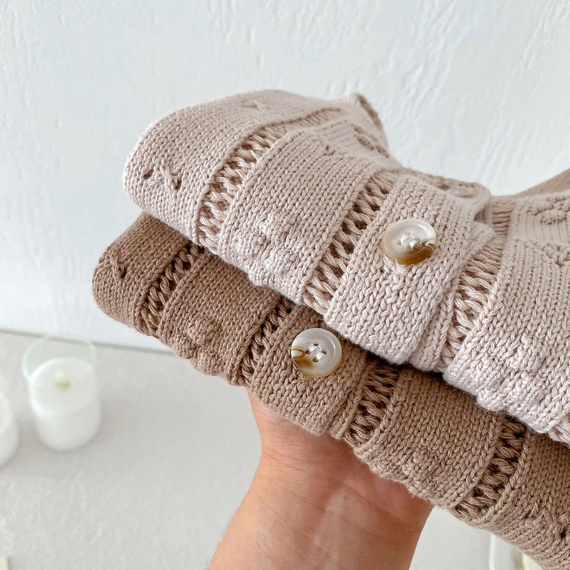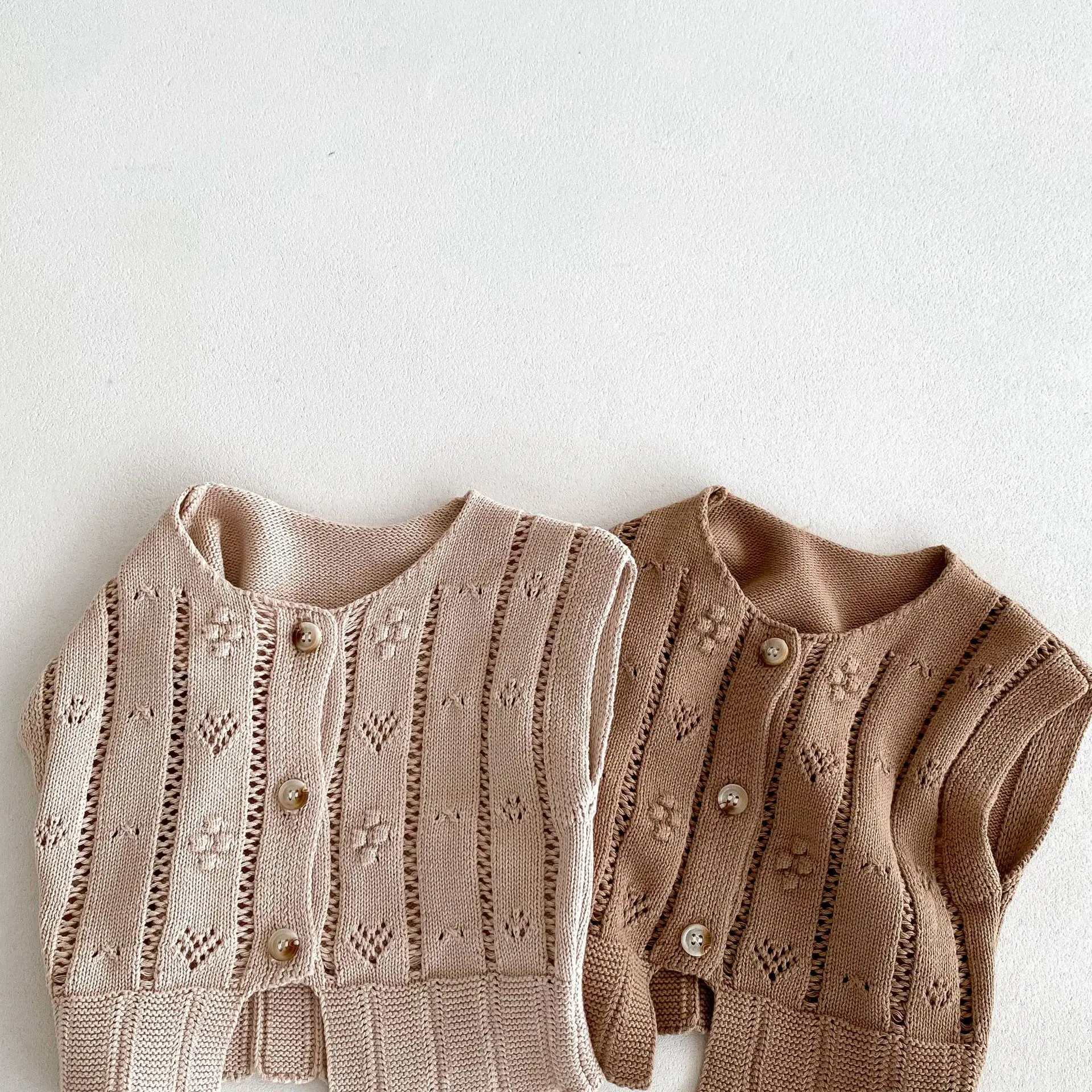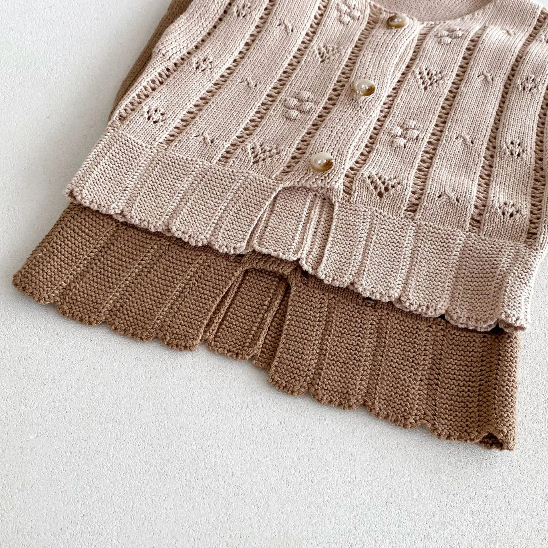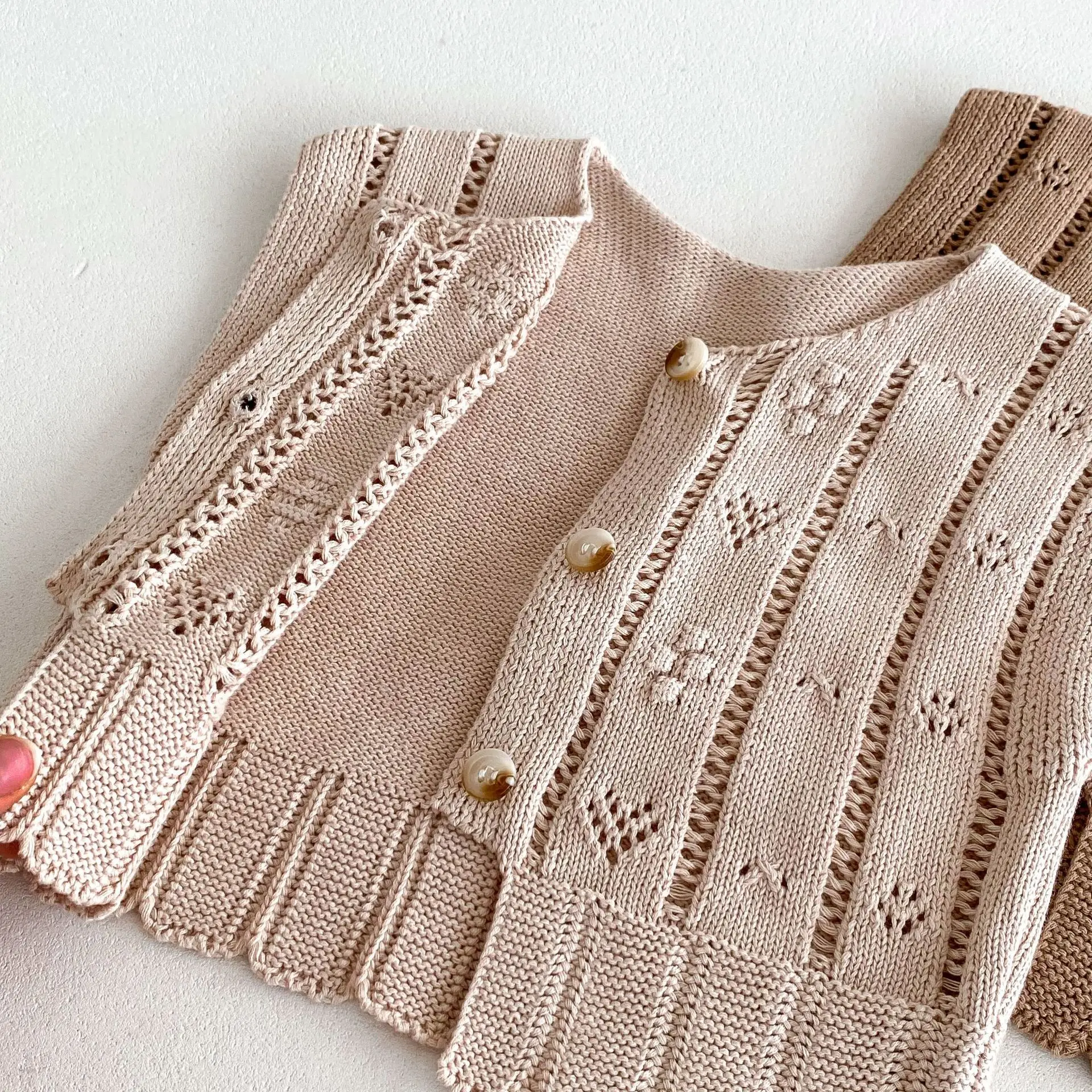 レースニットが美しい前あきのショートベストです。シンプルでありながら、洗練されたデザインが特徴で、どんなコーディネートにも合わせやすい一枚です。柔らかい素材で肌触りも良く、動きやすさを考慮した作りとなっているため、お子様のデイリーウェアとして活躍します。2つのカラーから選べるので、お子様のスタイルにぴったりのものをお選びいただけます。