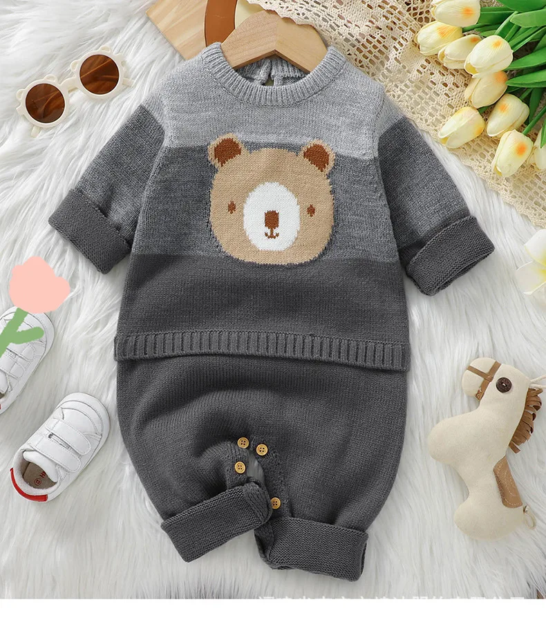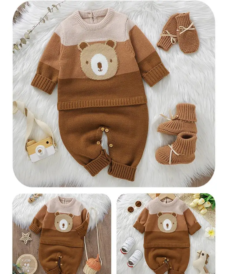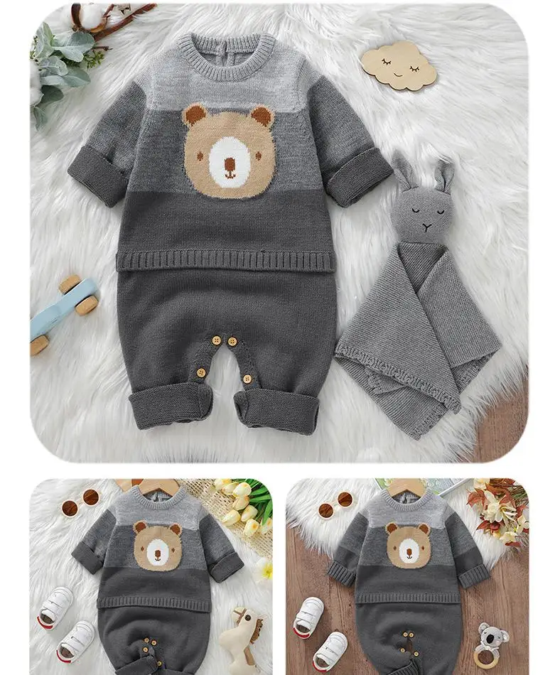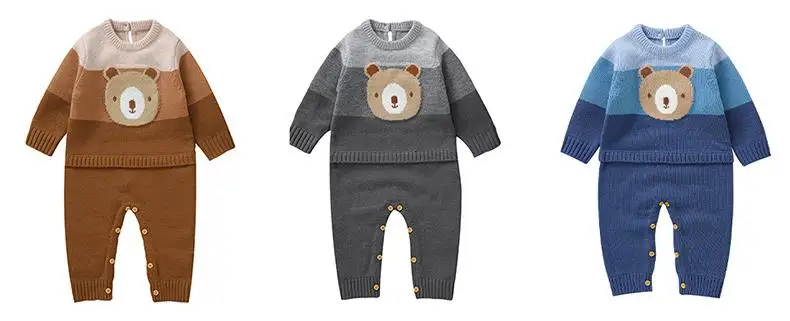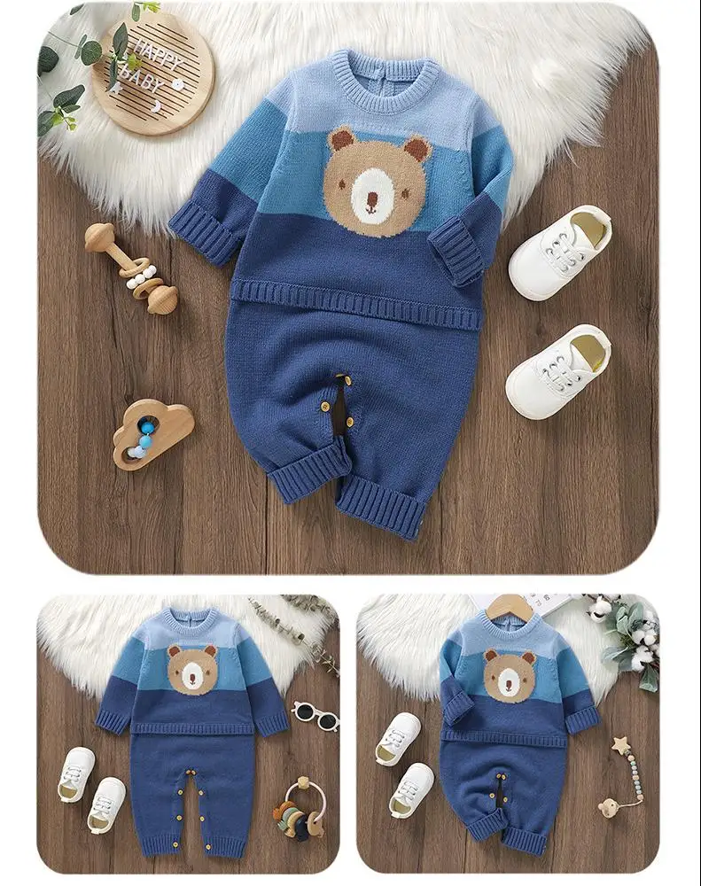 ベビーロンパース ベアくまワッペンボーダーニットドッキングジャンプスーツ 3カラー【mh0006794】
