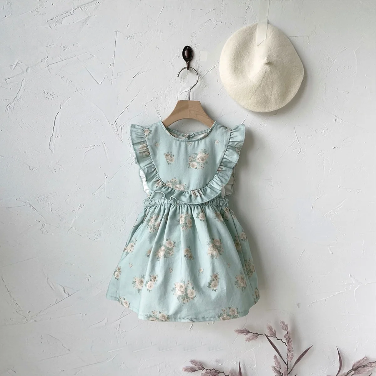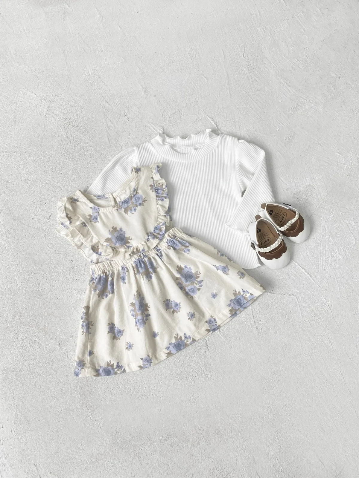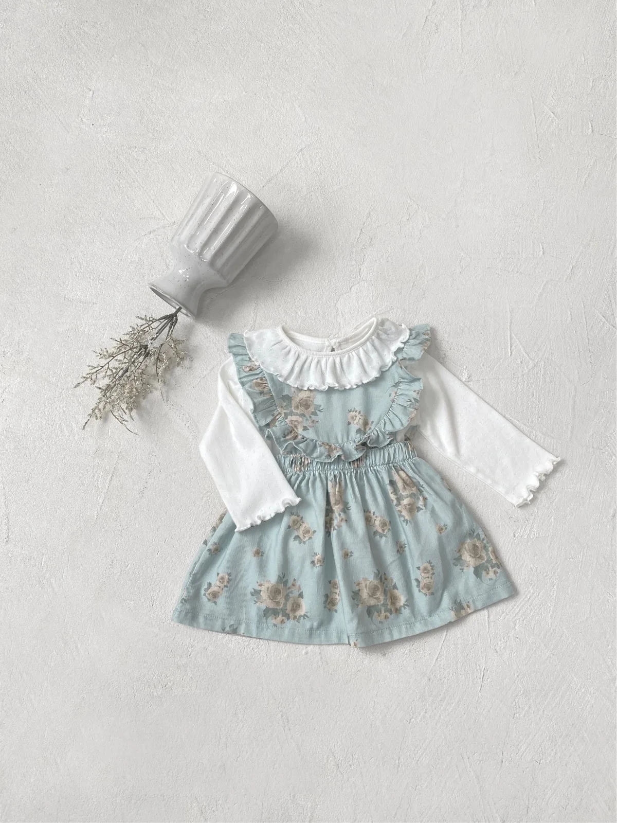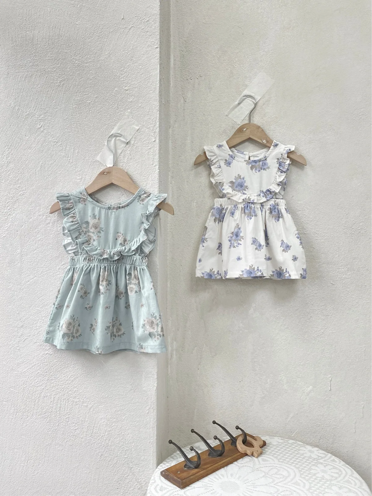 ベビーワンピース フラワープリントフリルショルダーノースリーブコーデュロイエプロンドレスワンピース 2カラー【mh0006955】