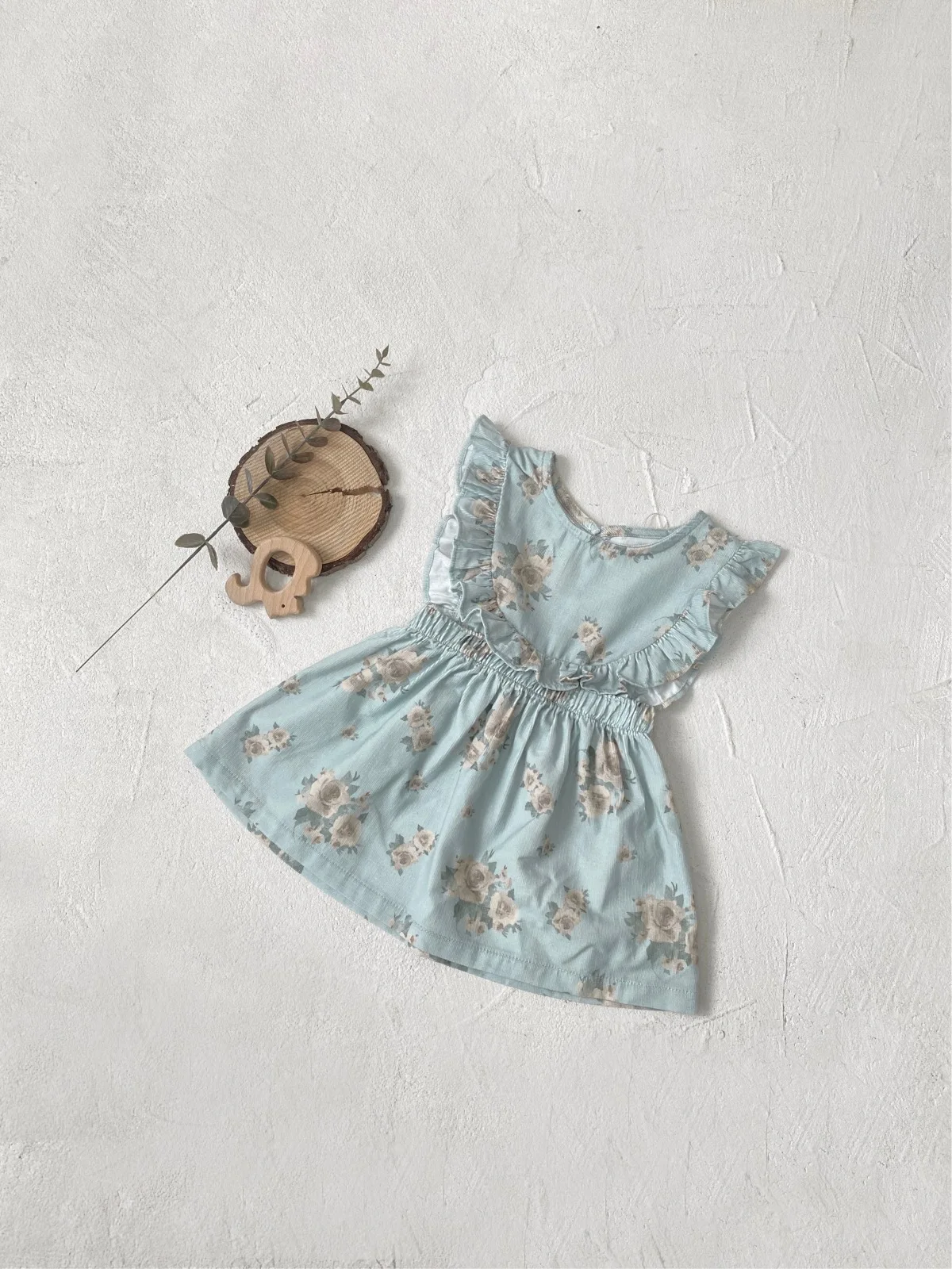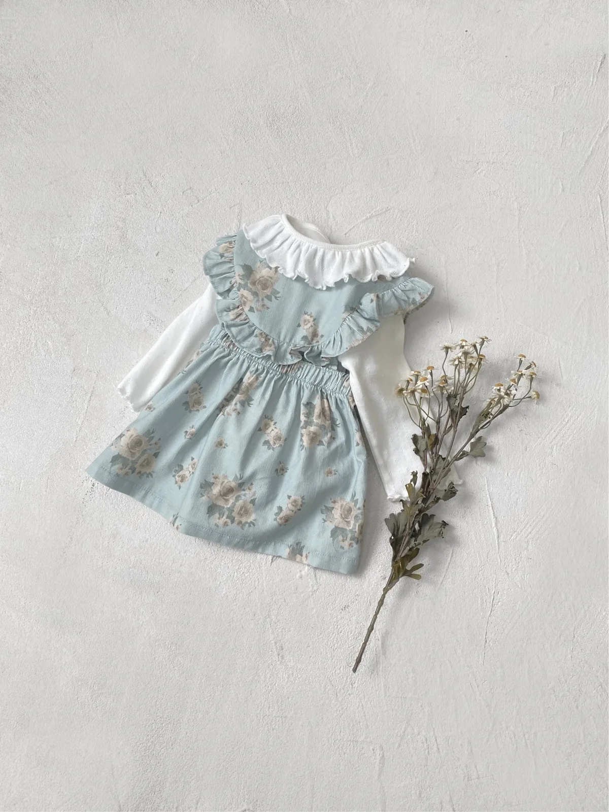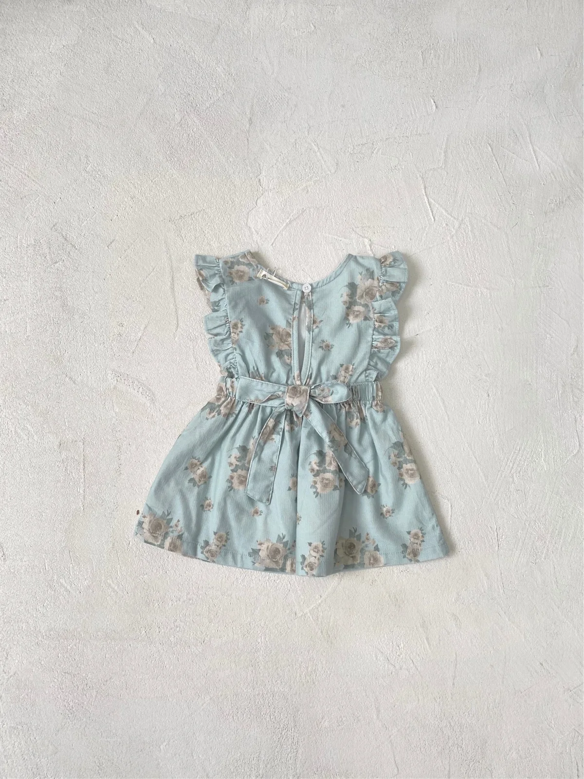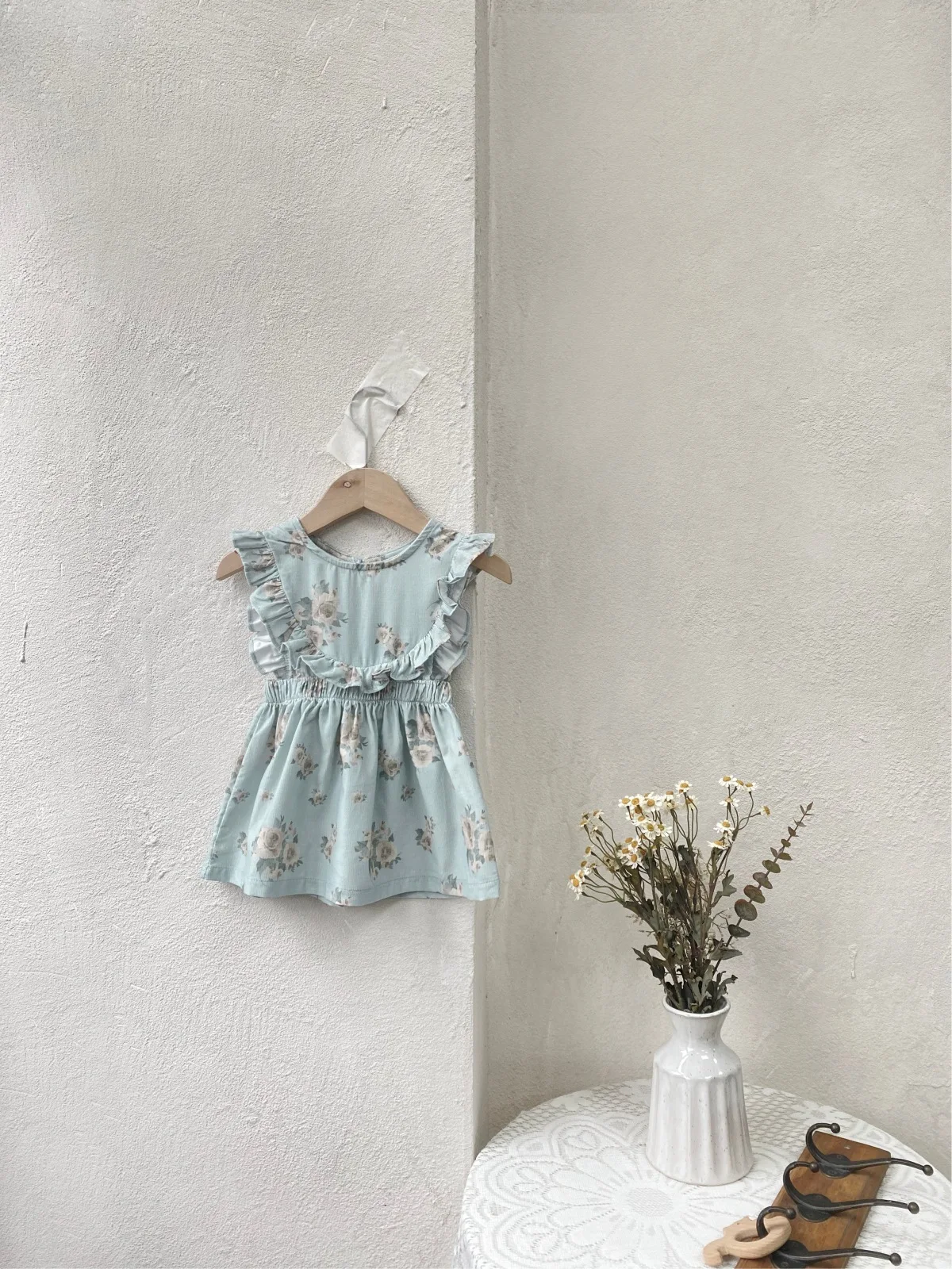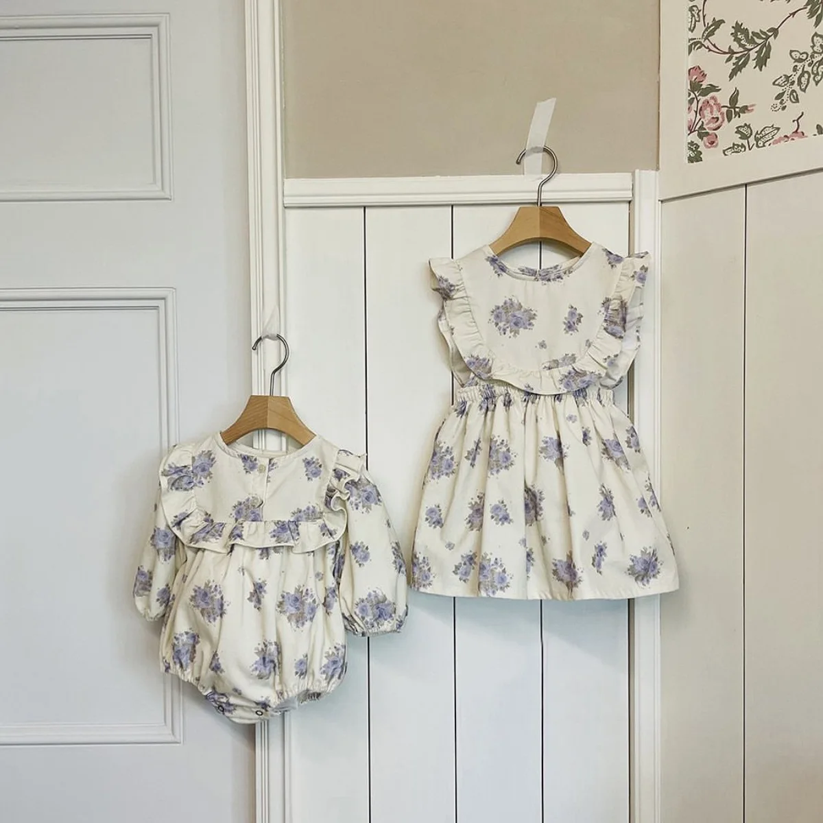 ベビーワンピース フラワープリントフリルショルダーノースリーブコーデュロイエプロンドレスワンピース 2カラー【mh0006955】