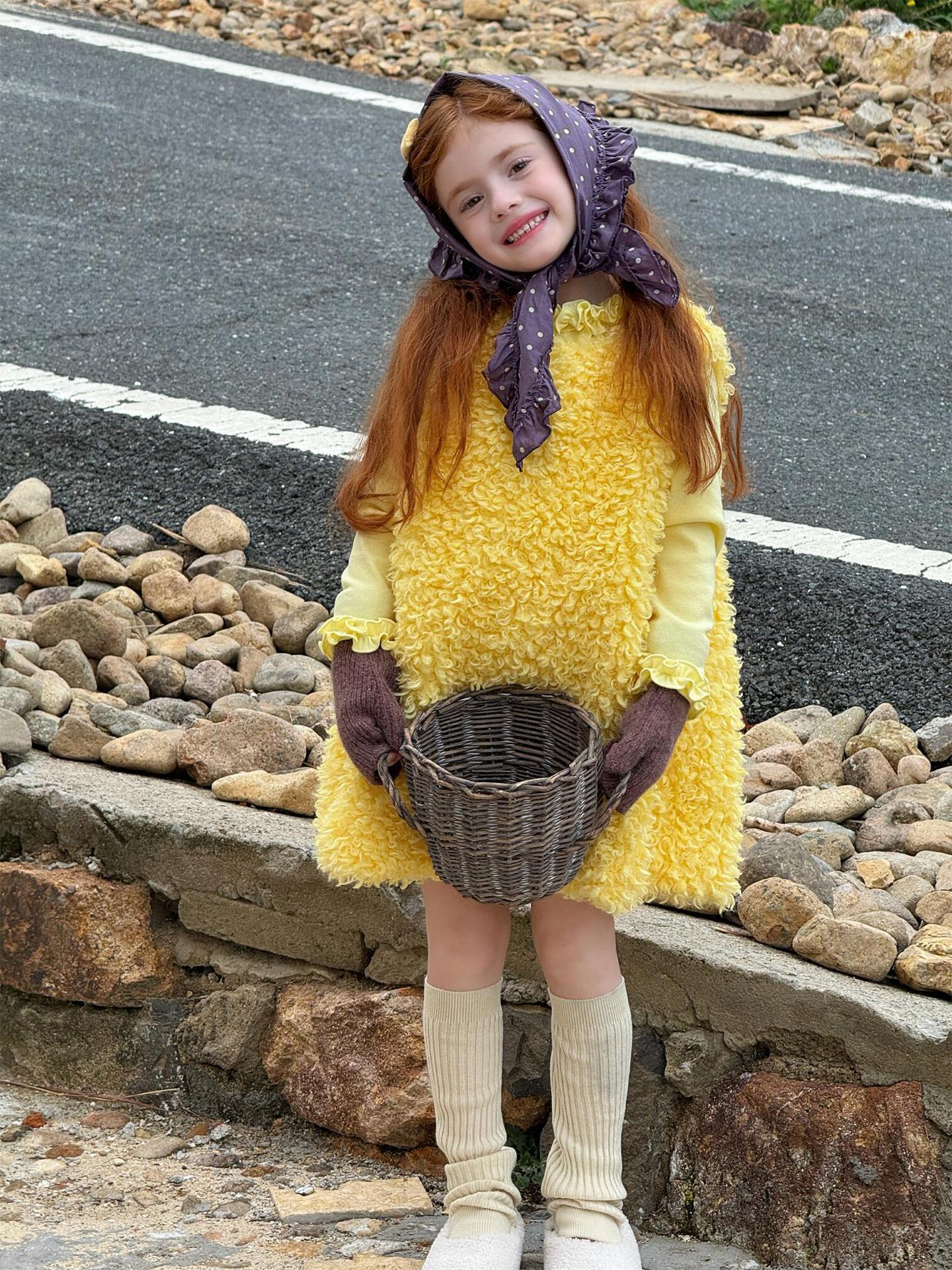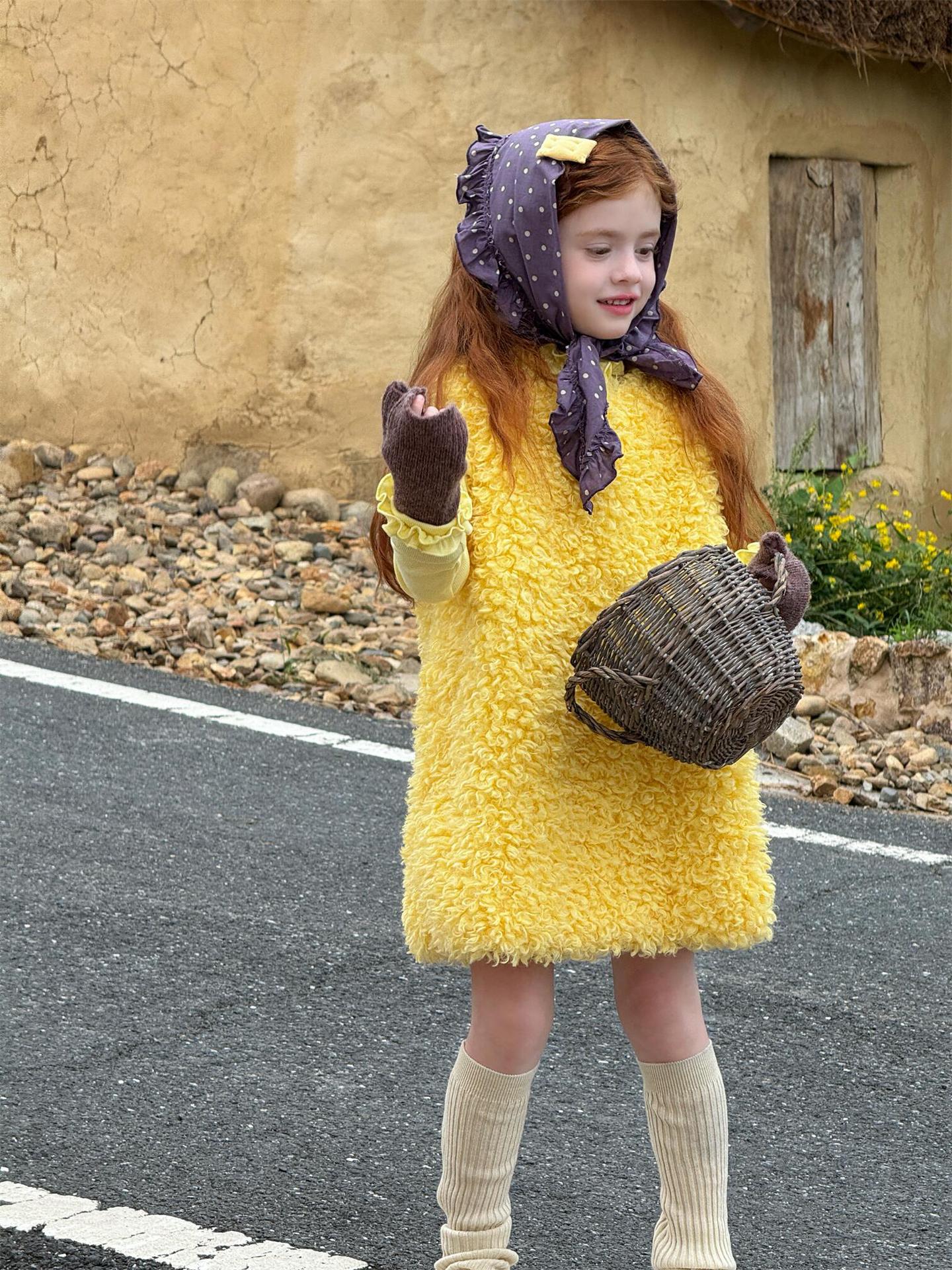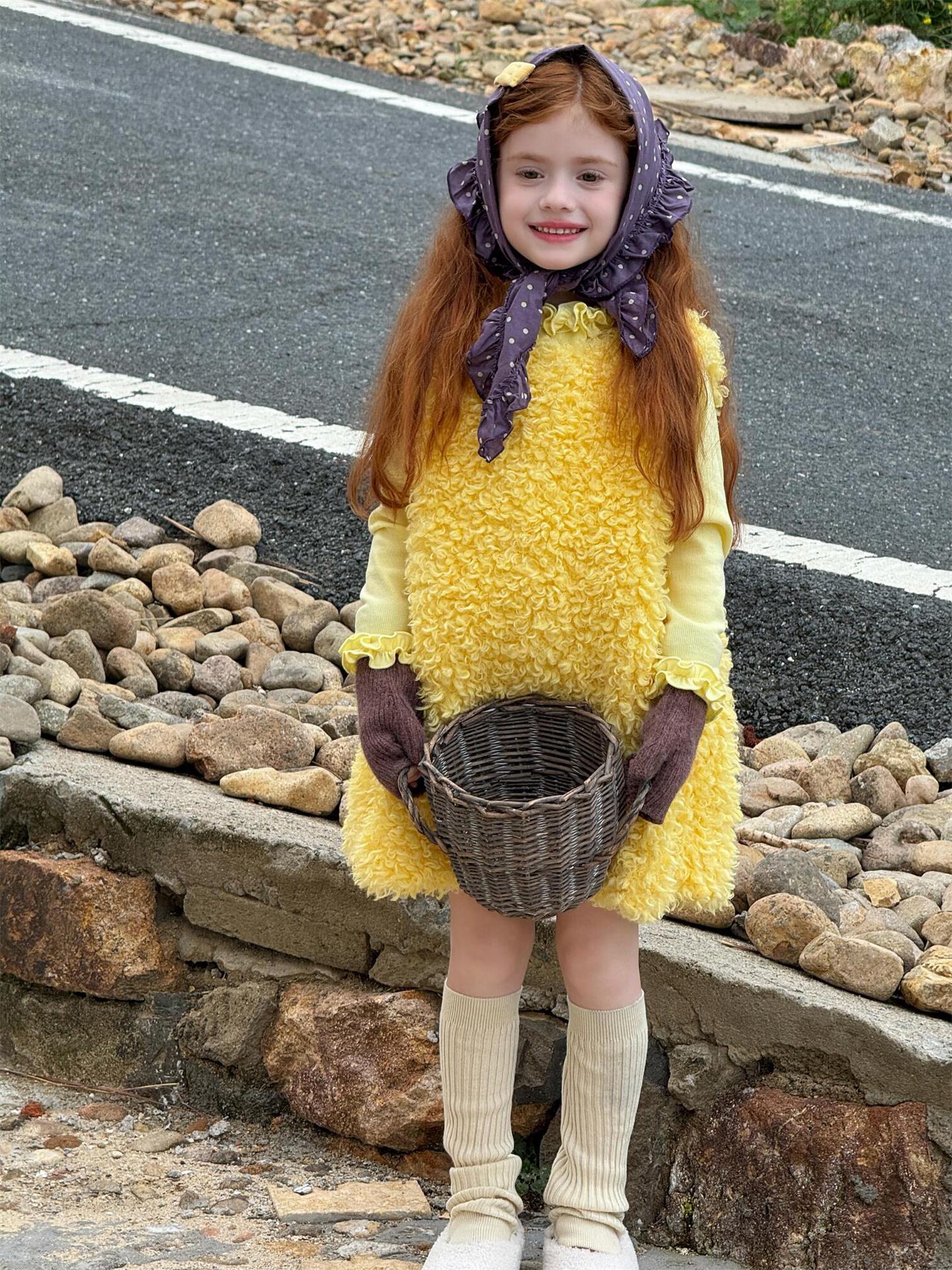 ふっくらとしたファーフリース素材を使用した、暖かく愛らしいノースリーブワンピースです。顔周りを華やかに見せる大きなラッフル襟のデザインが、甘くキュートなムードを演出し、お嬢様のようなスタイルを叶えます。インナーとのレイヤードも楽しめるこのサマードレスのようなシルエットのワンピースは、寒い季節のおしゃれなコーディネートに彩りを添える子ども服です。