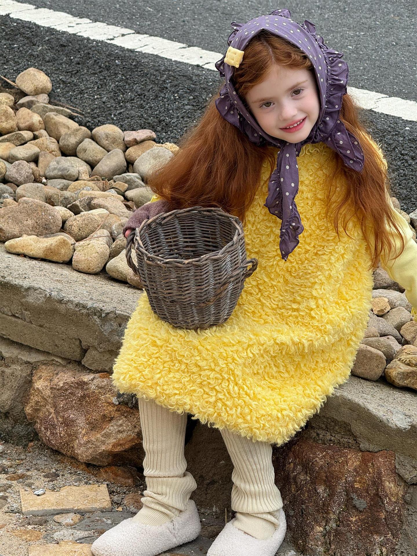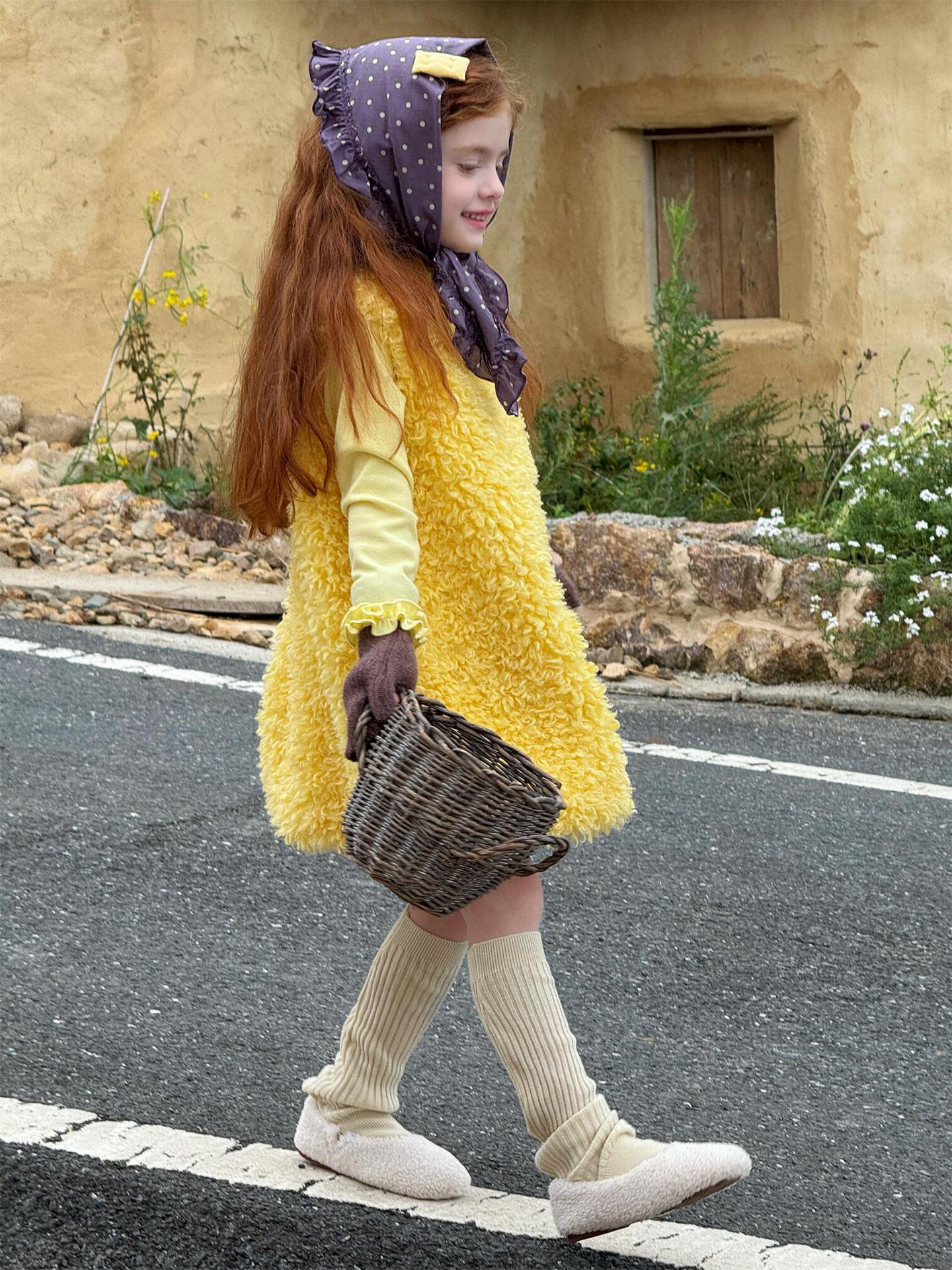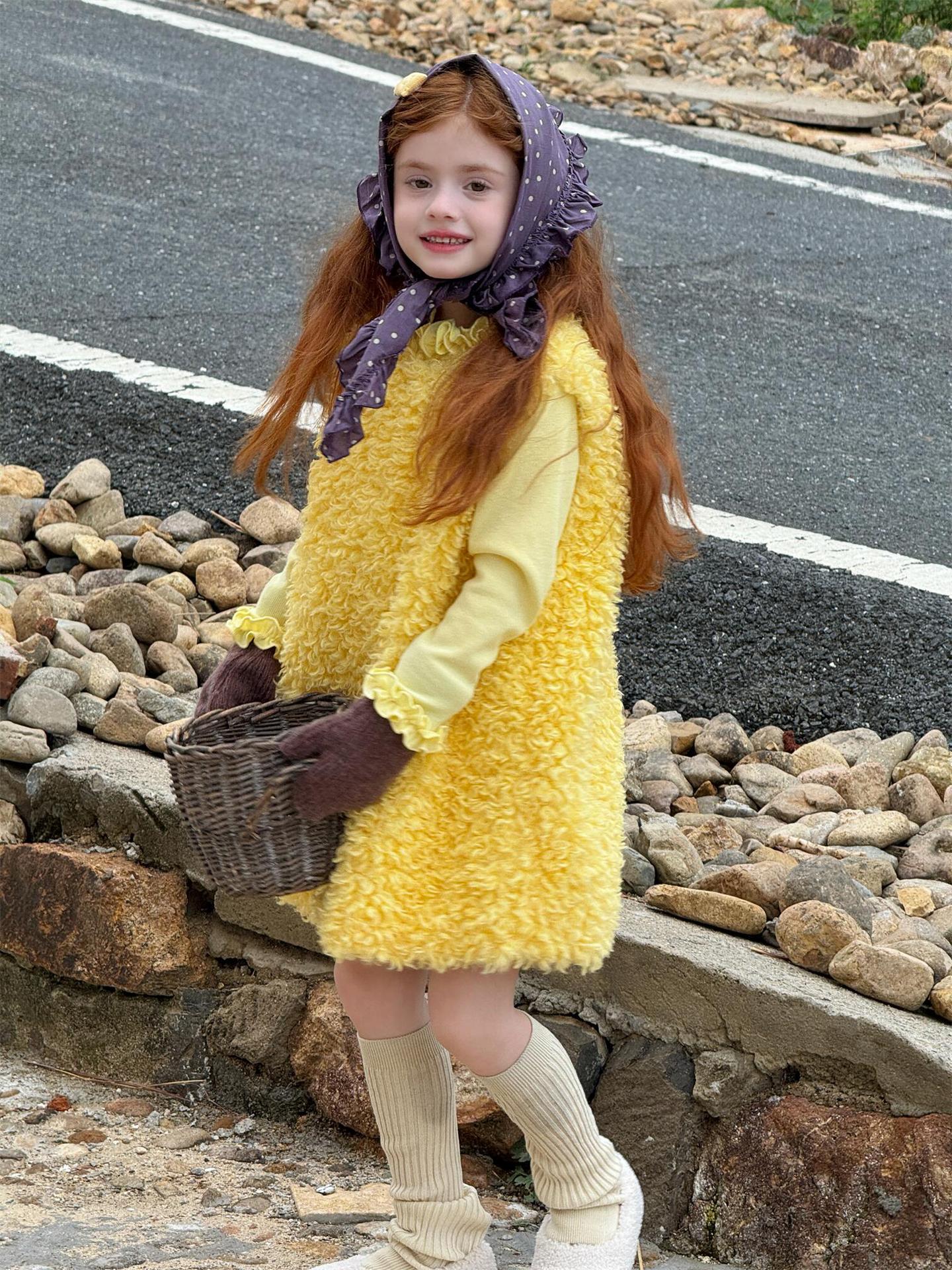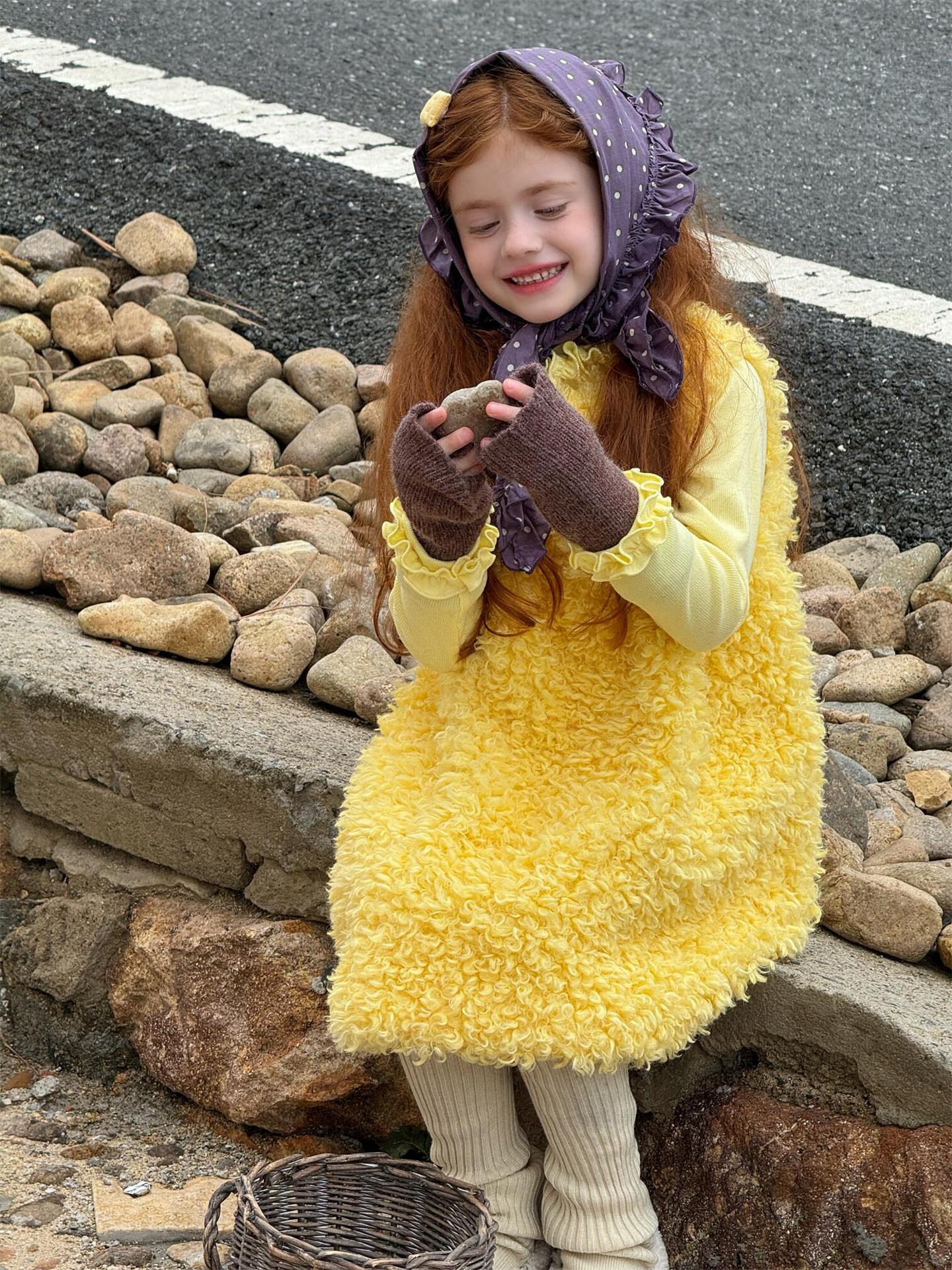 ふっくらとしたファーフリース素材を使用した、暖かく愛らしいノースリーブワンピースです。顔周りを華やかに見せる大きなラッフル襟のデザインが、甘くキュートなムードを演出し、お嬢様のようなスタイルを叶えます。インナーとのレイヤードも楽しめるこのサマードレスのようなシルエットのワンピースは、寒い季節のおしゃれなコーディネートに彩りを添える子ども服です。