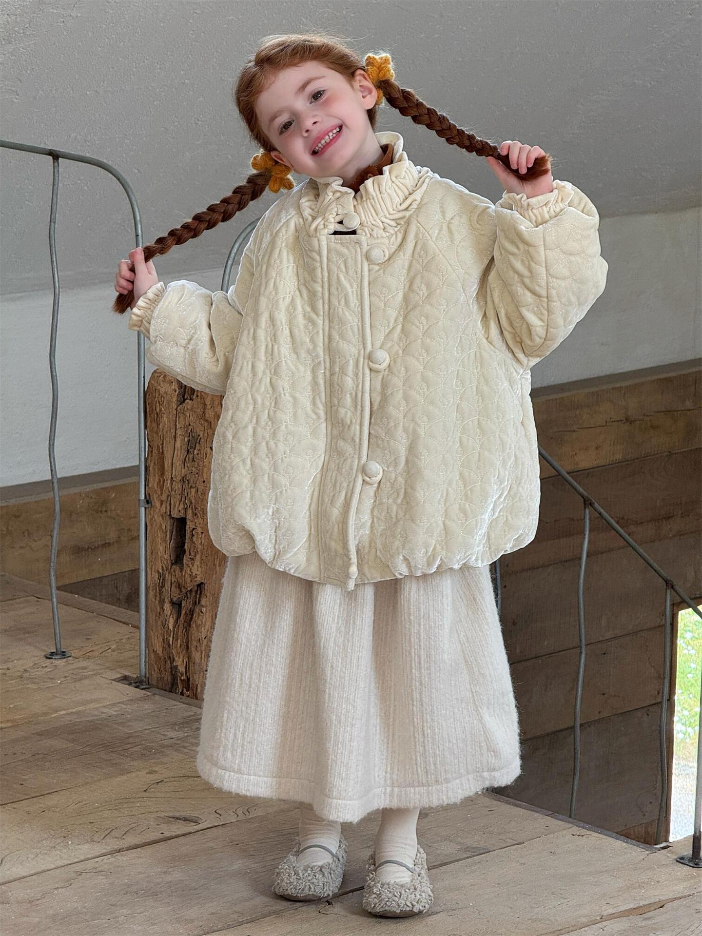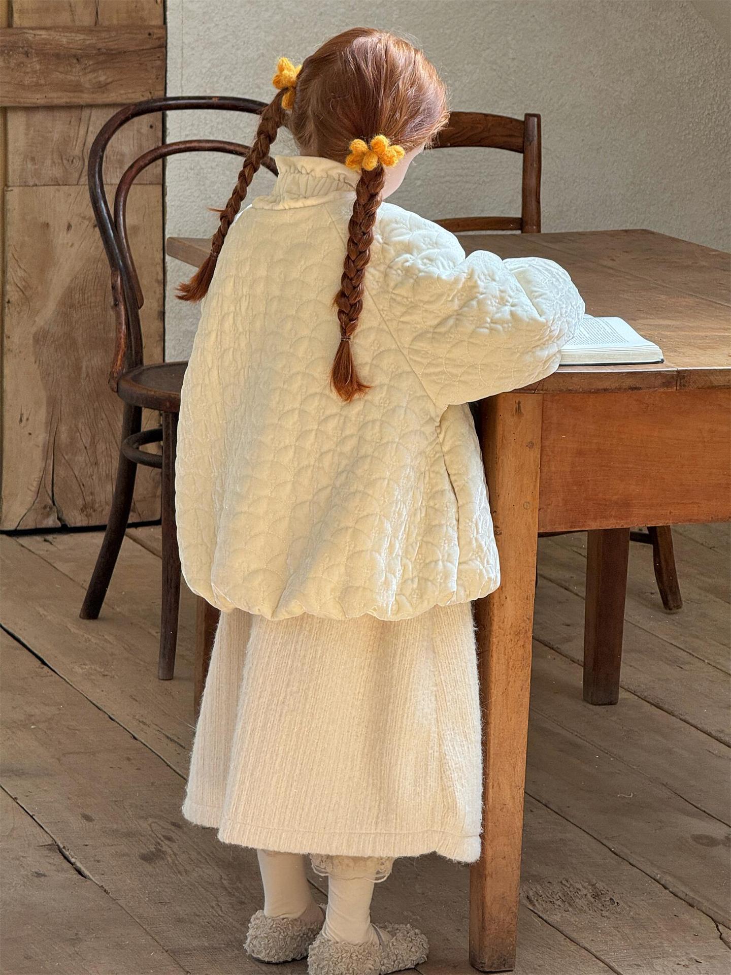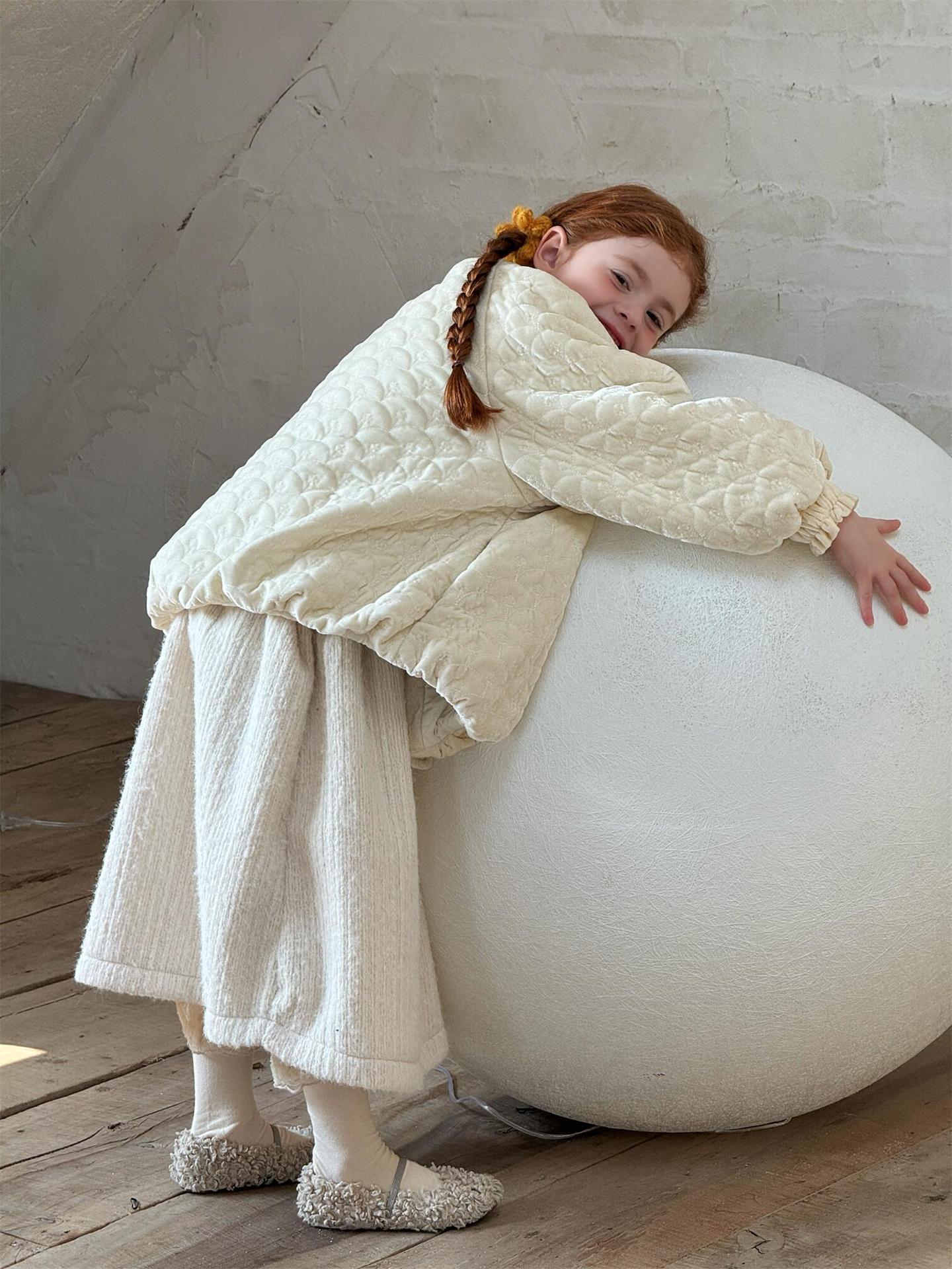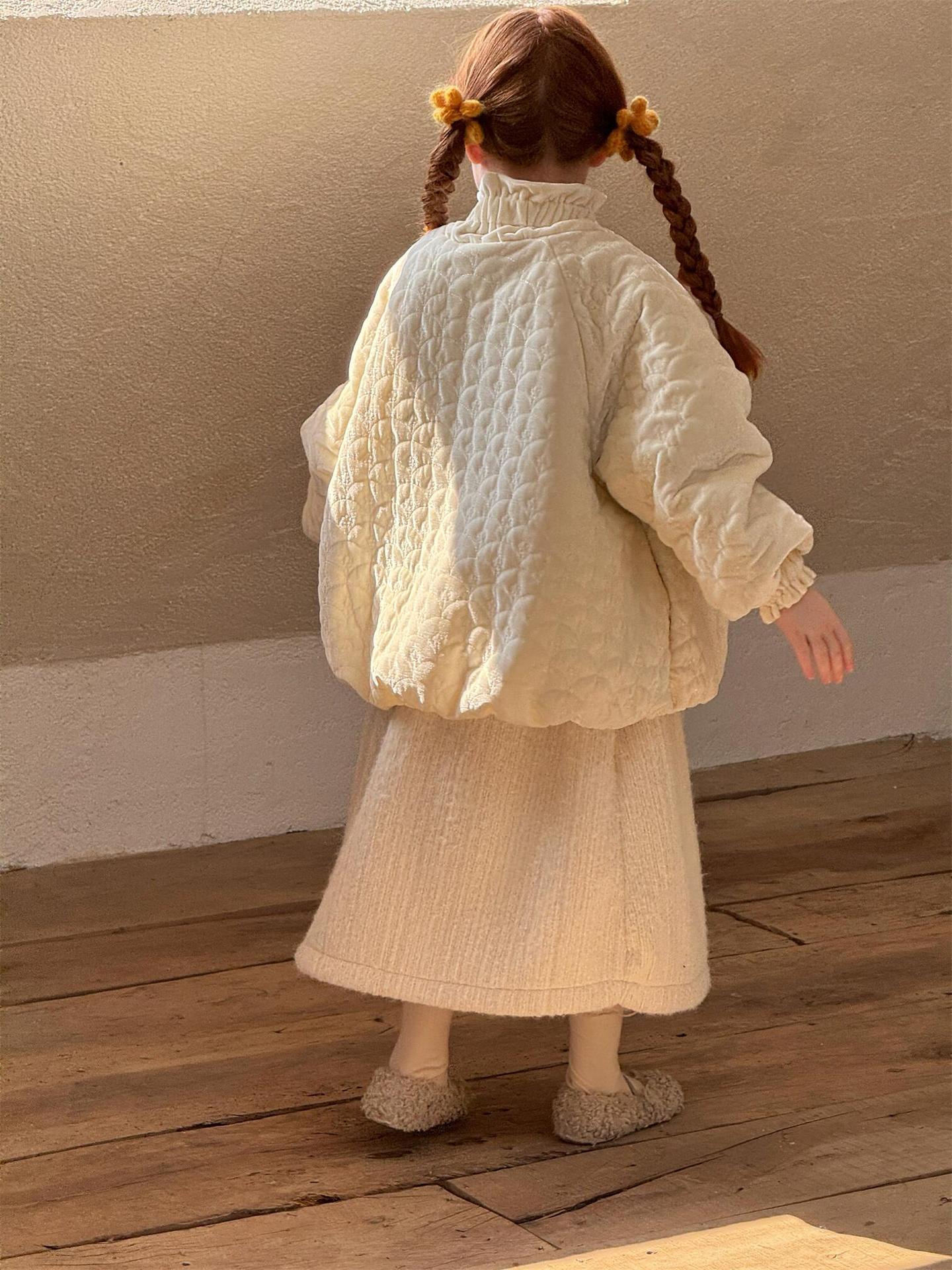 ふっくらとした中わた入りのジャケットコートは、全面に施された刺繍エンボス加工がロマンティックなムードを醸し出します。ベルベットのような柔らかな素材感が、ガーリーで愛らしい印象を与え、冬のコーディネートを華やかに彩ります。暖かさとデザイン性を兼ね備えたこのアウターは、お出かけにぴったりのスイートな子ども服です。