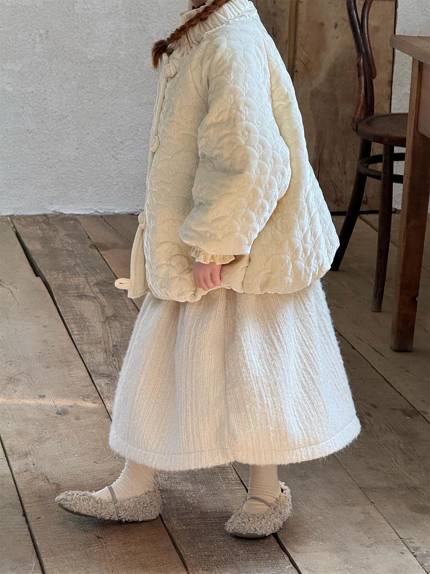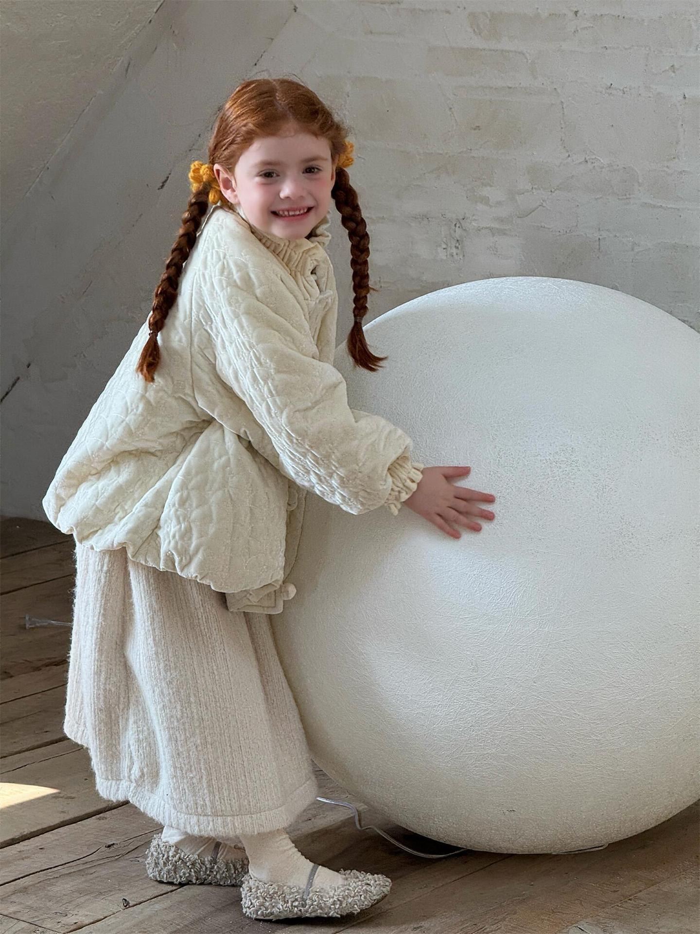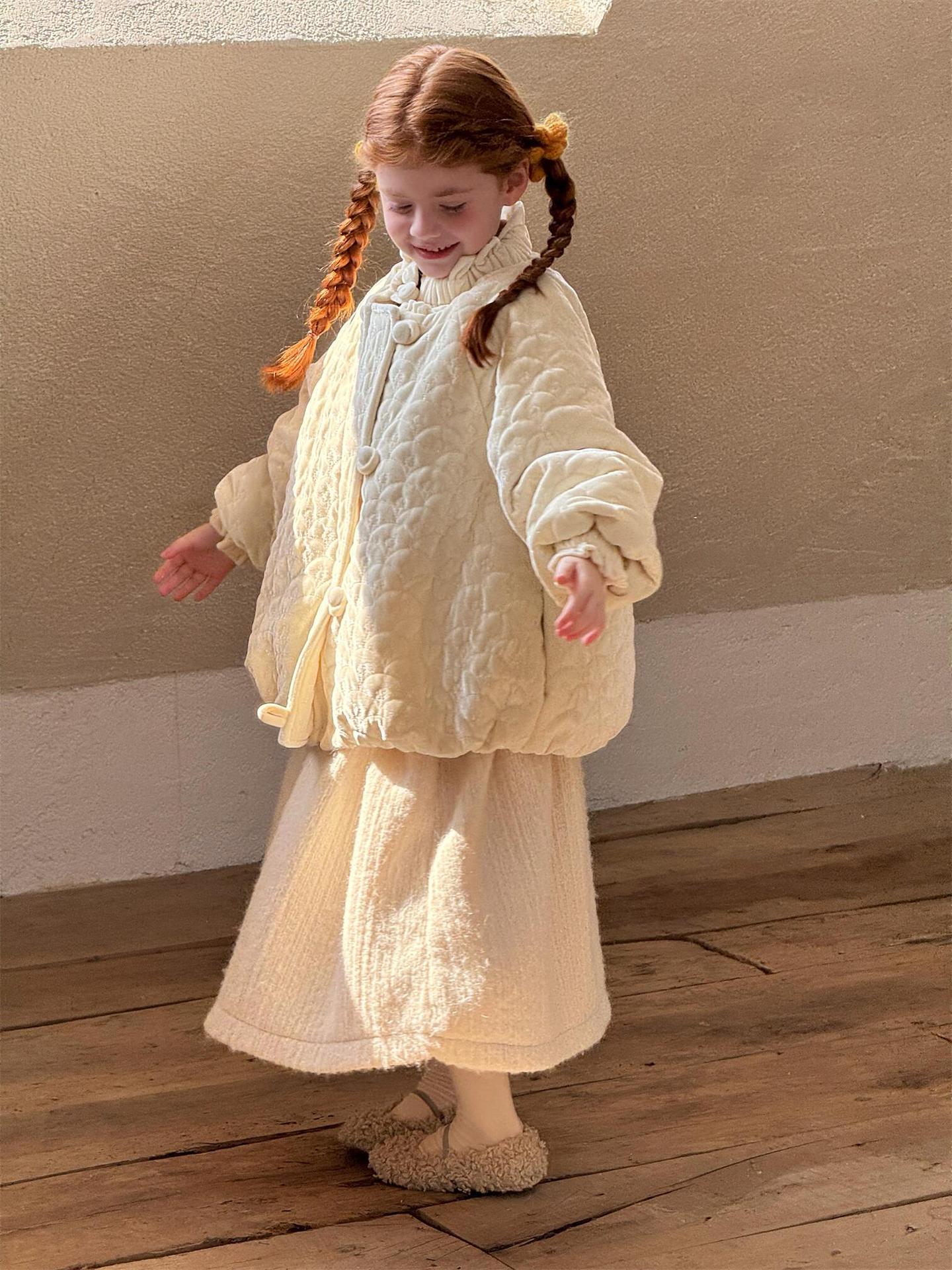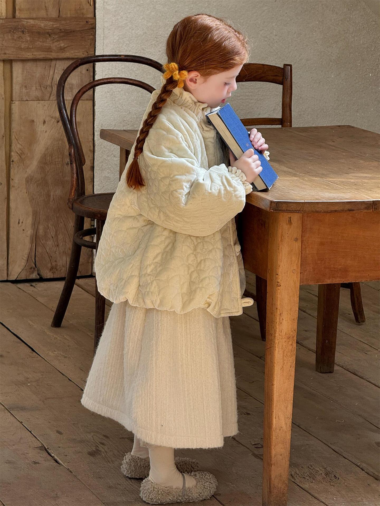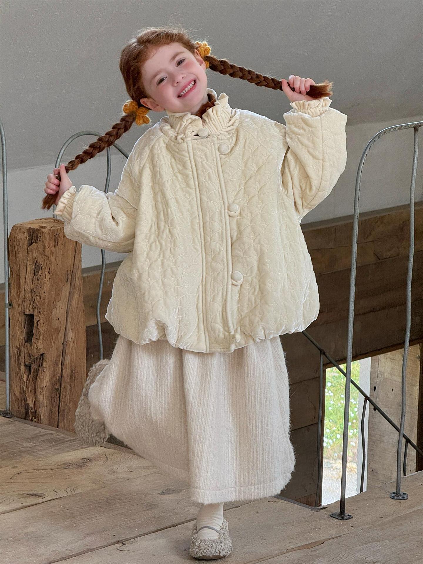 ふっくらとした中わた入りのジャケットコートは、全面に施された刺繍エンボス加工がロマンティックなムードを醸し出します。ベルベットのような柔らかな素材感が、ガーリーで愛らしい印象を与え、冬のコーディネートを華やかに彩ります。暖かさとデザイン性を兼ね備えたこのアウターは、お出かけにぴったりのスイートな子ども服です。