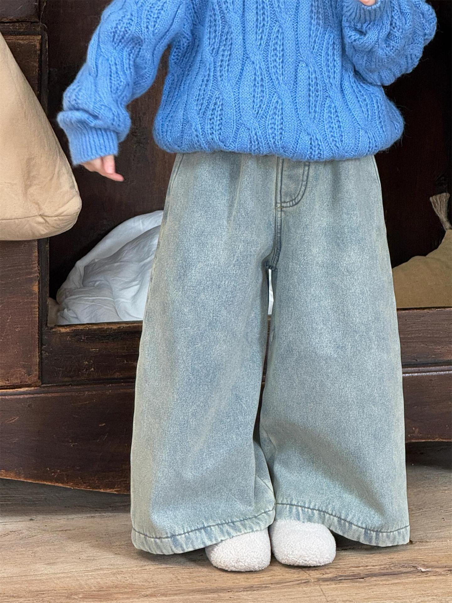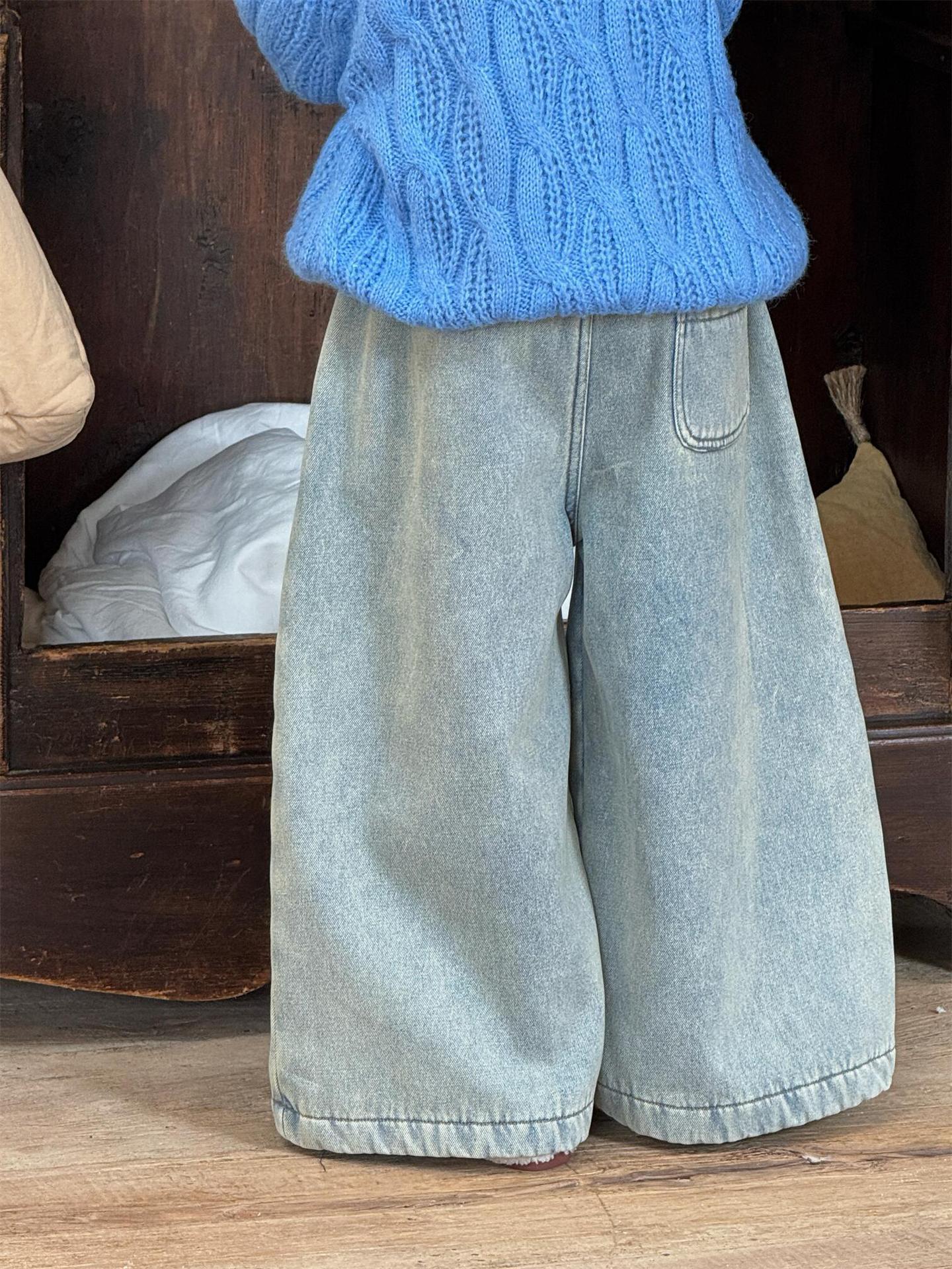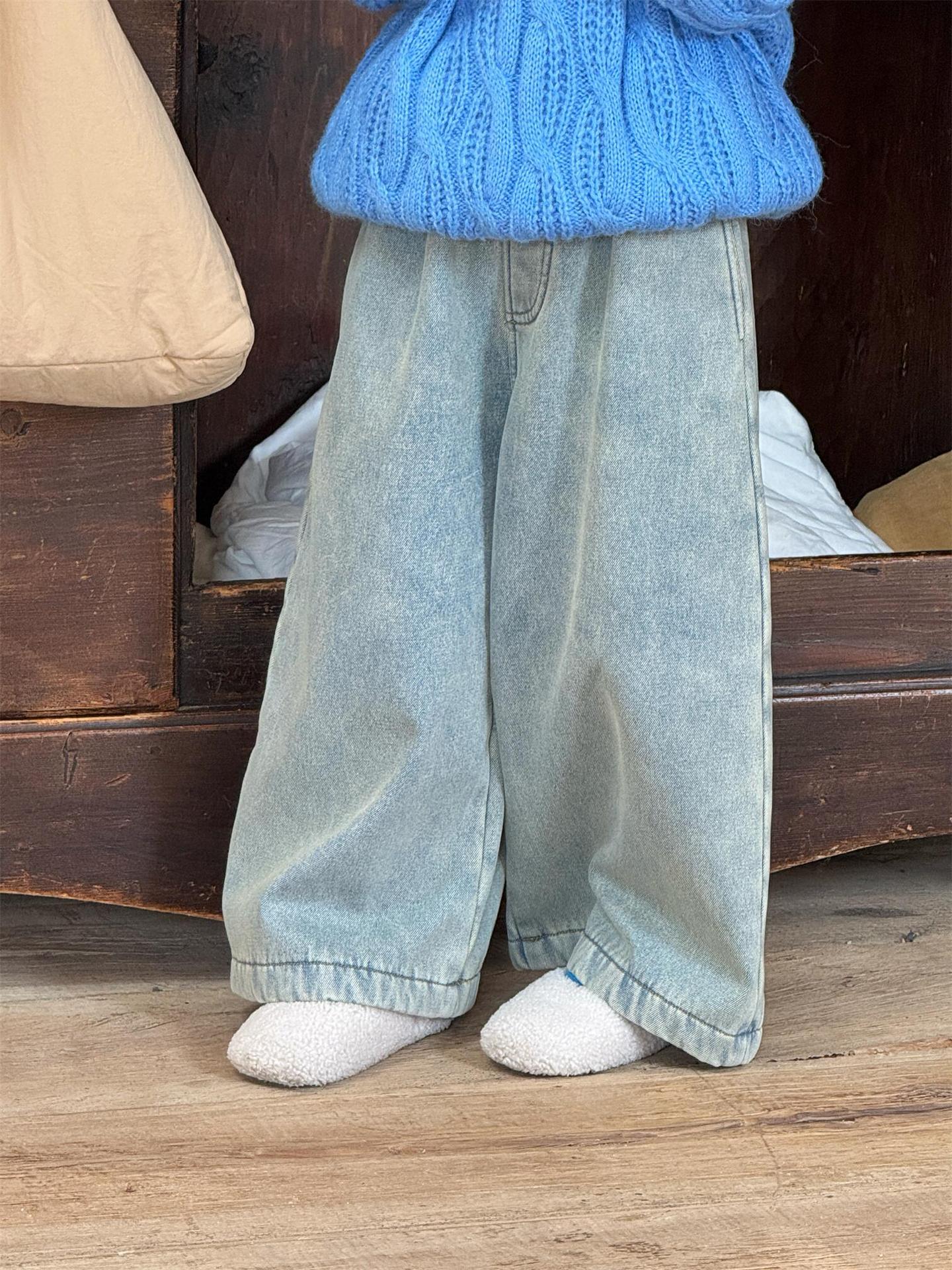 裏地にフリース素材を使用した暖かなデニムパンツ(暖パン)です。ルーズなワイドシルエットとストレートレッグのデザインが、トレンド感と快適な穿き心地を両立させます。寒い季節でも暖かく、カジュアルながらもおしゃれな印象を与えるジーンズは、デイリーに活躍する子ども服のボトムスとして重宝します。
