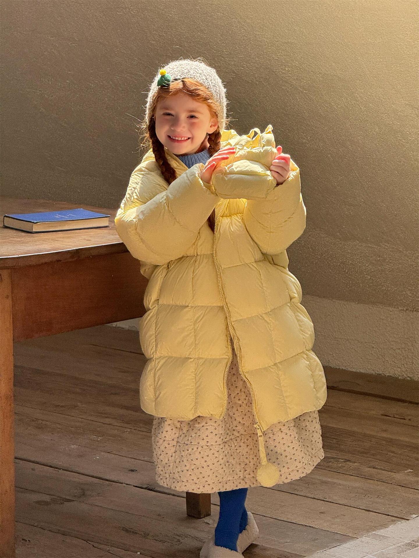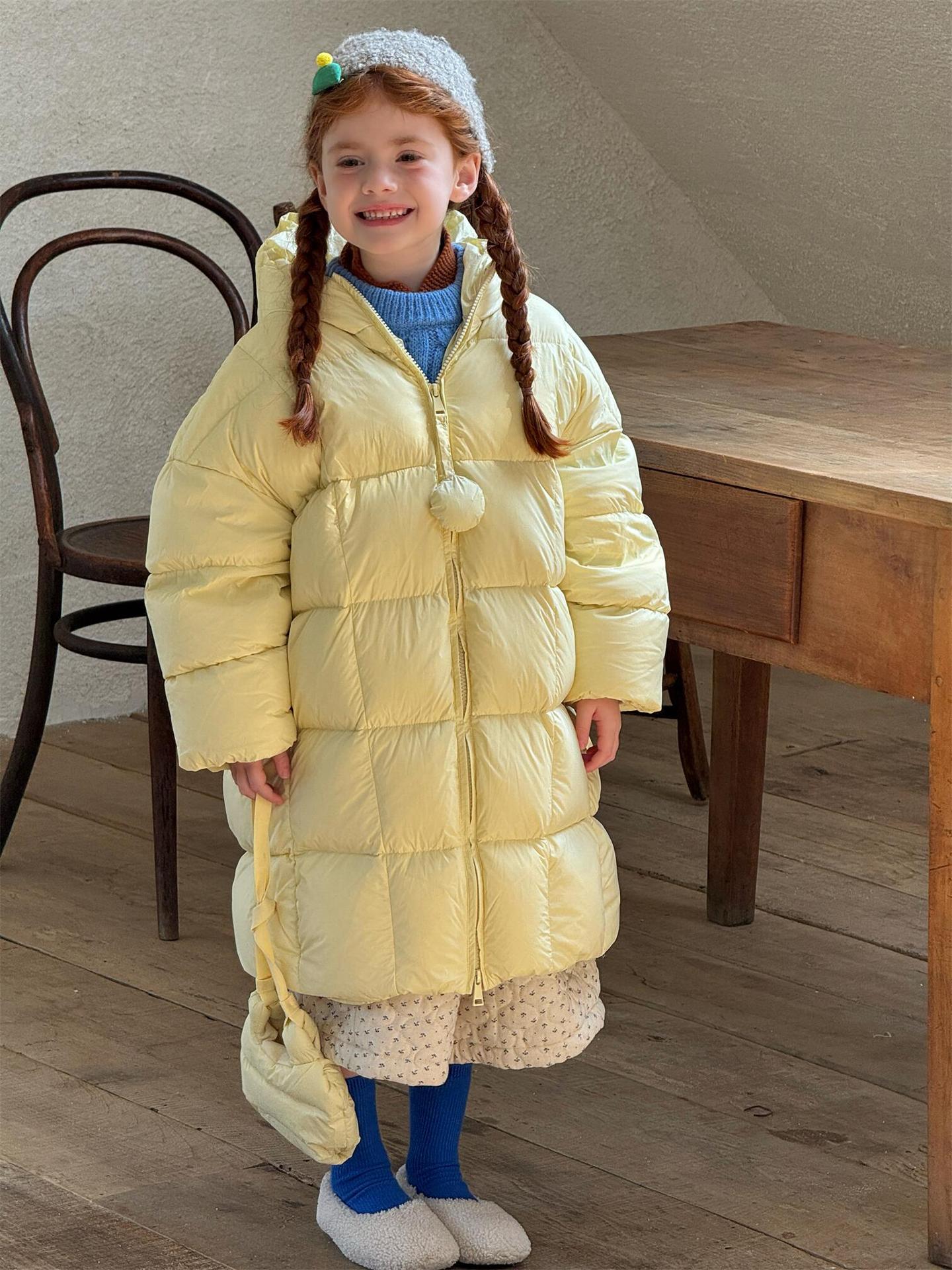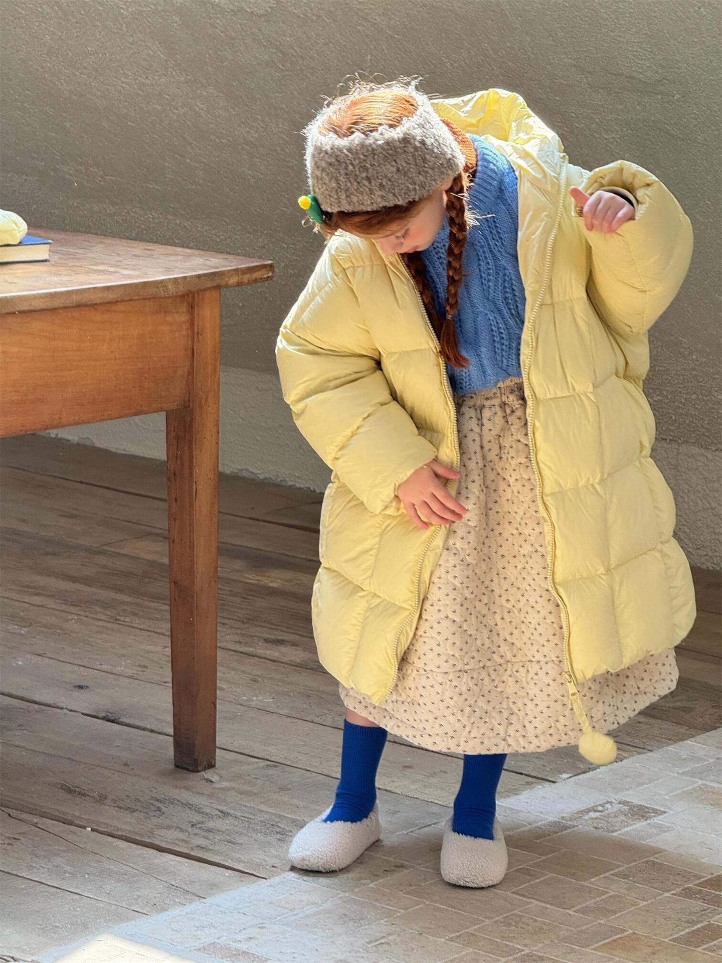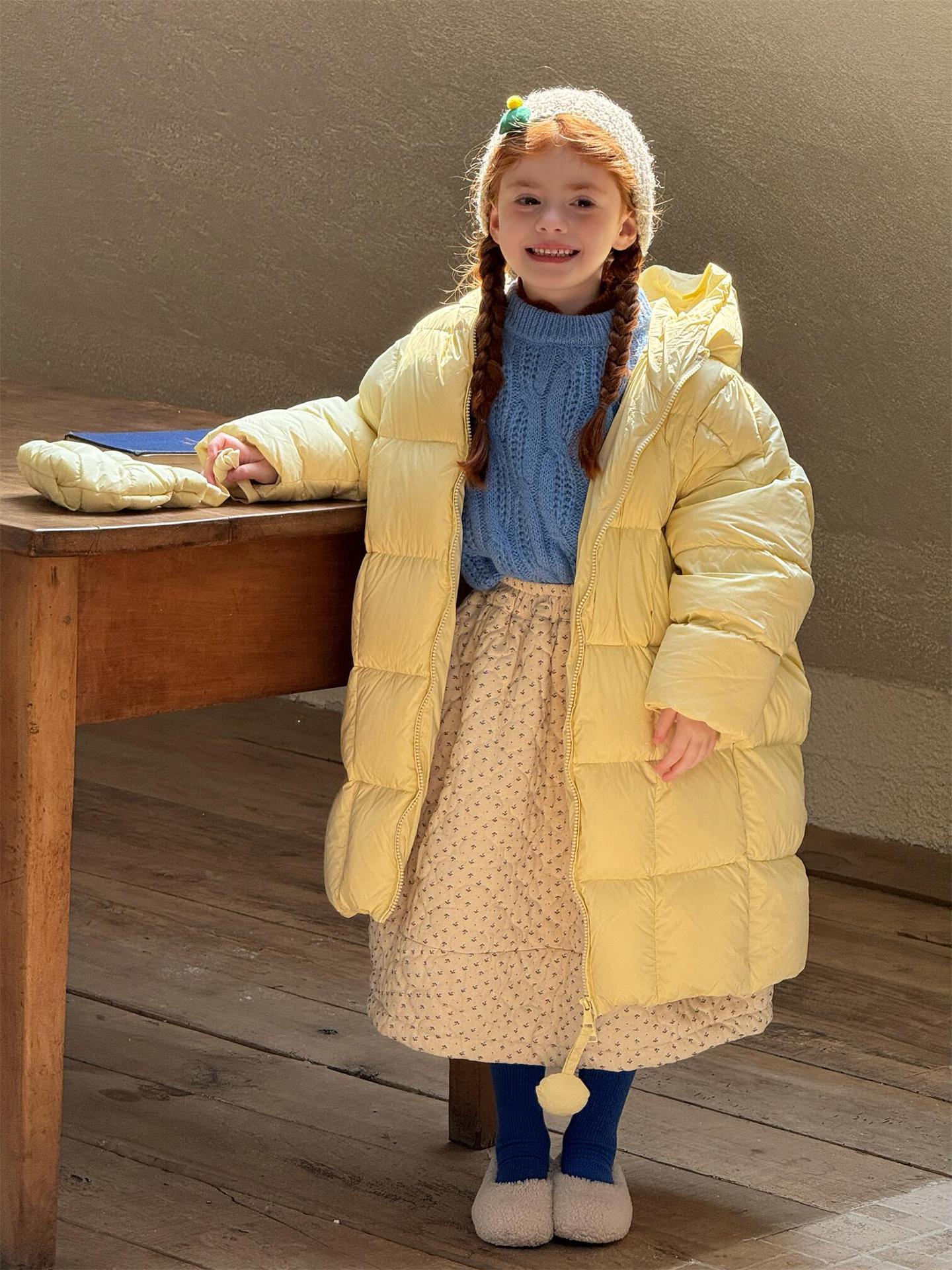 膝まで届くロング丈で、全身を暖かく包み込むダウンコートです。中わたには90%ダウンを使用し、さらにデュポン社の三防(撥水・防汚・防風)加工を施しており、機能性と保温性を兼ね備えたバッファーロングジャケットです。寒い冬のお出かけに頼れる一着で、暖かさを逃さないデザインが特徴。真冬の寒さからお子様を守る、頼もしい子ども服のアウターです。
