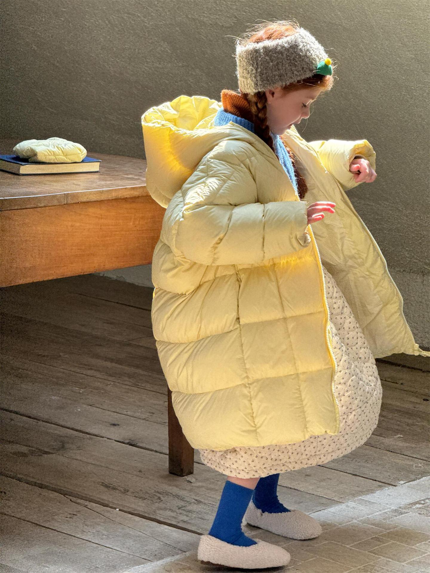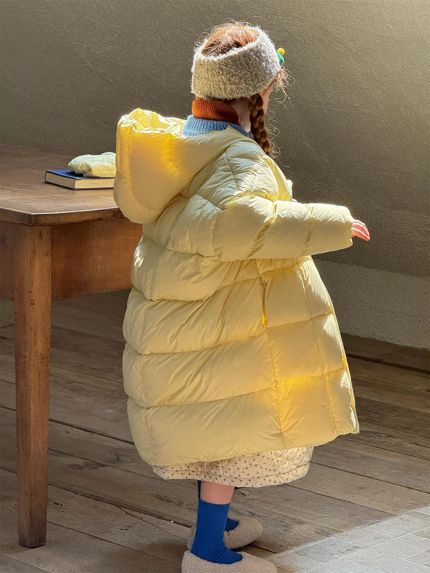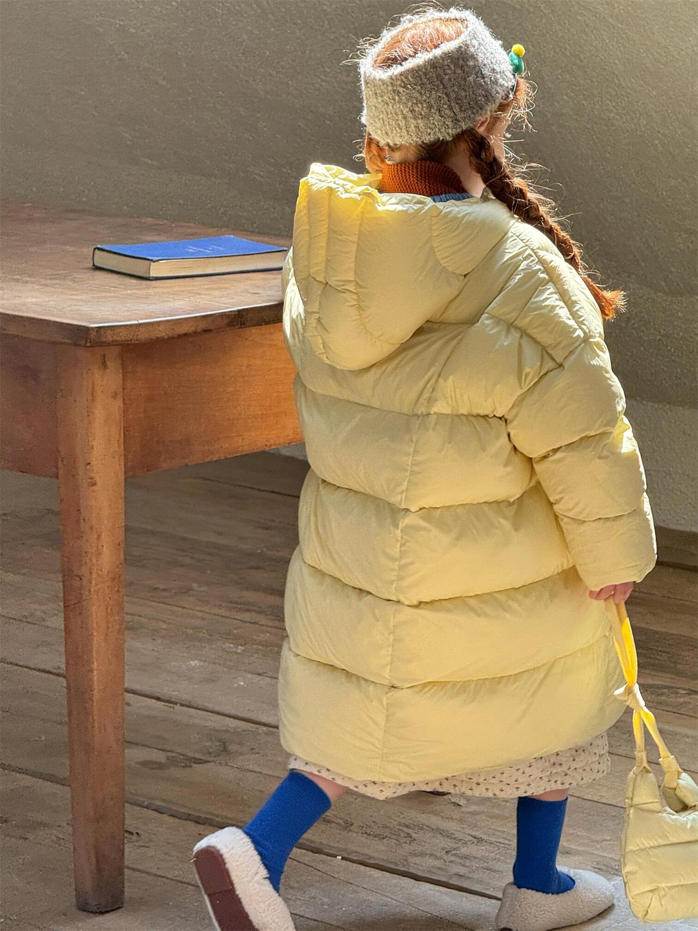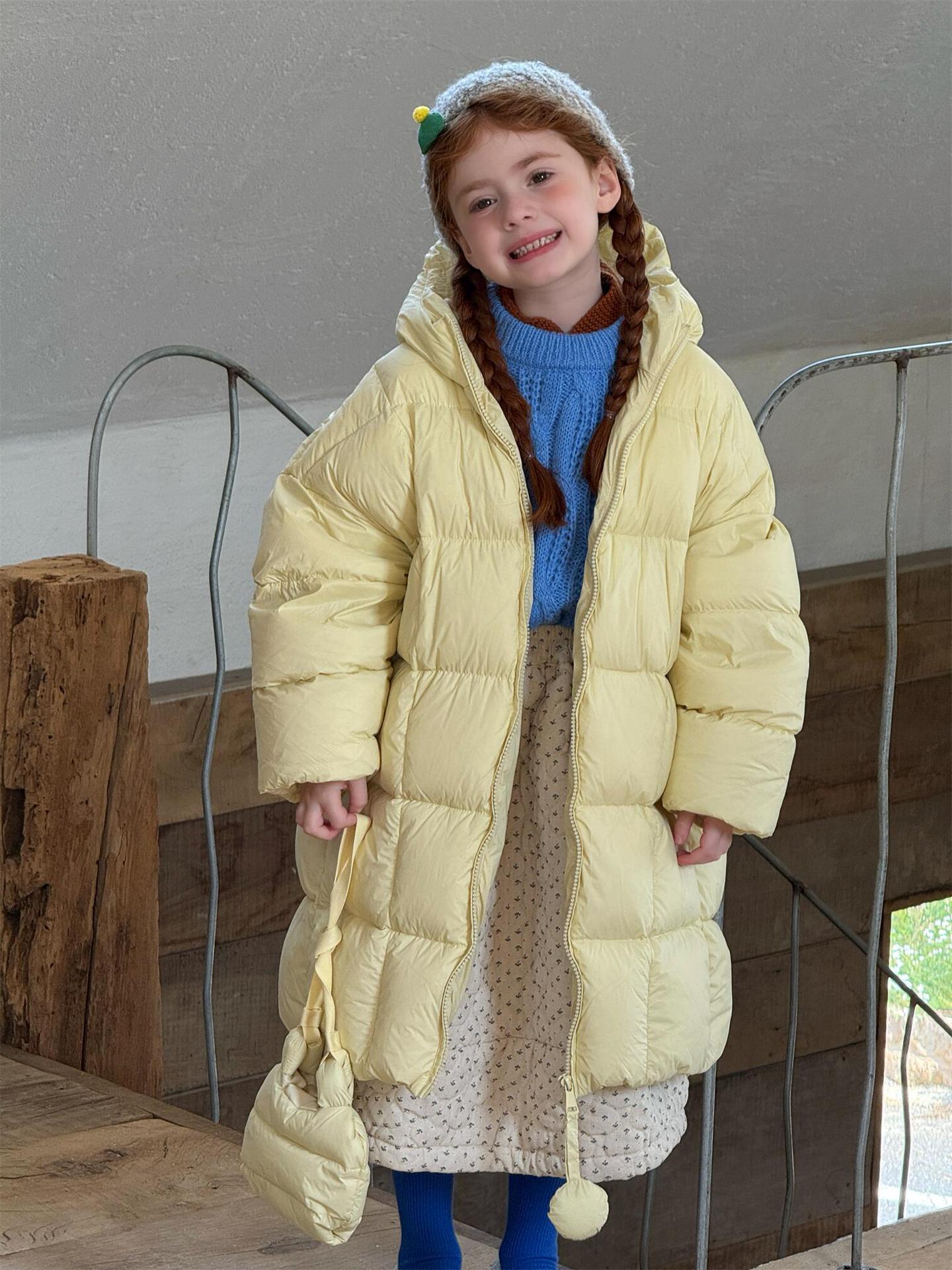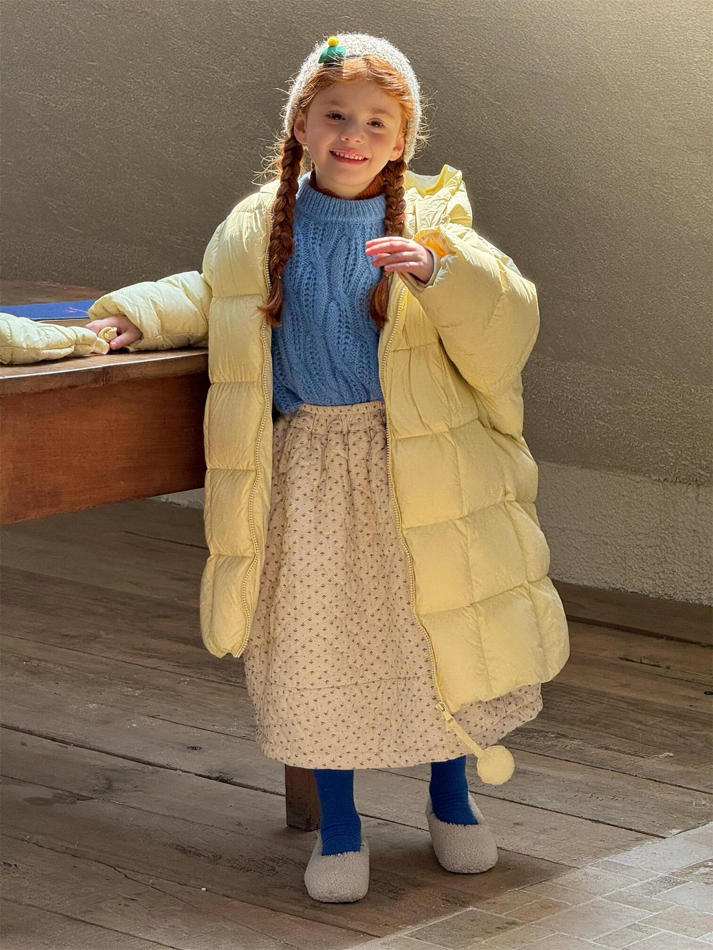 膝まで届くロング丈で、全身を暖かく包み込むダウンコートです。中わたには90%ダウンを使用し、さらにデュポン社の三防(撥水・防汚・防風)加工を施しており、機能性と保温性を兼ね備えたバッファーロングジャケットです。寒い冬のお出かけに頼れる一着で、暖かさを逃さないデザインが特徴。真冬の寒さからお子様を守る、頼もしい子ども服のアウターです。