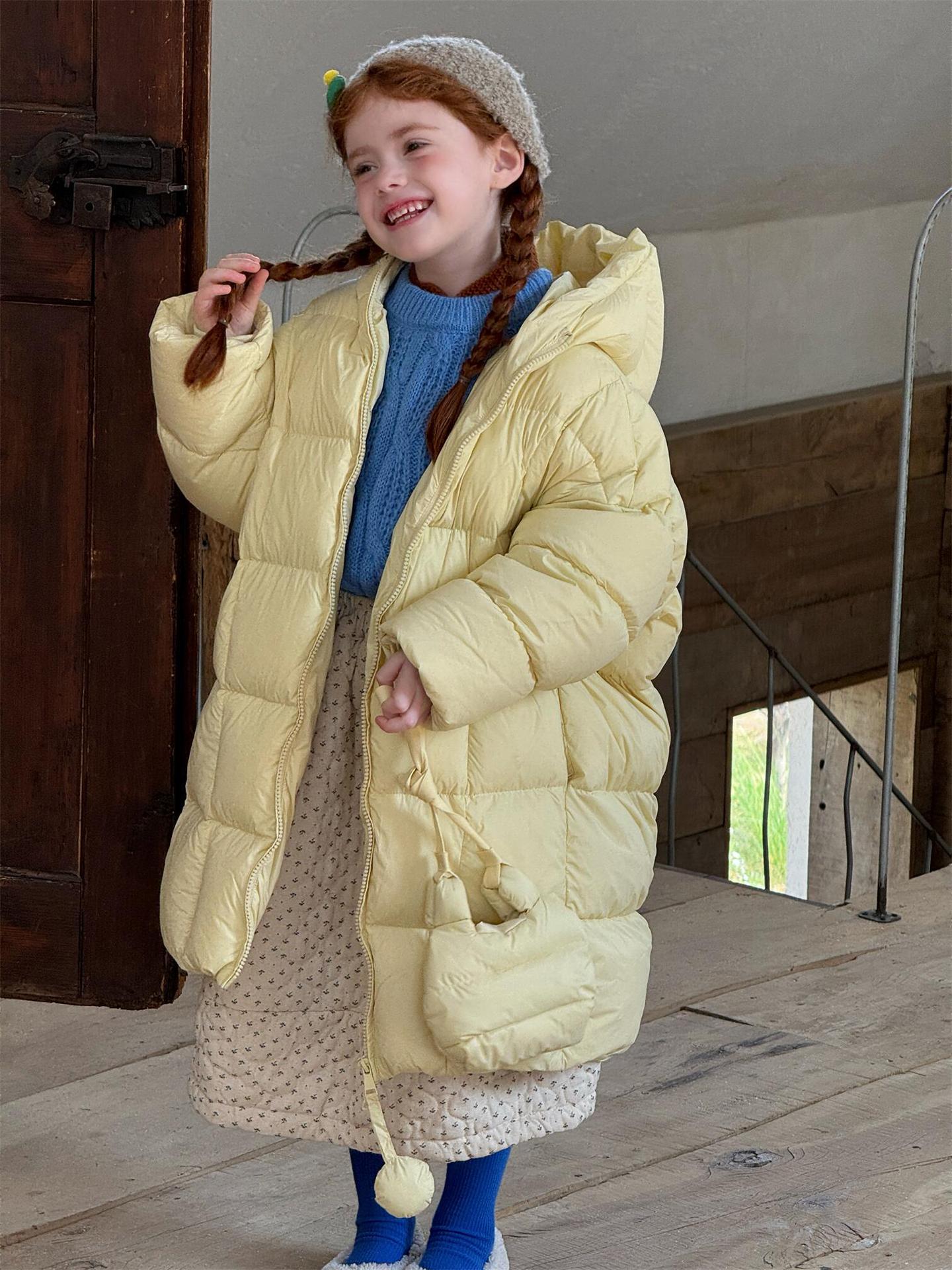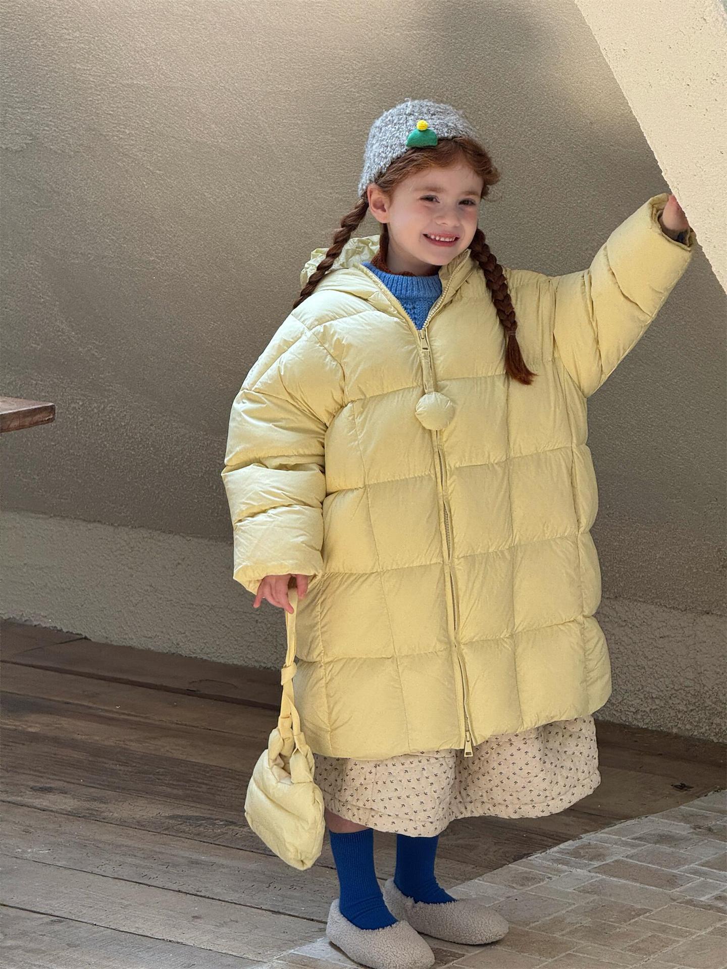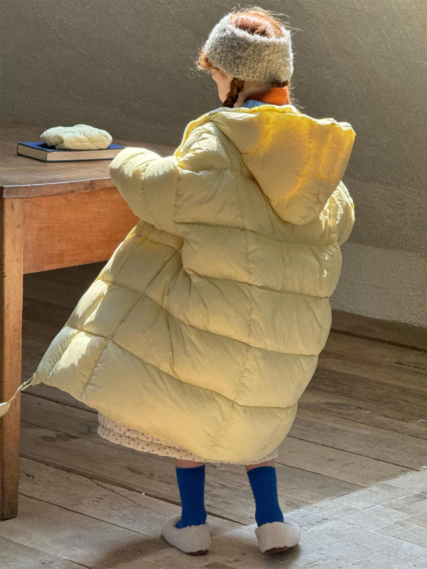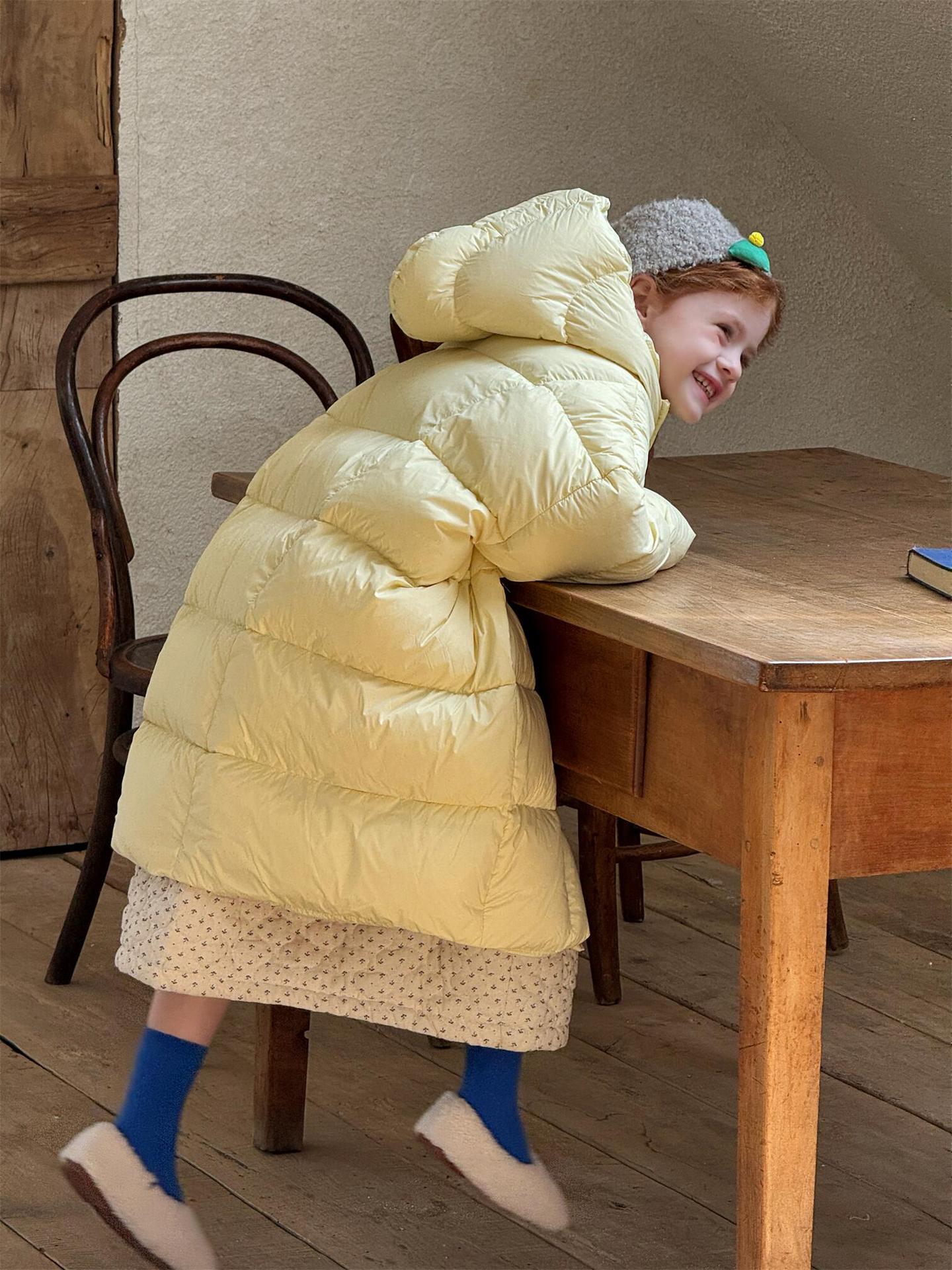 膝まで届くロング丈で、全身を暖かく包み込むダウンコートです。中わたには90%ダウンを使用し、さらにデュポン社の三防(撥水・防汚・防風)加工を施しており、機能性と保温性を兼ね備えたバッファーロングジャケットです。寒い冬のお出かけに頼れる一着で、暖かさを逃さないデザインが特徴。真冬の寒さからお子様を守る、頼もしい子ども服のアウターです。