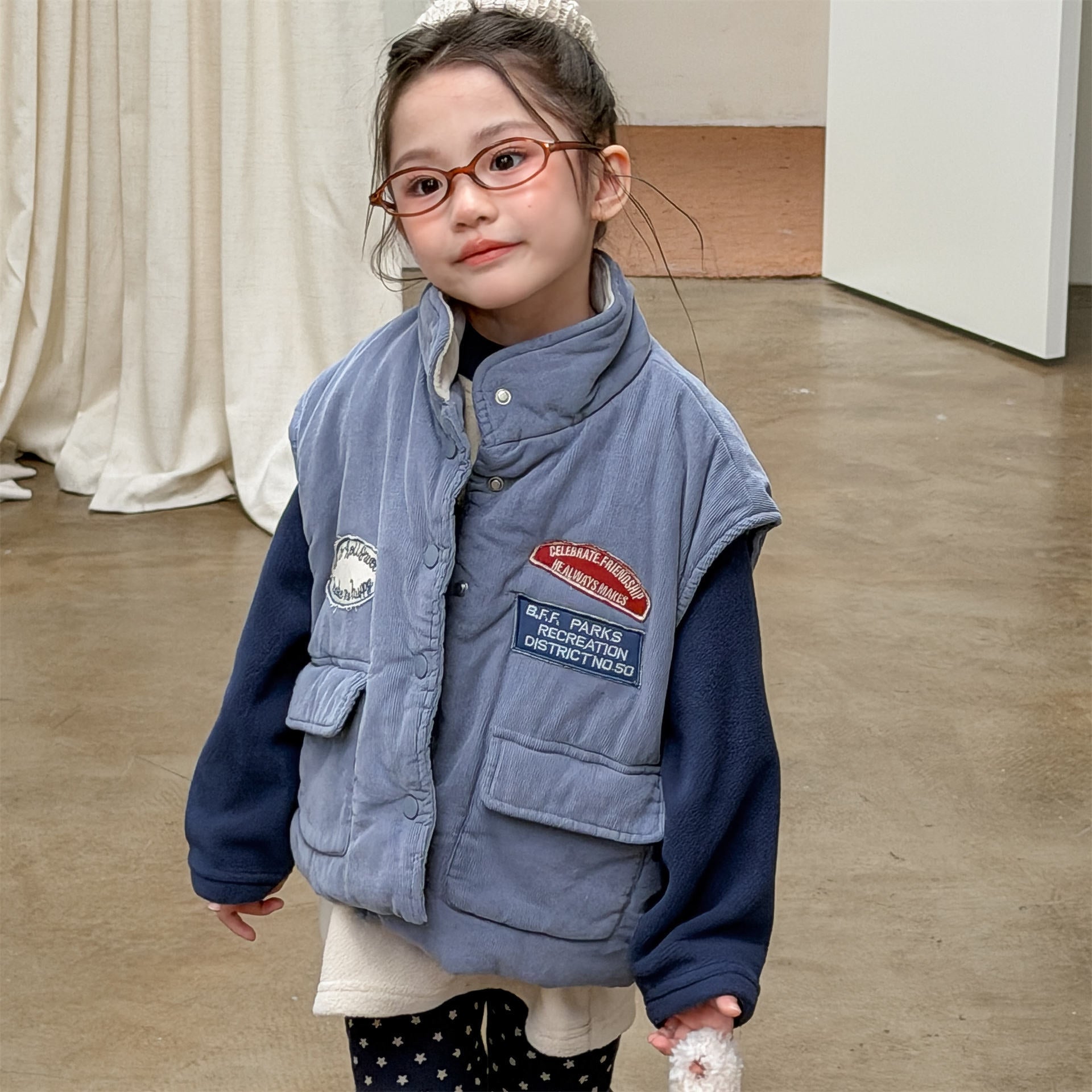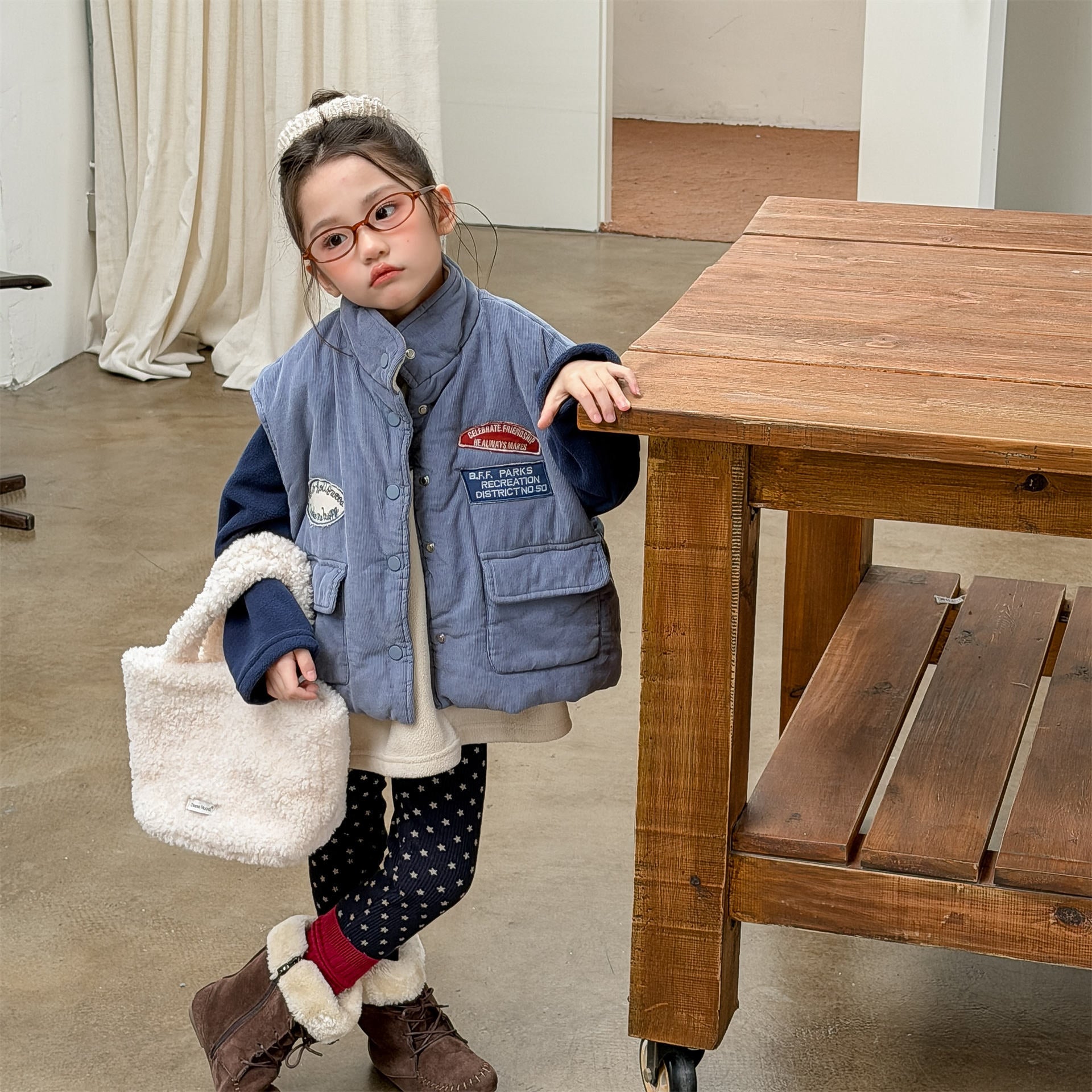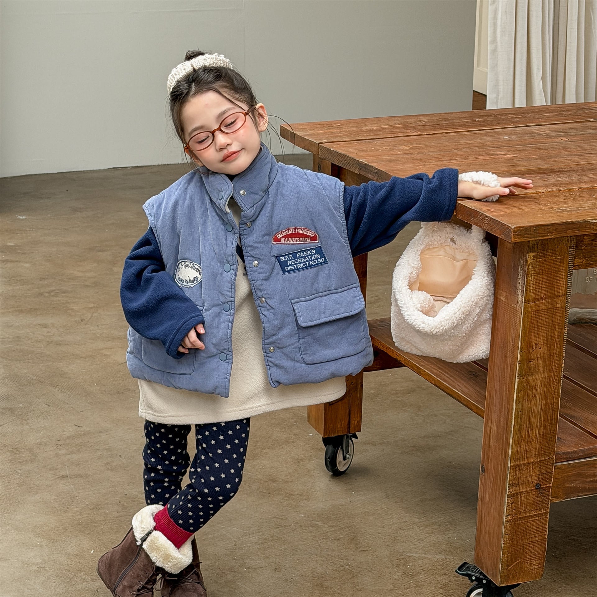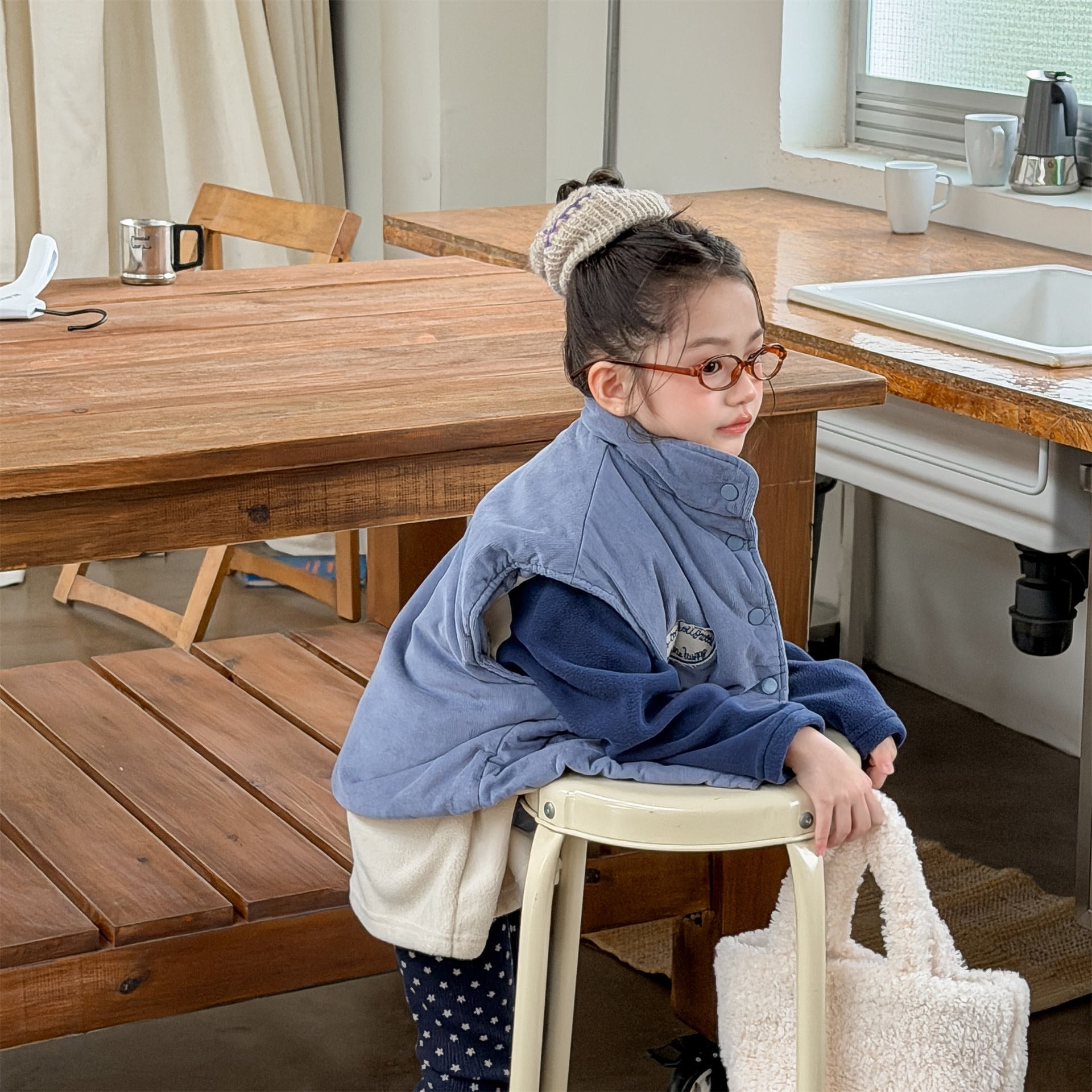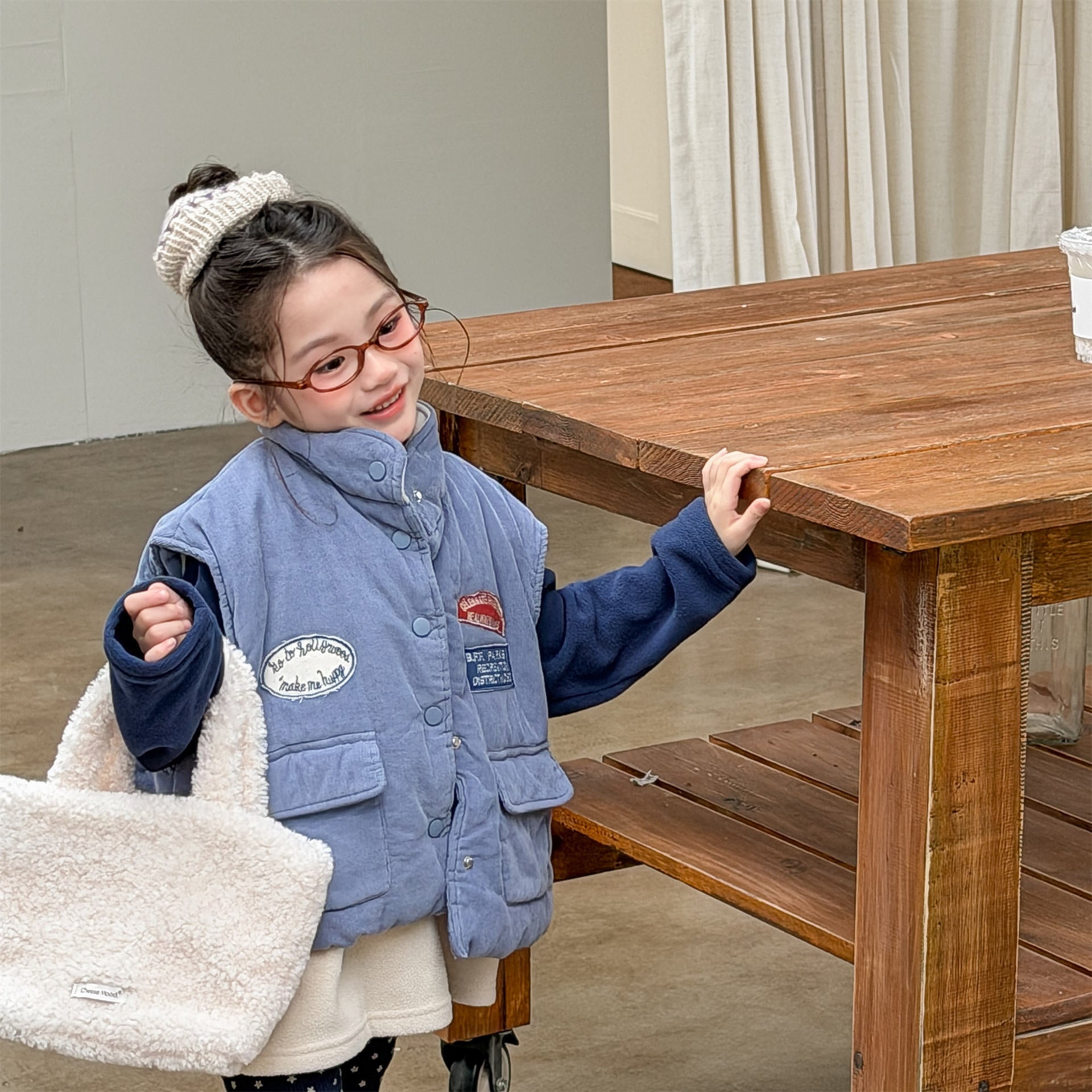 マットな質感の表地に、保温性に優れた中綿と柔らかな裏フリースを組み合わせた、機能的なフィッシャーマン風ベストです。首元までしっかりとカバーする立ち襟のデザインが冬の冷たい風を防ぎ、ボリュームのある中綿が体温を逃さずにお子様を暖かく包み込みます。性別を問わず着用できるユニセックスなシルエットと、現代的なエッセンスを加えた洗練されたデザインが特徴で、セーターやスウェットの上に重ねるだけで、動きやすさと防寒性を両立した冬のレイヤードスタイルが完成する汎用性の高いアウターウェアです。
