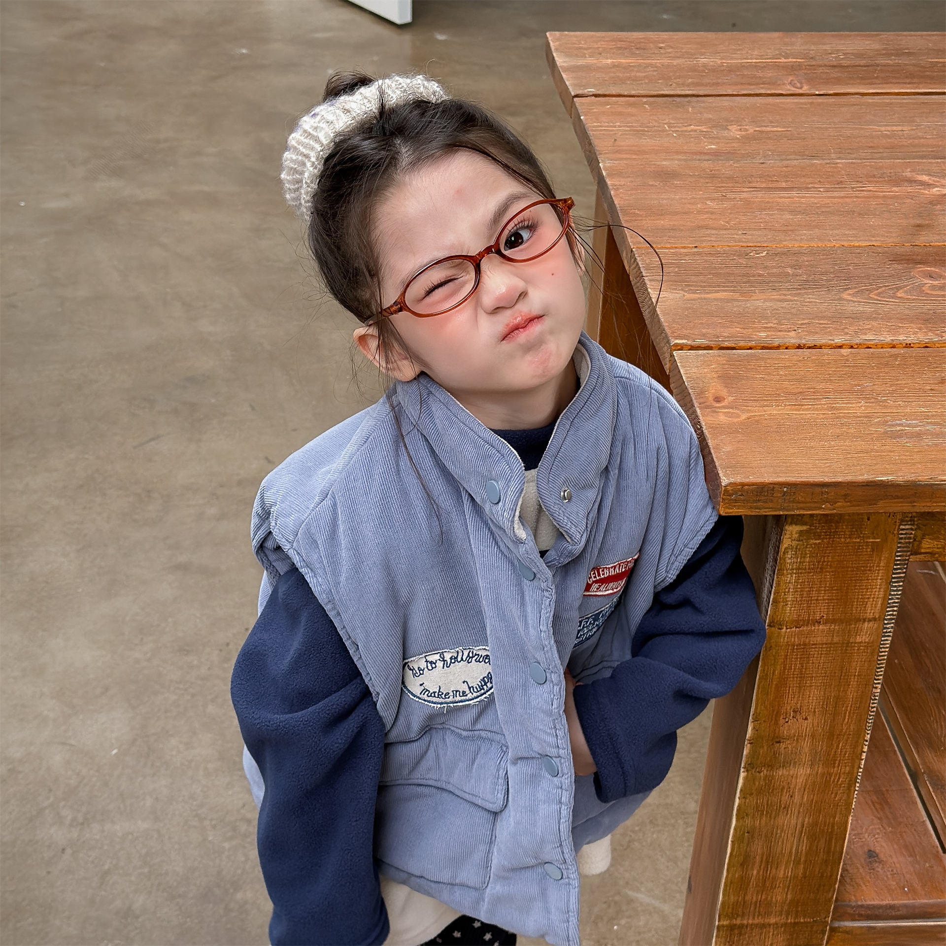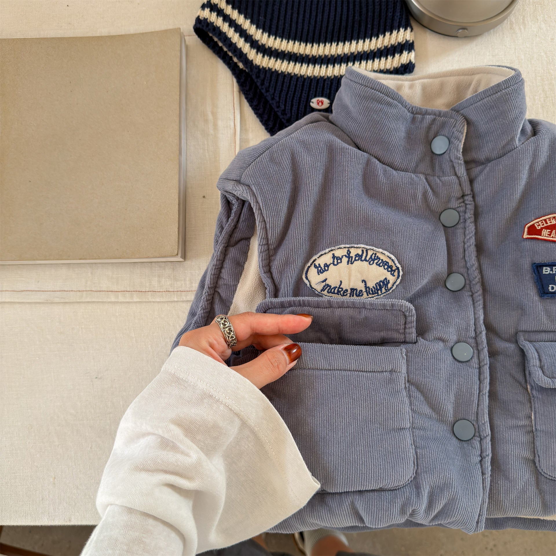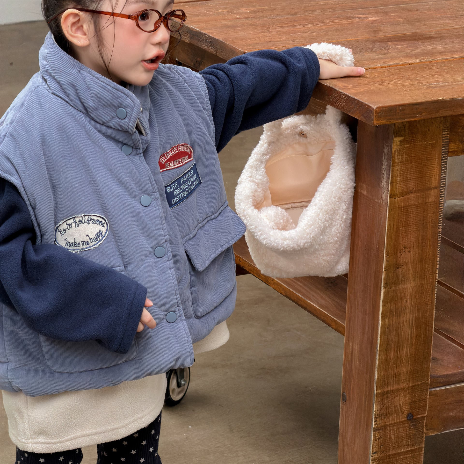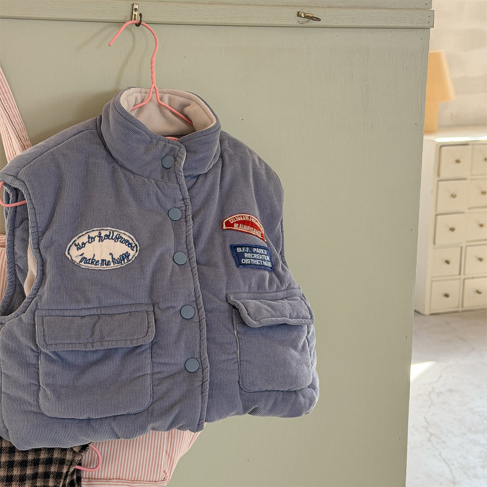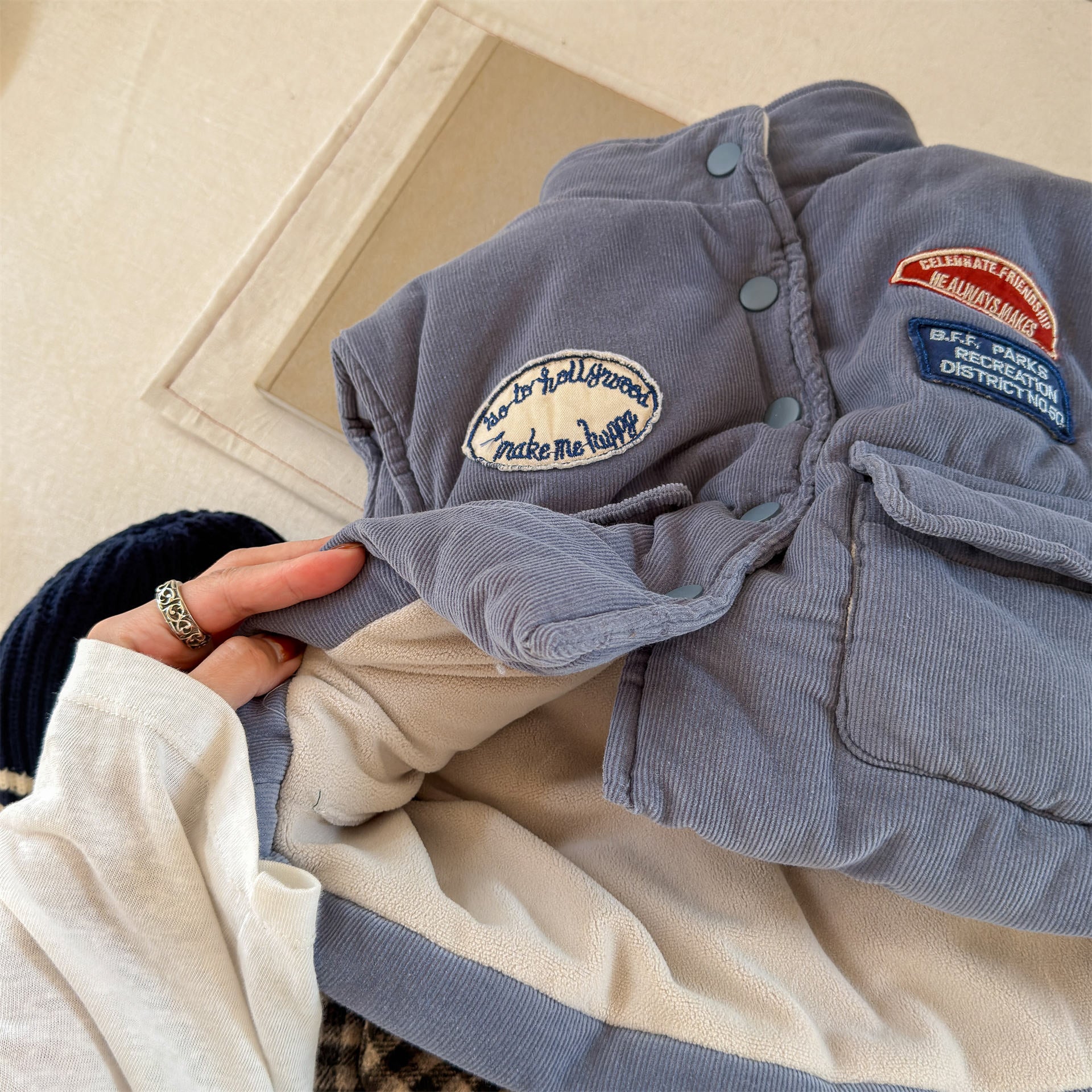 マットな質感の表地に、保温性に優れた中綿と柔らかな裏フリースを組み合わせた、機能的なフィッシャーマン風ベストです。首元までしっかりとカバーする立ち襟のデザインが冬の冷たい風を防ぎ、ボリュームのある中綿が体温を逃さずにお子様を暖かく包み込みます。性別を問わず着用できるユニセックスなシルエットと、現代的なエッセンスを加えた洗練されたデザインが特徴で、セーターやスウェットの上に重ねるだけで、動きやすさと防寒性を両立した冬のレイヤードスタイルが完成する汎用性の高いアウターウェアです。