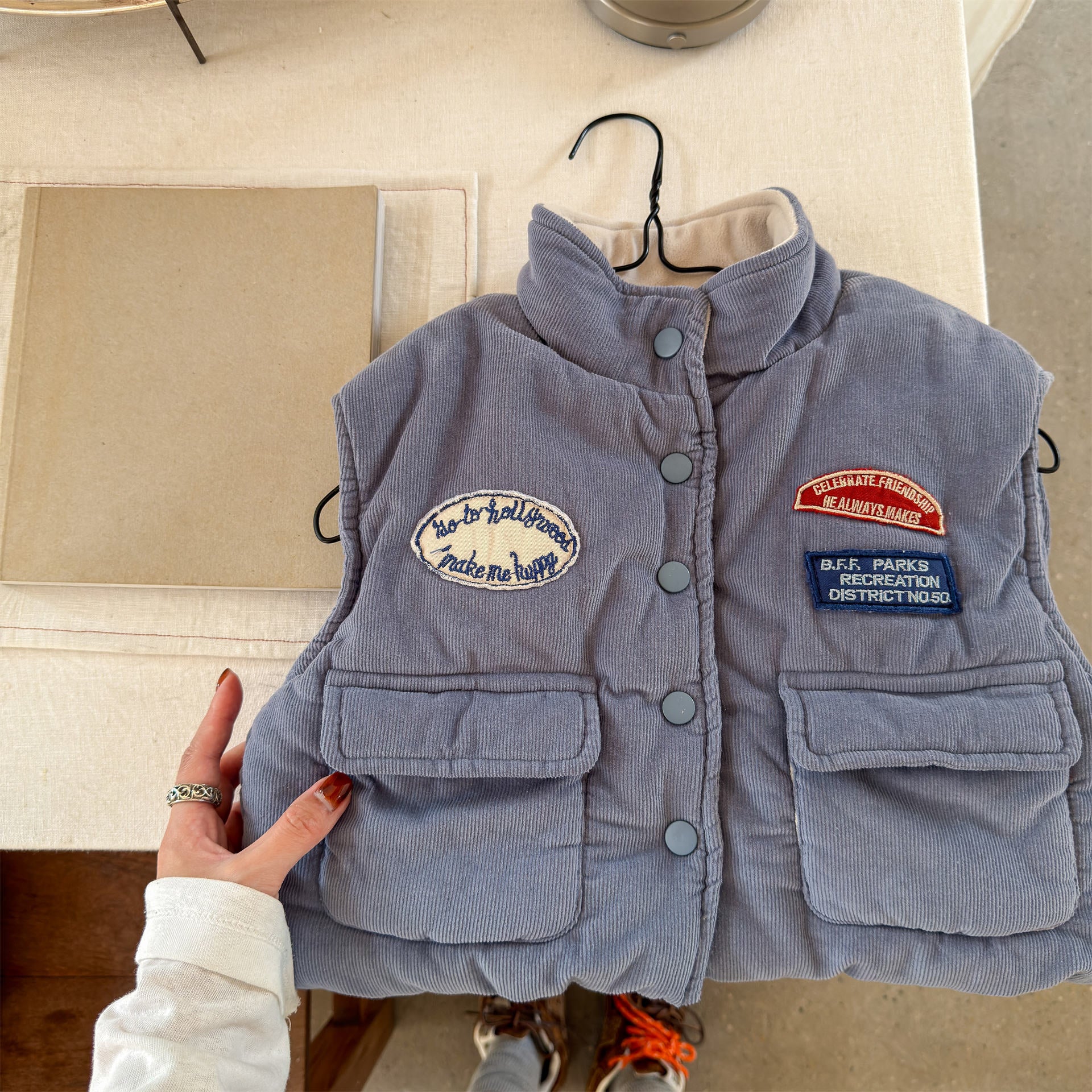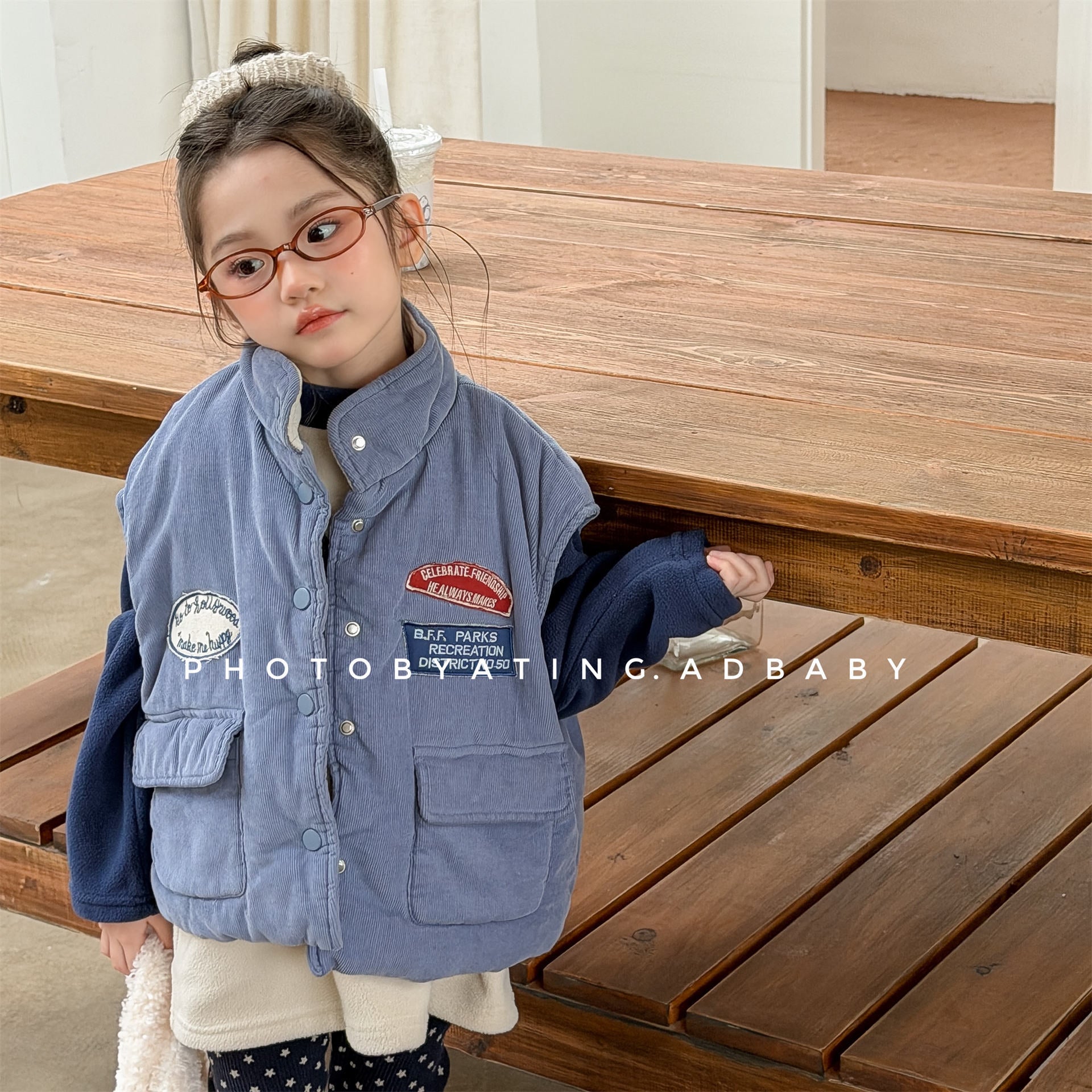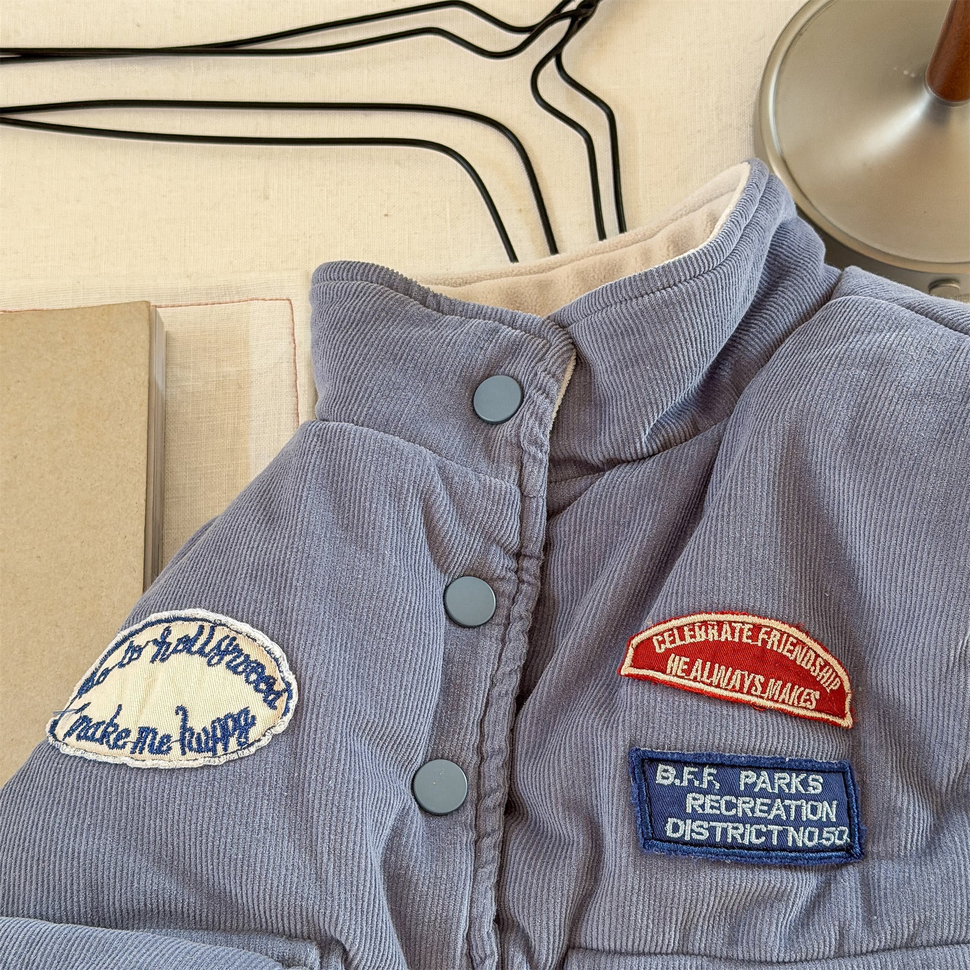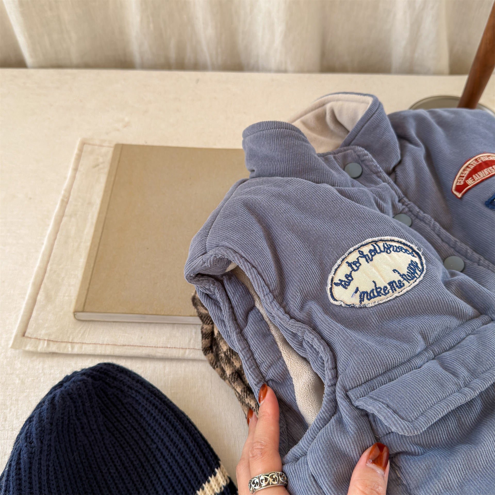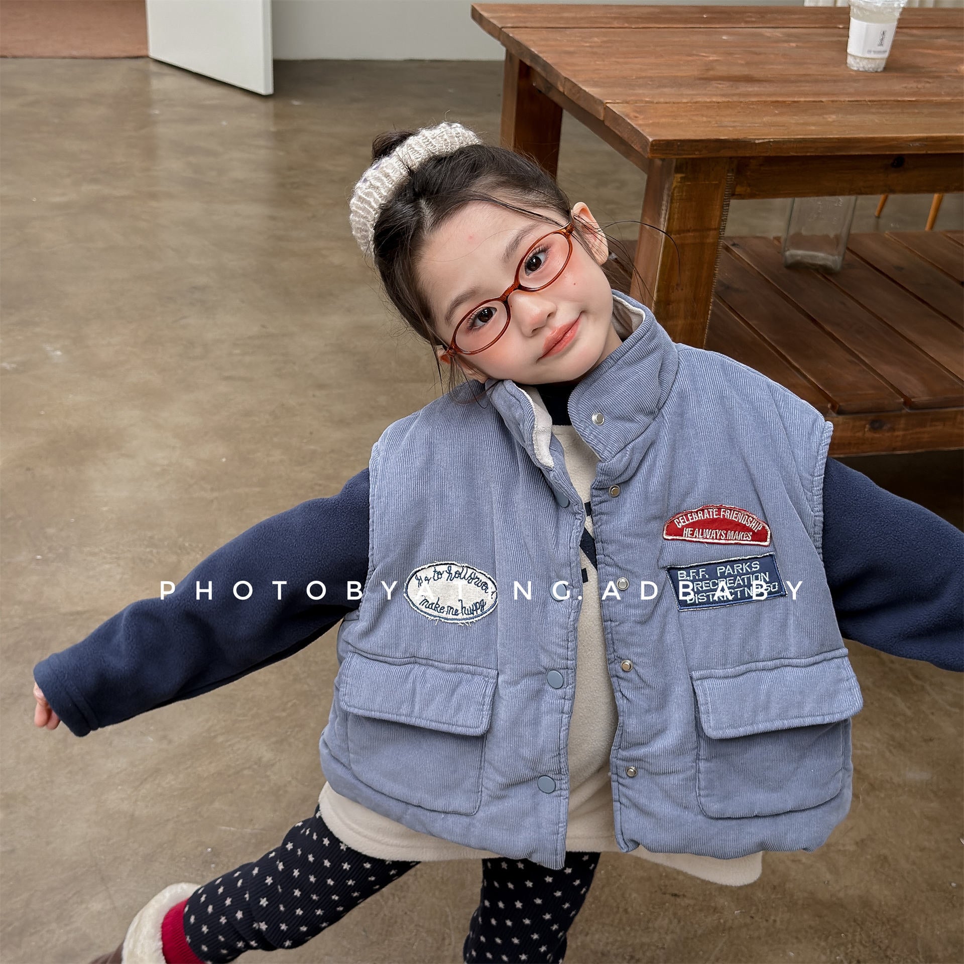 マットな質感の表地に、保温性に優れた中綿と柔らかな裏フリースを組み合わせた、機能的なフィッシャーマン風ベストです。首元までしっかりとカバーする立ち襟のデザインが冬の冷たい風を防ぎ、ボリュームのある中綿が体温を逃さずにお子様を暖かく包み込みます。性別を問わず着用できるユニセックスなシルエットと、現代的なエッセンスを加えた洗練されたデザインが特徴で、セーターやスウェットの上に重ねるだけで、動きやすさと防寒性を両立した冬のレイヤードスタイルが完成する汎用性の高いアウターウェアです。