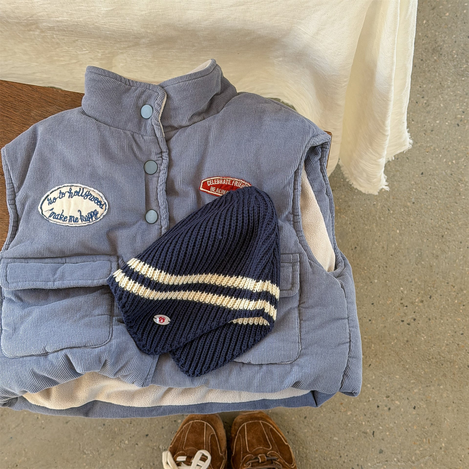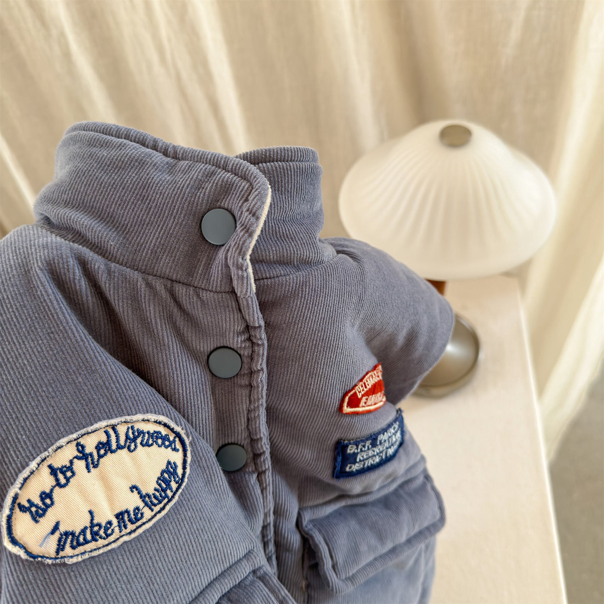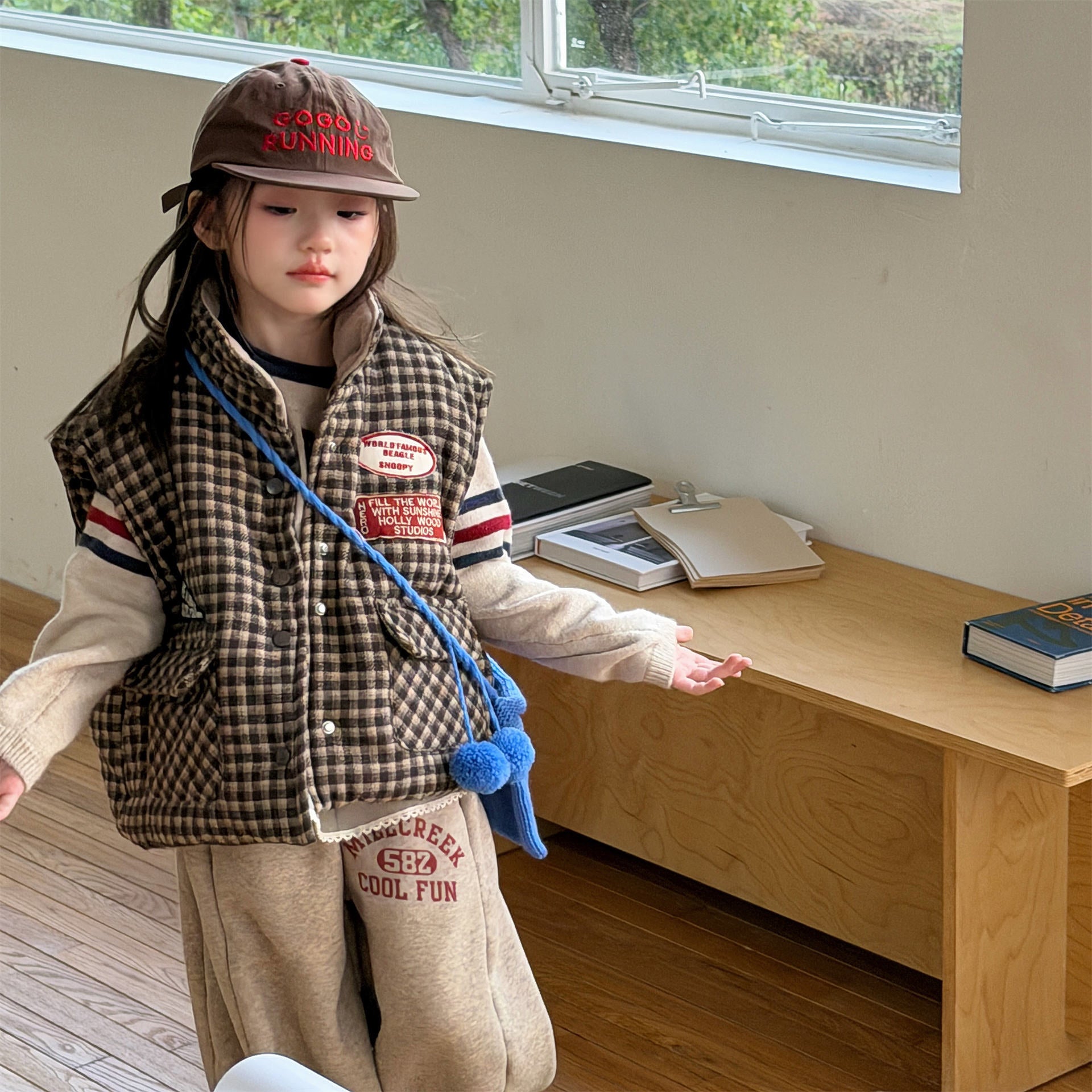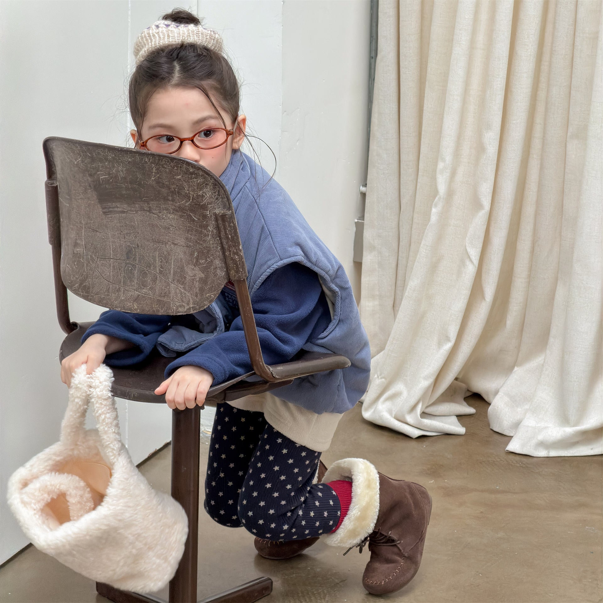 マットな質感の表地に、保温性に優れた中綿と柔らかな裏フリースを組み合わせた、機能的なフィッシャーマン風ベストです。首元までしっかりとカバーする立ち襟のデザインが冬の冷たい風を防ぎ、ボリュームのある中綿が体温を逃さずにお子様を暖かく包み込みます。性別を問わず着用できるユニセックスなシルエットと、現代的なエッセンスを加えた洗練されたデザインが特徴で、セーターやスウェットの上に重ねるだけで、動きやすさと防寒性を両立した冬のレイヤードスタイルが完成する汎用性の高いアウターウェアです。