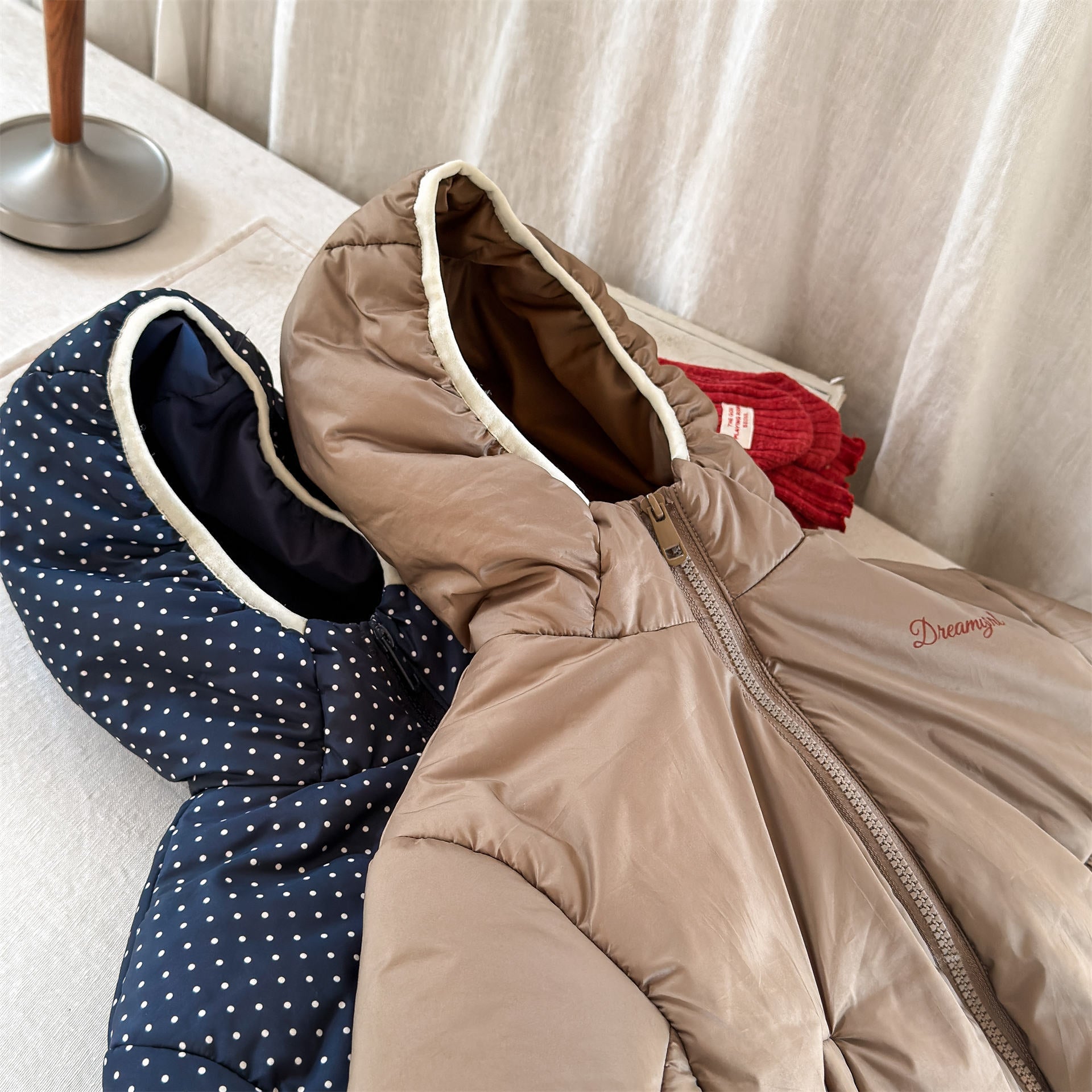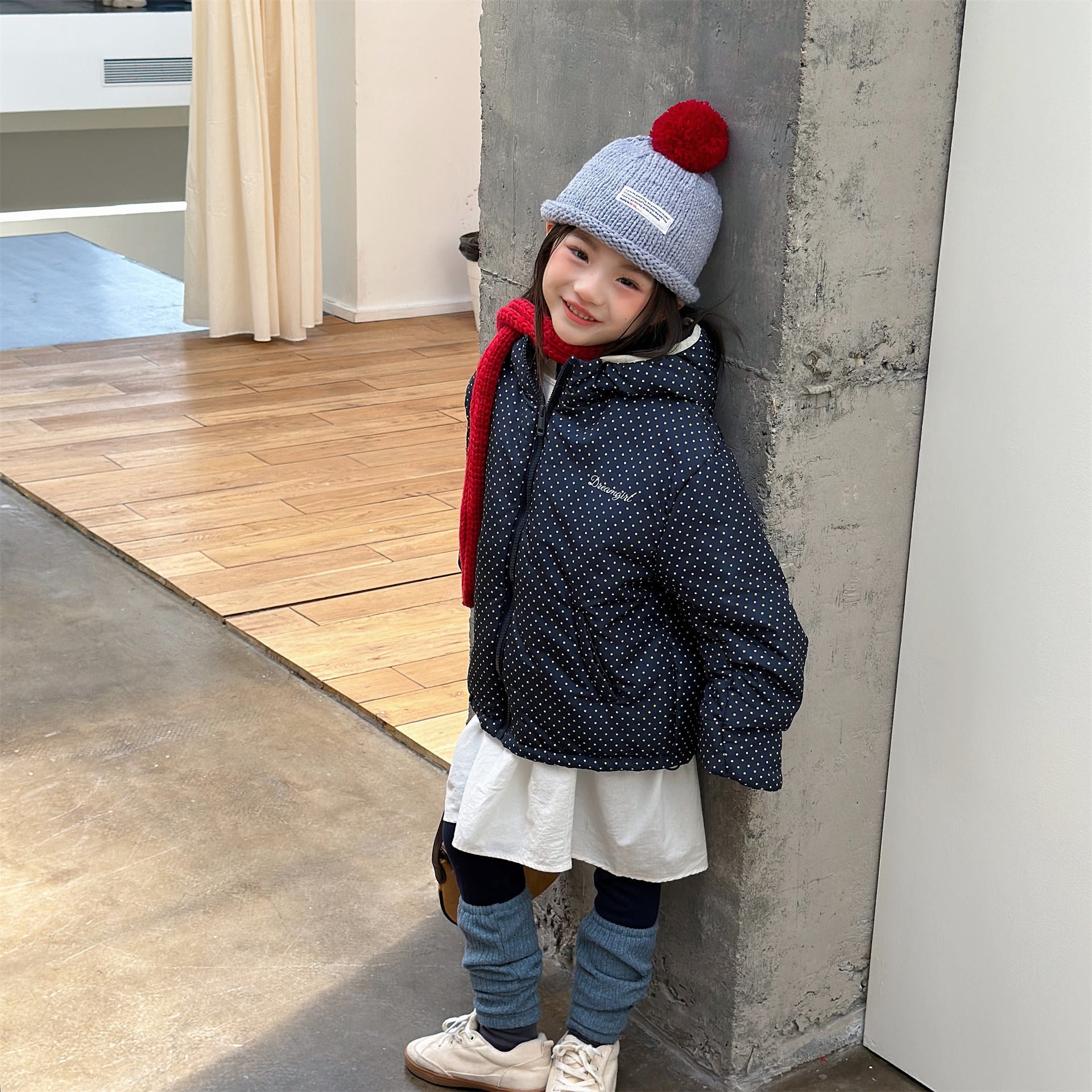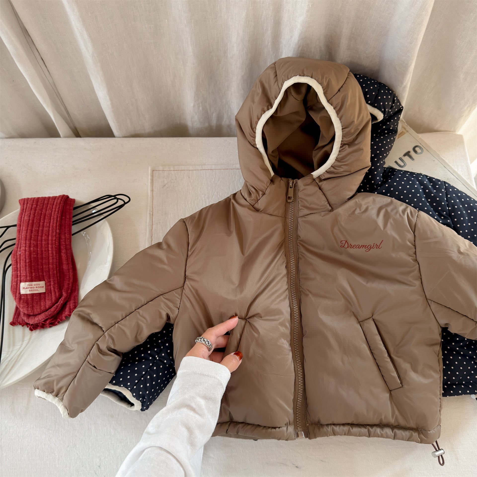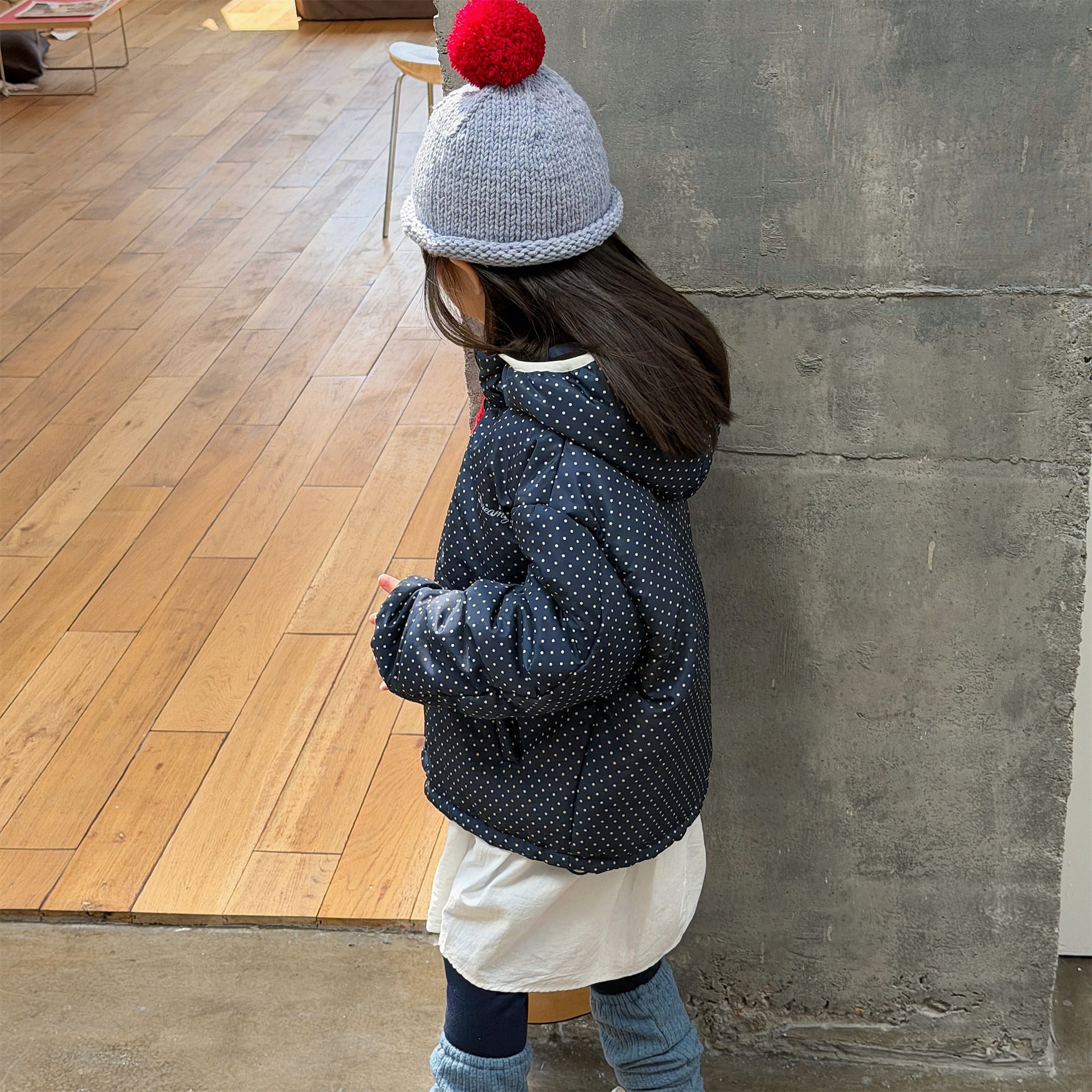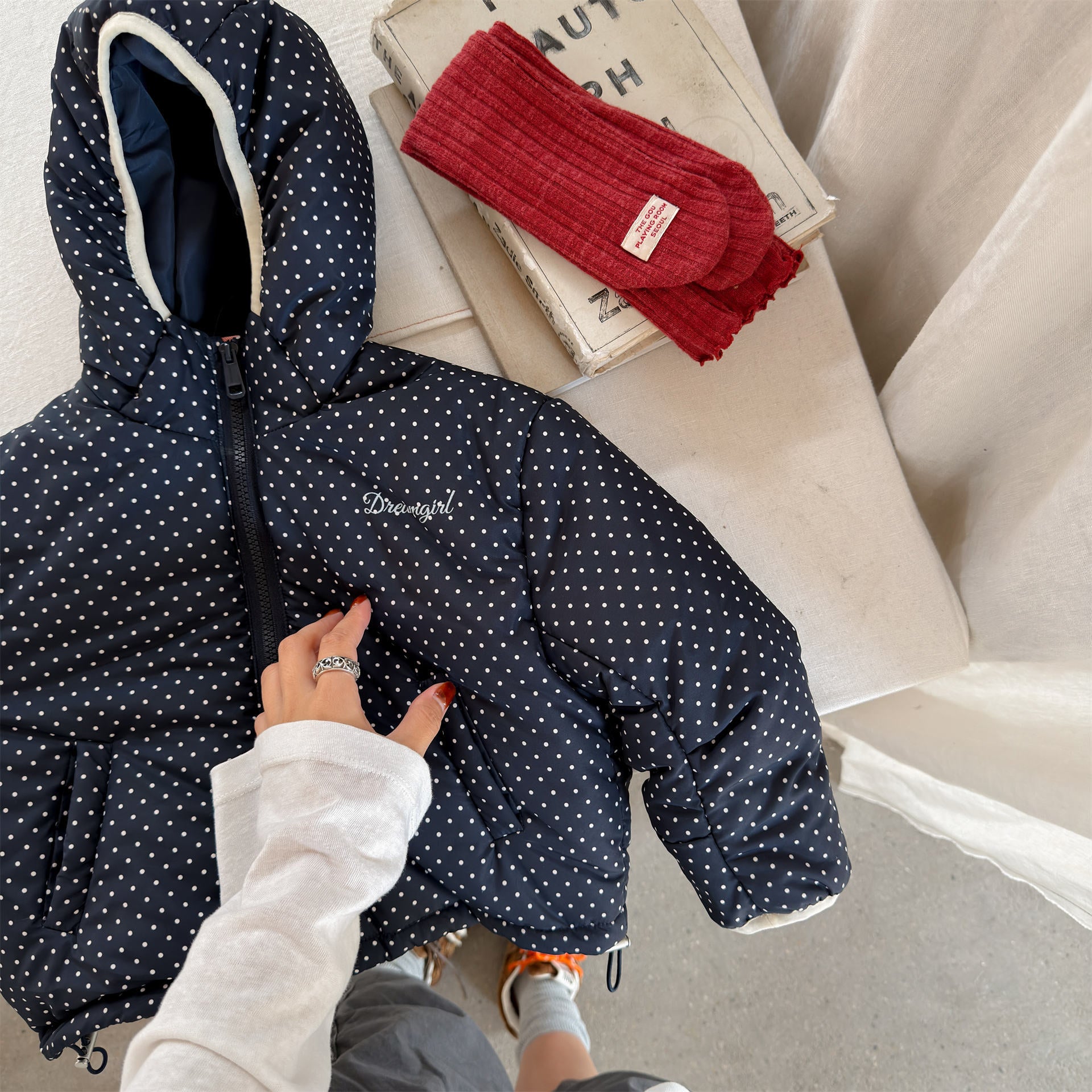 ふっくらとしたボリューム感のあるシルエットが魅力的な、中綿入りのフード付きブルゾンジャケットです。無地のシンプルで洗練されたスタイルと、可愛らしいドット柄のバリエーションを展開しており、どちらも高い保温性を持つ中綿が冬の冷気からお子様をしっかりと守ります。トレンドの韓国スタイルを反映した「パン服」のような愛らしいフォルムは、男の子にも女の子にも似合うユニセックスなデザインで、通学や公園遊び、冬のお出かけまで幅広いシーンで活躍する、軽くて暖かな機能的アウターです。