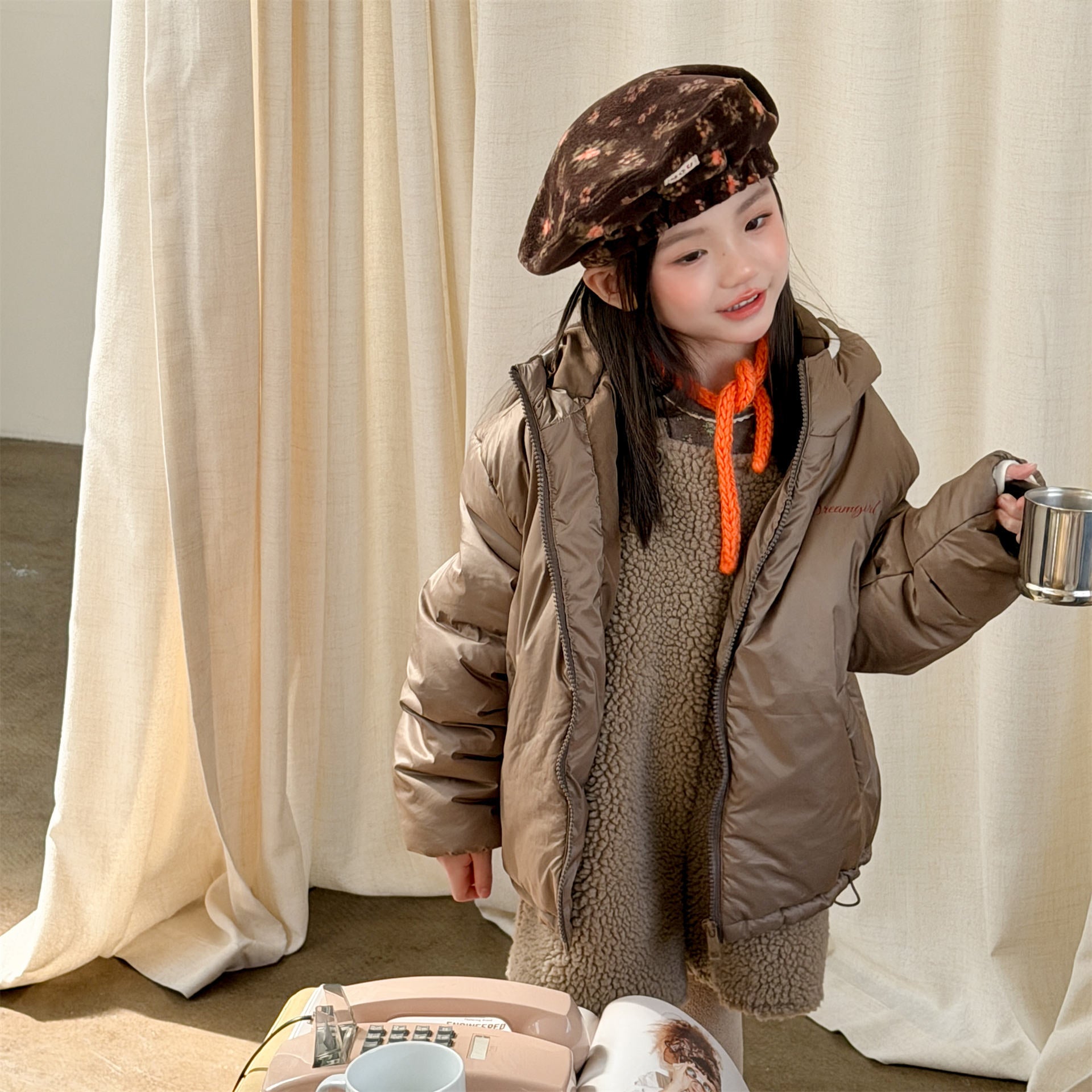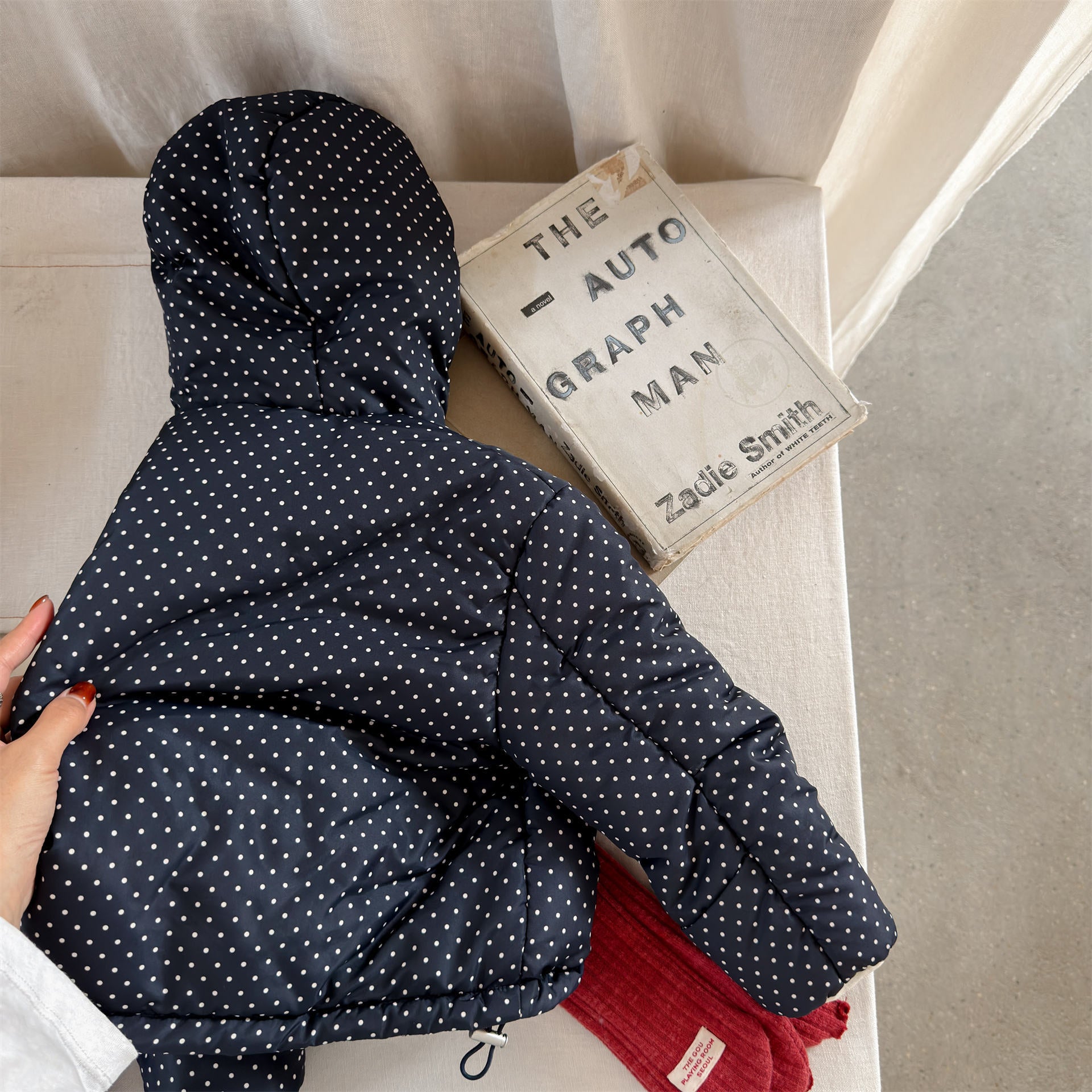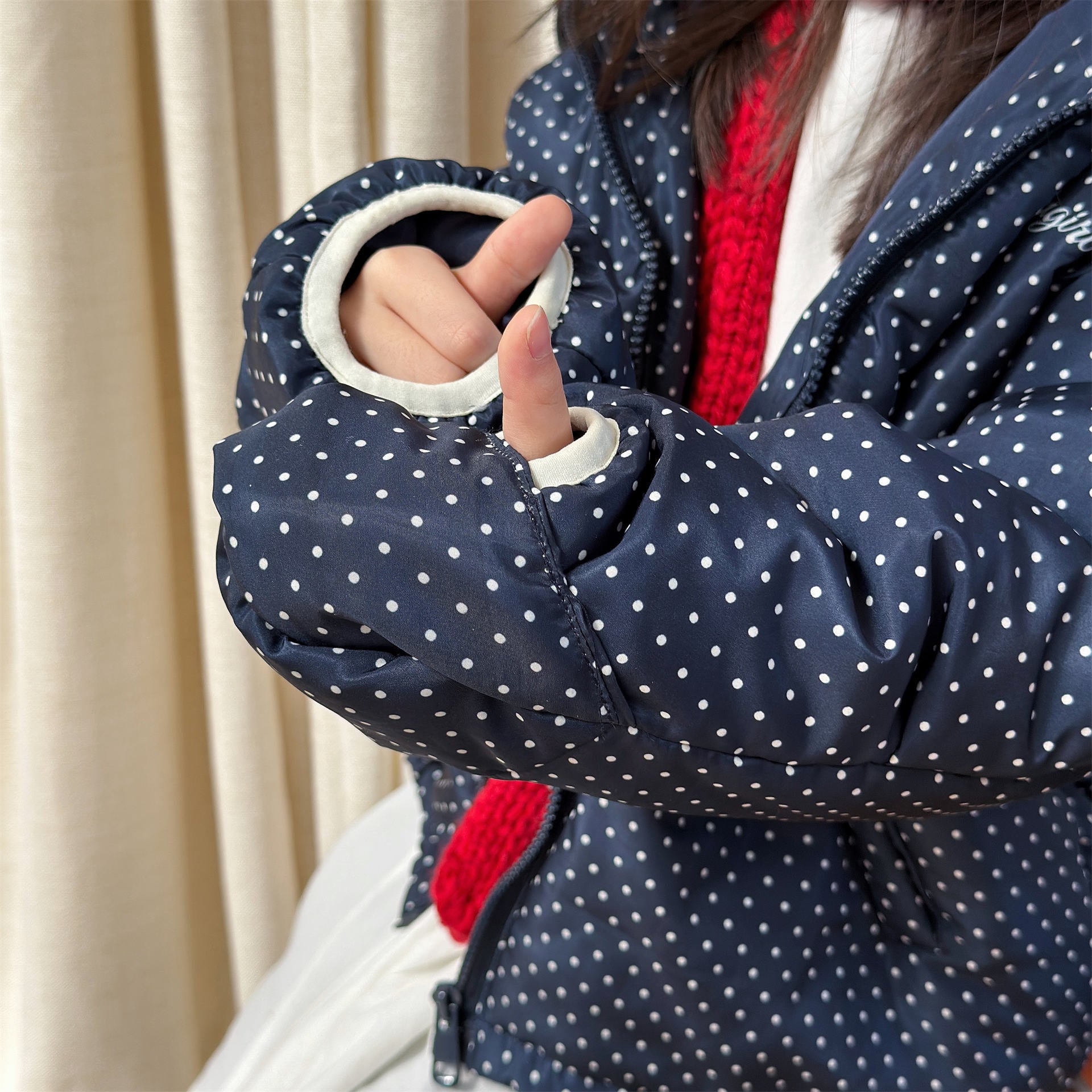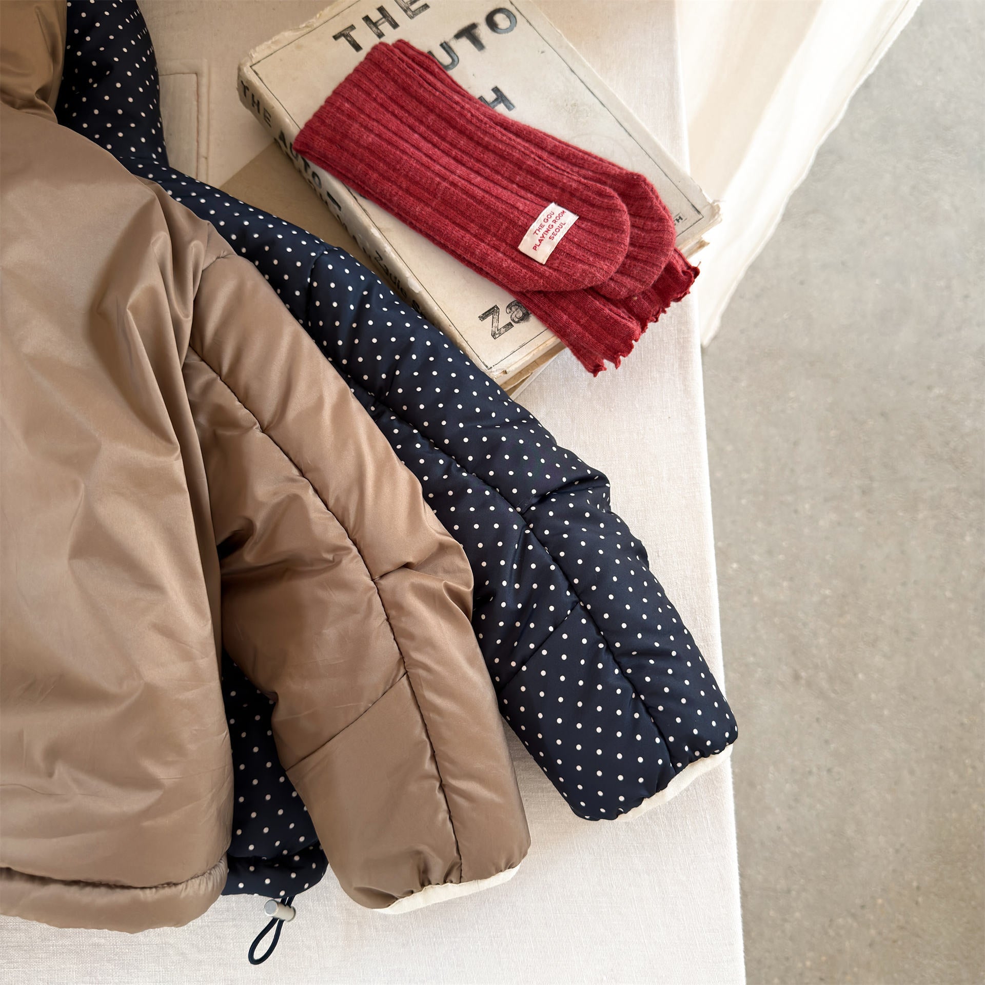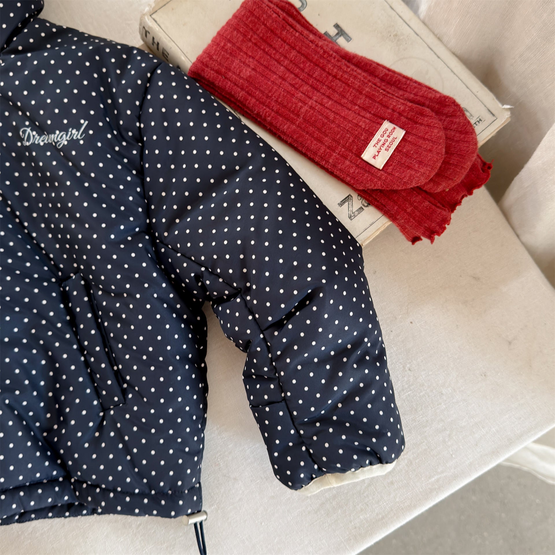 ふっくらとしたボリューム感のあるシルエットが魅力的な、中綿入りのフード付きブルゾンジャケットです。無地のシンプルで洗練されたスタイルと、可愛らしいドット柄のバリエーションを展開しており、どちらも高い保温性を持つ中綿が冬の冷気からお子様をしっかりと守ります。トレンドの韓国スタイルを反映した「パン服」のような愛らしいフォルムは、男の子にも女の子にも似合うユニセックスなデザインで、通学や公園遊び、冬のお出かけまで幅広いシーンで活躍する、軽くて暖かな機能的アウターです。