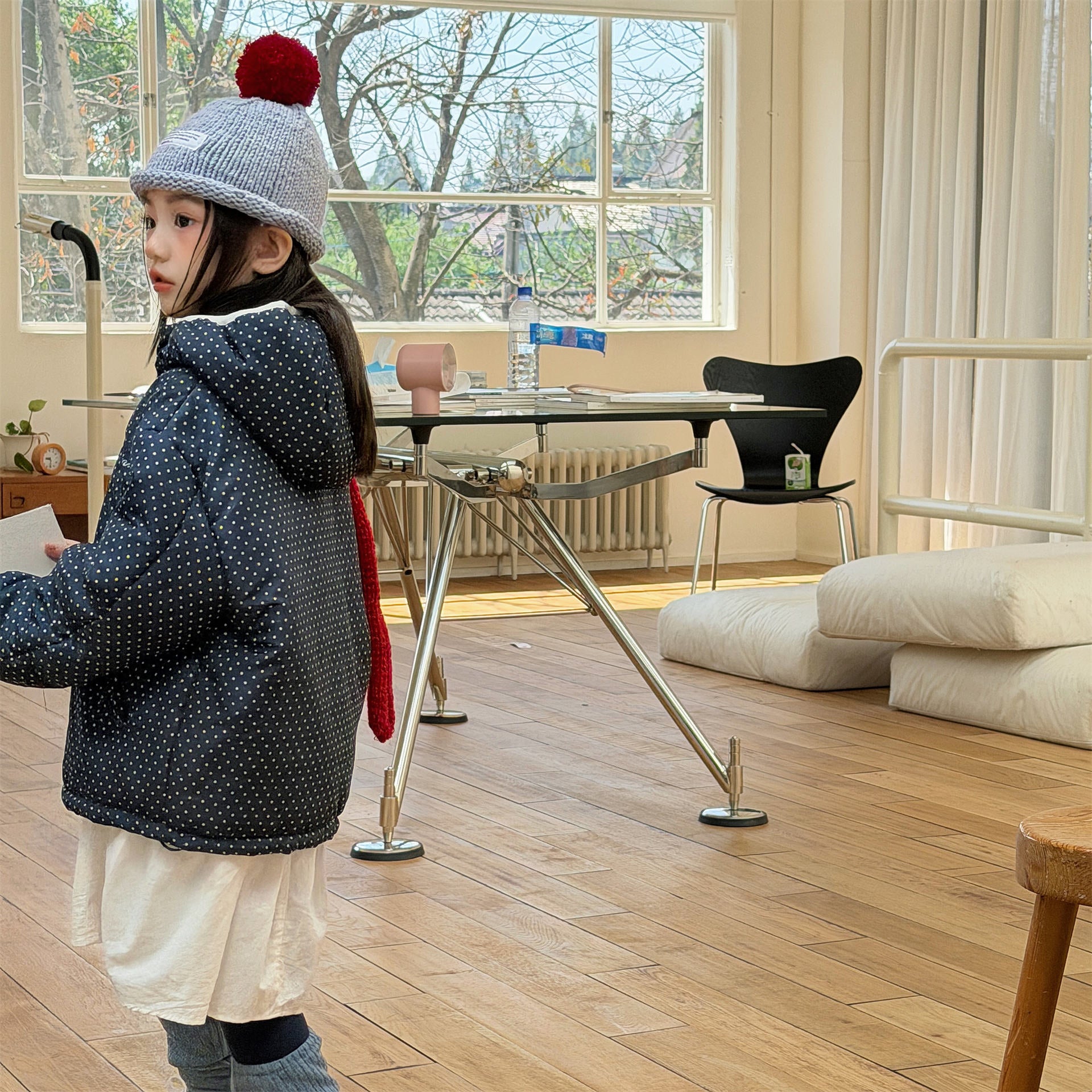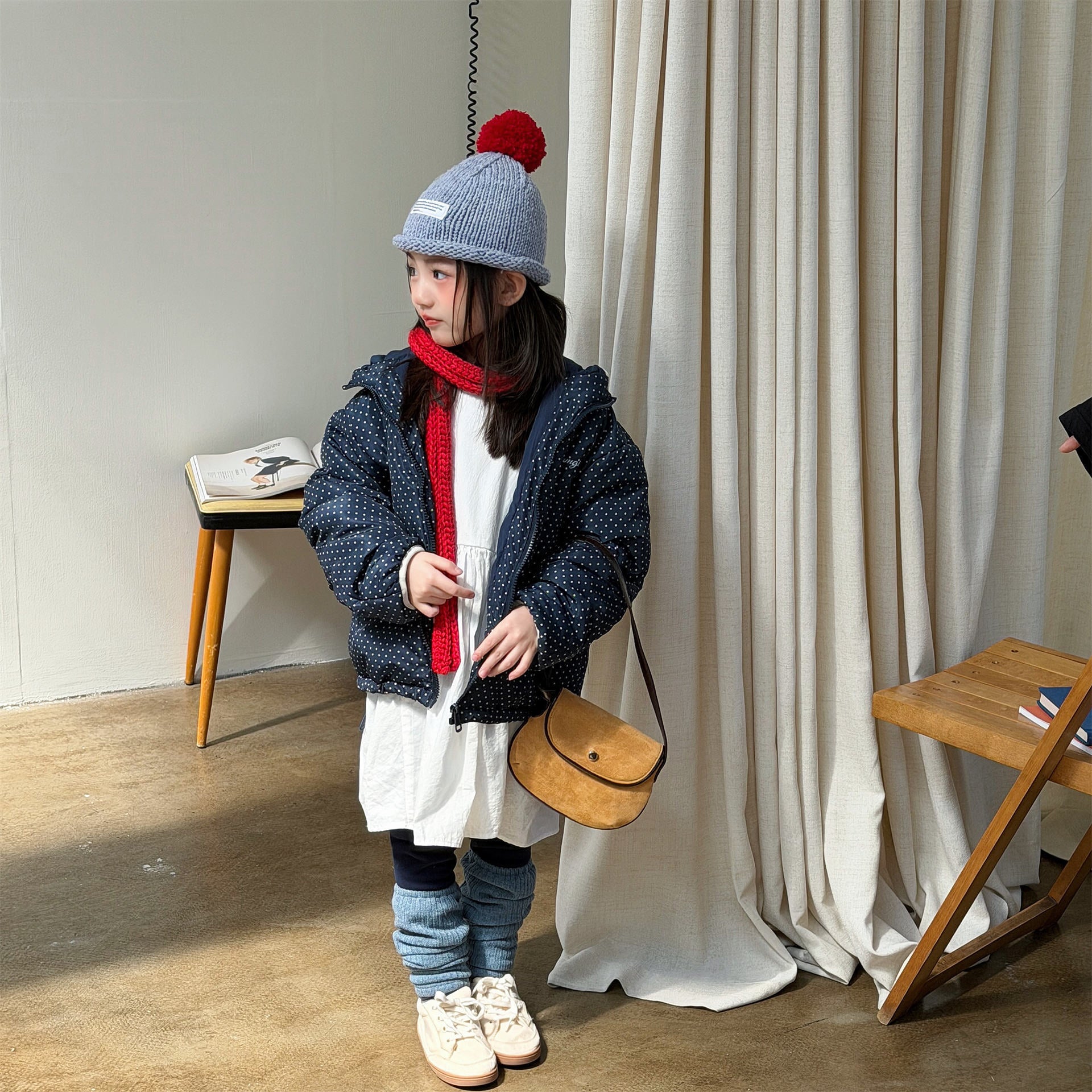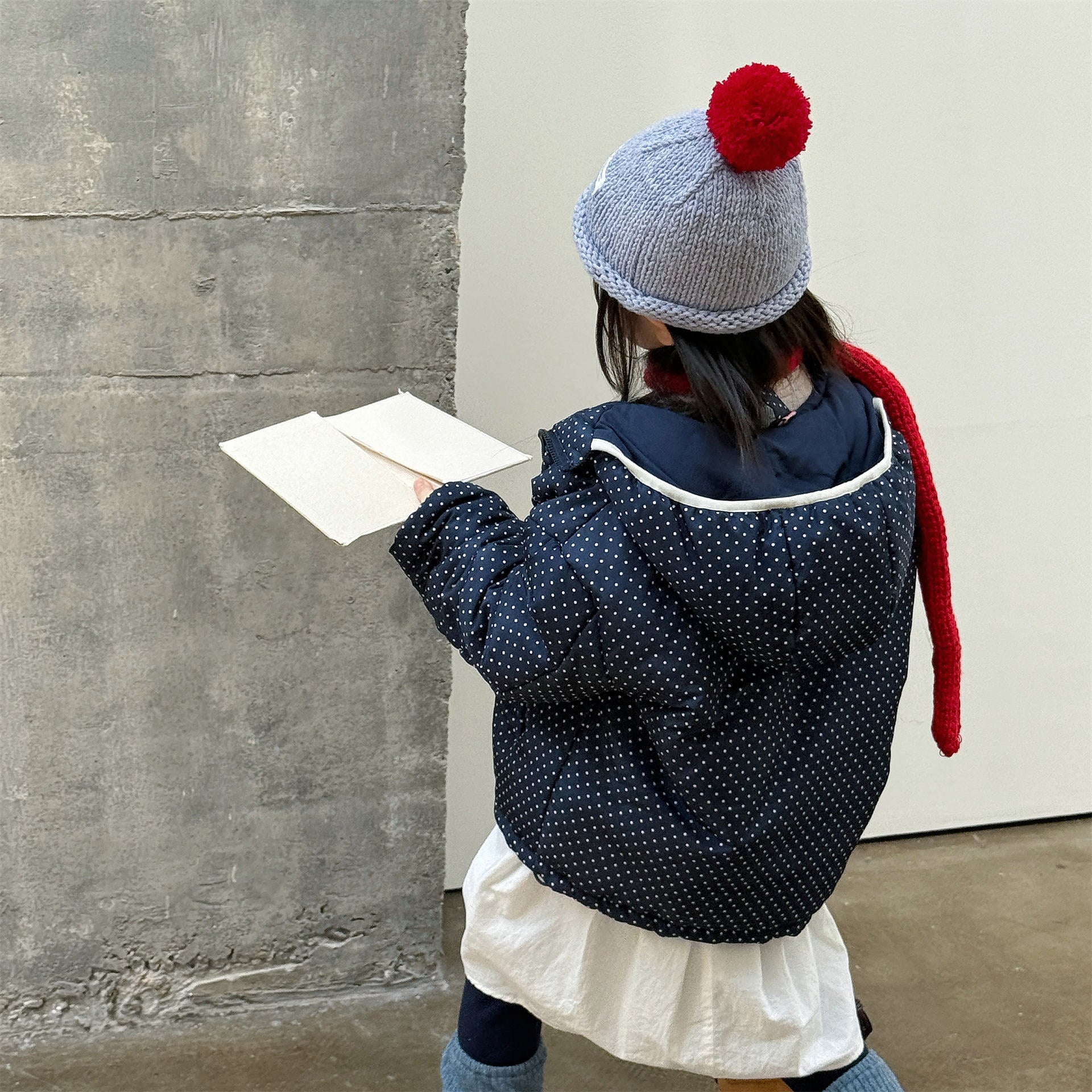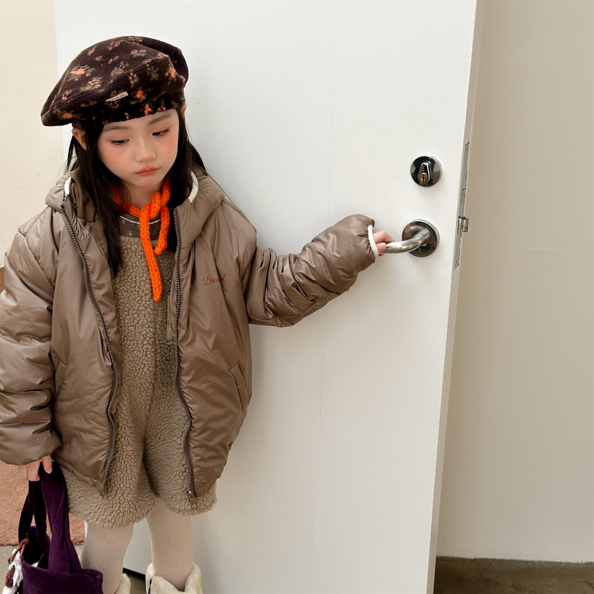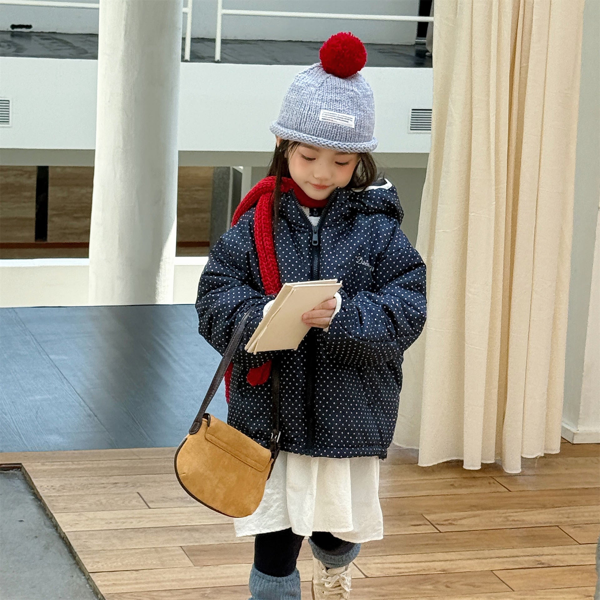 ふっくらとしたボリューム感のあるシルエットが魅力的な、中綿入りのフード付きブルゾンジャケットです。無地のシンプルで洗練されたスタイルと、可愛らしいドット柄のバリエーションを展開しており、どちらも高い保温性を持つ中綿が冬の冷気からお子様をしっかりと守ります。トレンドの韓国スタイルを反映した「パン服」のような愛らしいフォルムは、男の子にも女の子にも似合うユニセックスなデザインで、通学や公園遊び、冬のお出かけまで幅広いシーンで活躍する、軽くて暖かな機能的アウターです。