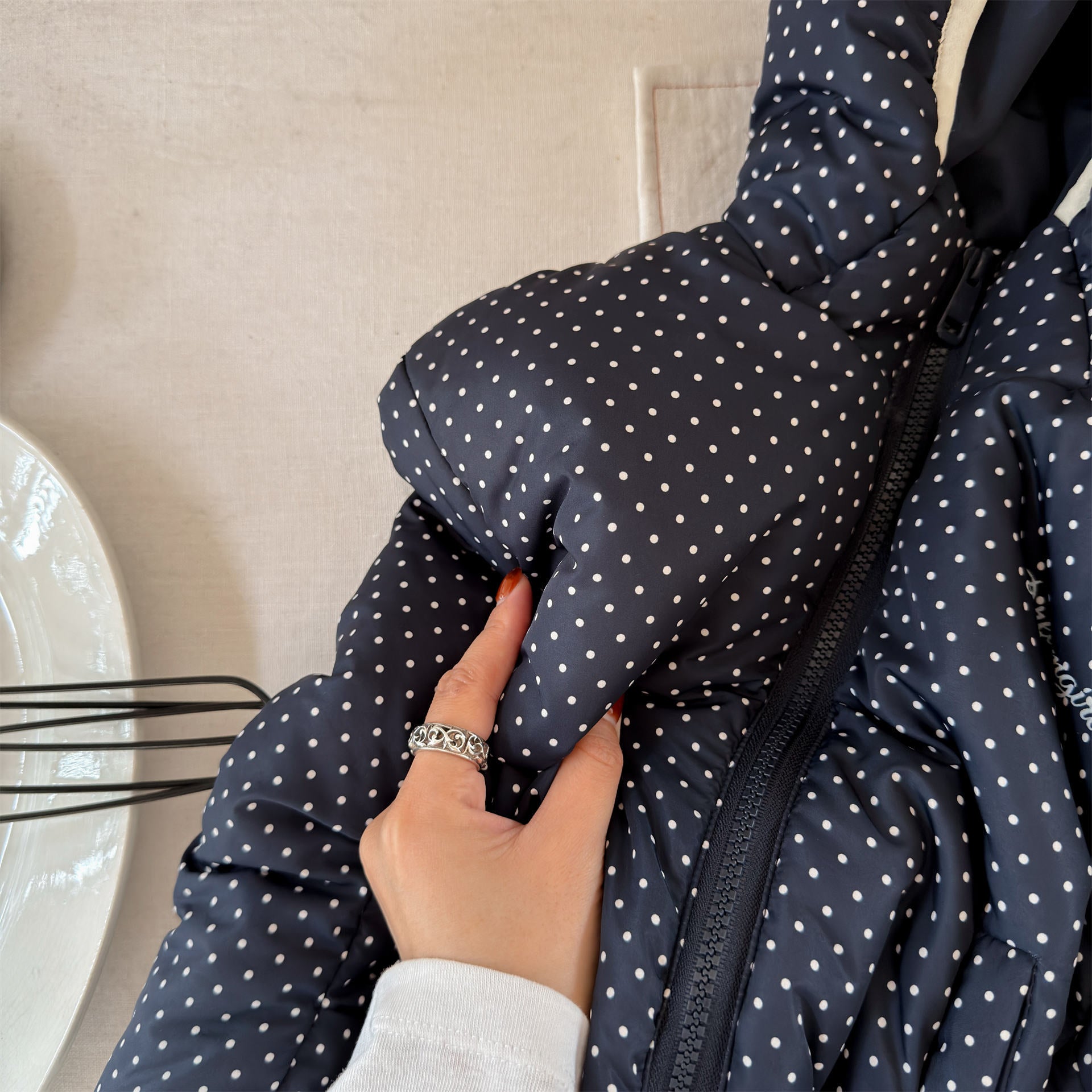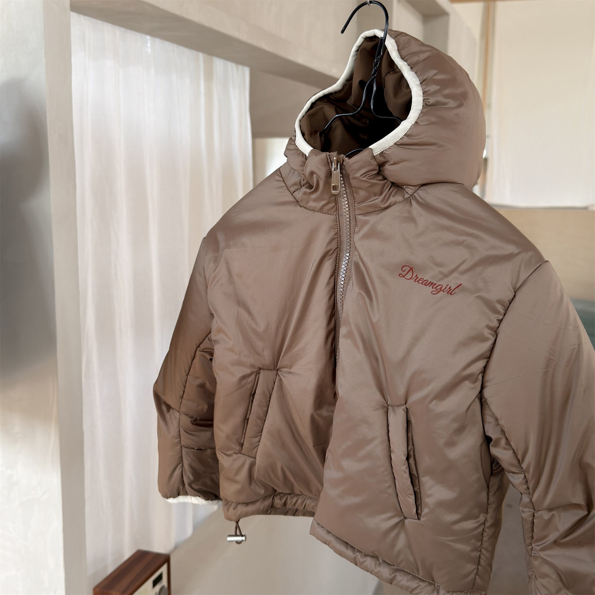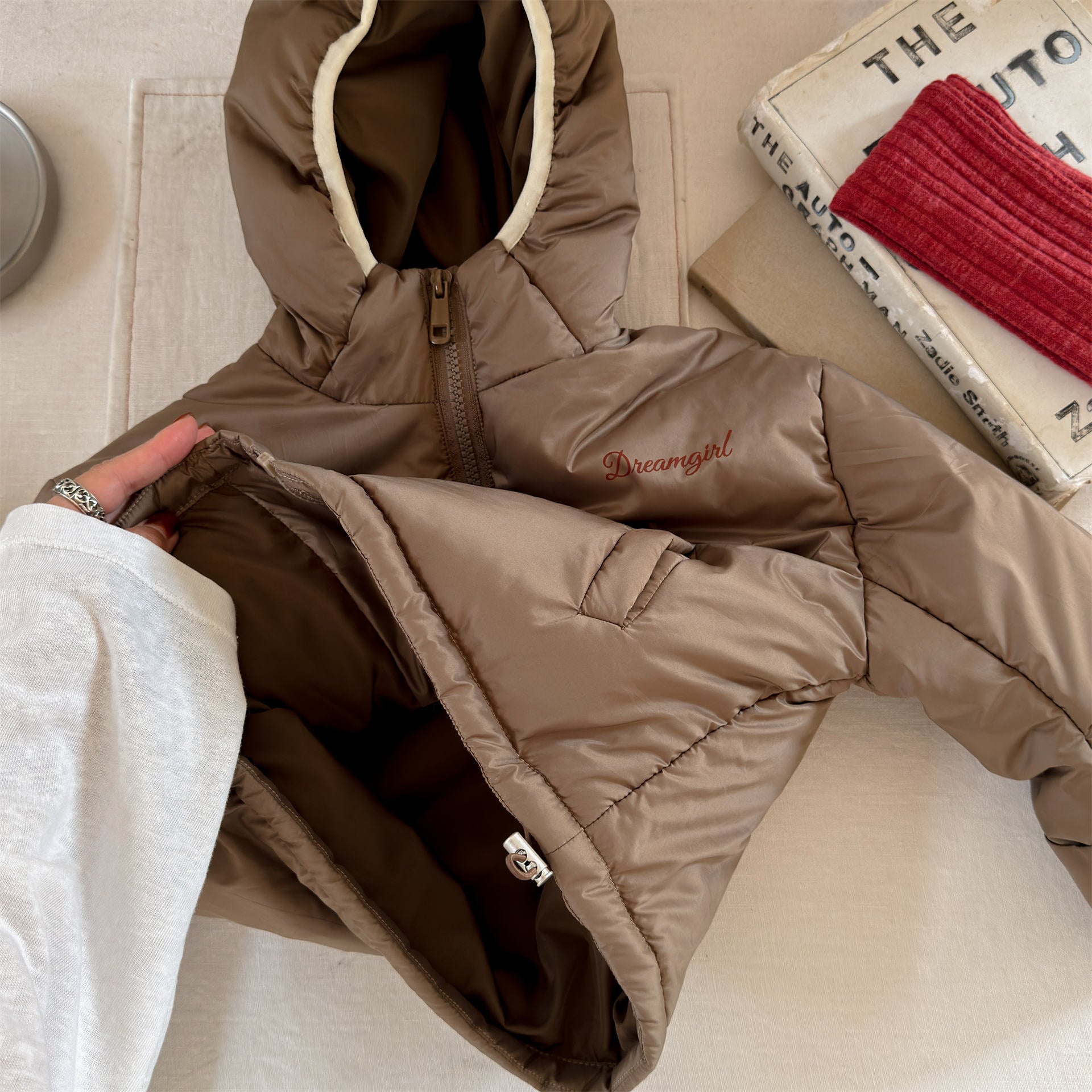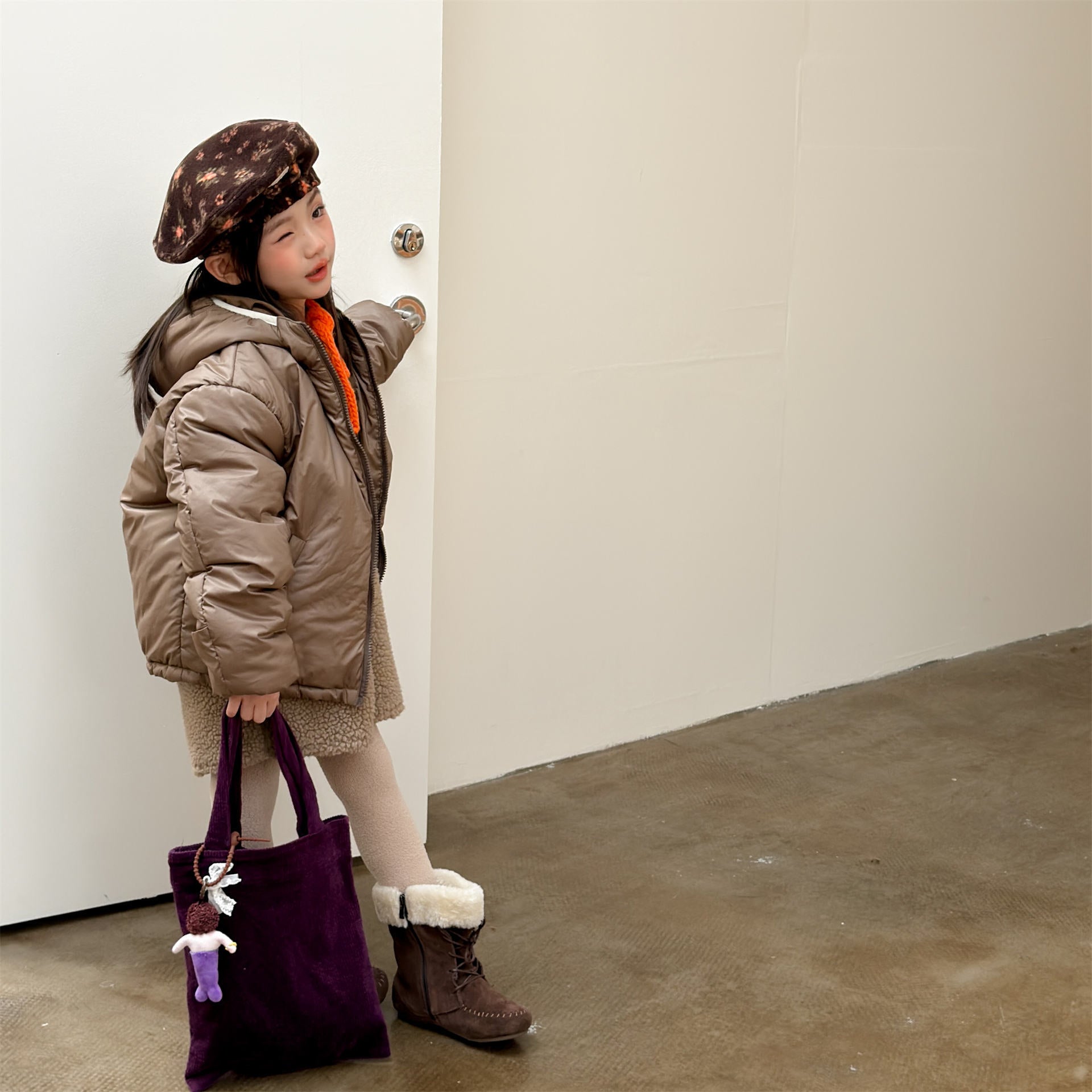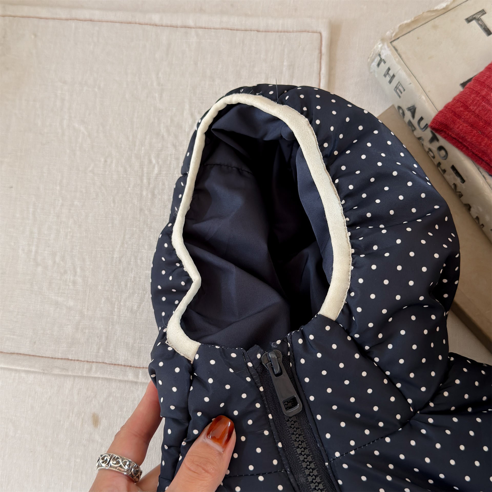 ふっくらとしたボリューム感のあるシルエットが魅力的な、中綿入りのフード付きブルゾンジャケットです。無地のシンプルで洗練されたスタイルと、可愛らしいドット柄のバリエーションを展開しており、どちらも高い保温性を持つ中綿が冬の冷気からお子様をしっかりと守ります。トレンドの韓国スタイルを反映した「パン服」のような愛らしいフォルムは、男の子にも女の子にも似合うユニセックスなデザインで、通学や公園遊び、冬のお出かけまで幅広いシーンで活躍する、軽くて暖かな機能的アウターです。