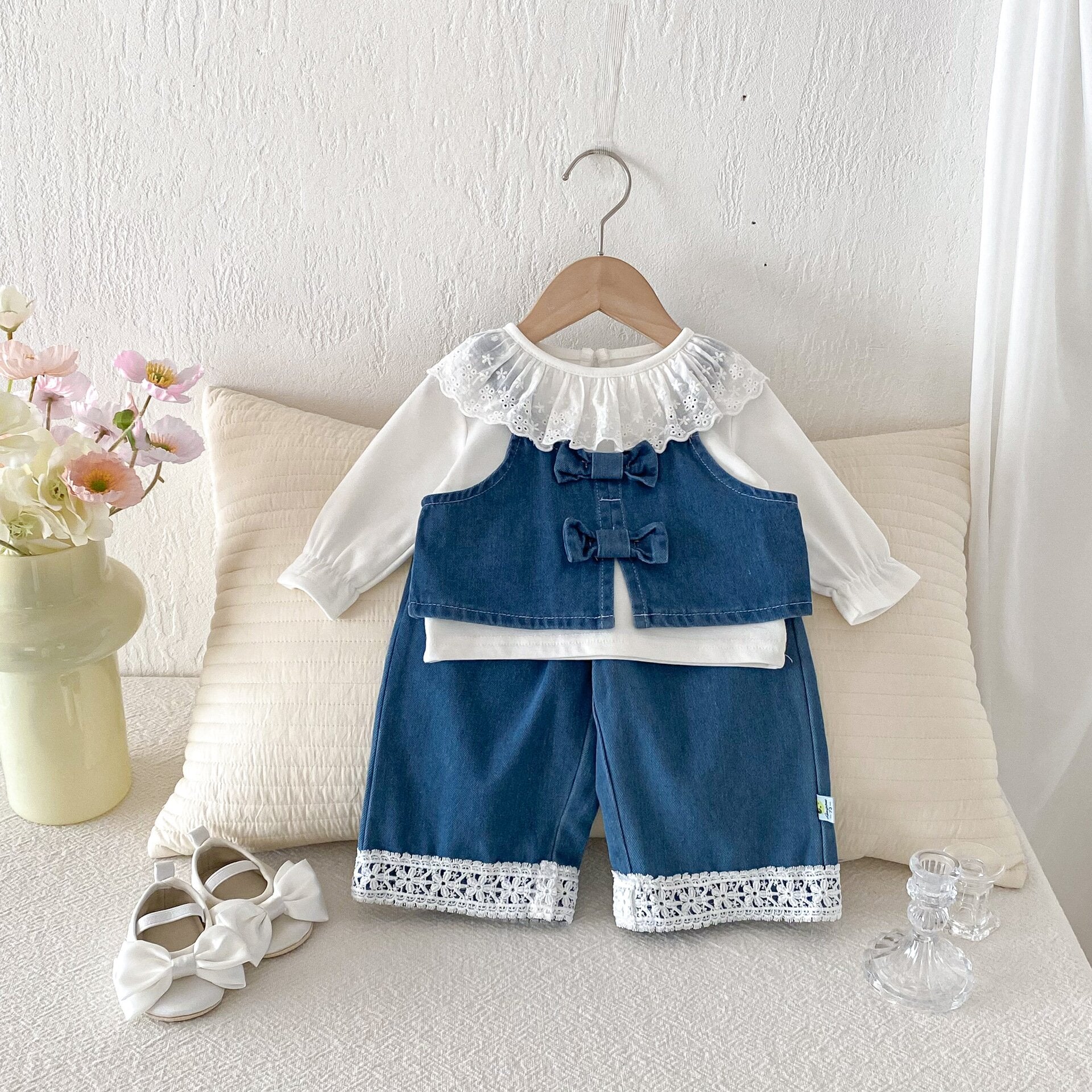 繊細なレースやリボンを随所に散りばめた、デニムの上下セットアップとフリルブラウスです。 主な生地にコットンを贅沢に使用し、お子様の肌に優しい柔らかな質感に仕上げています。