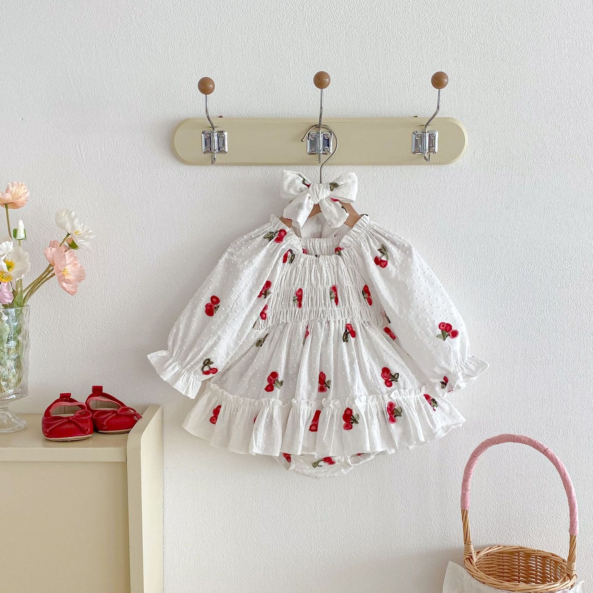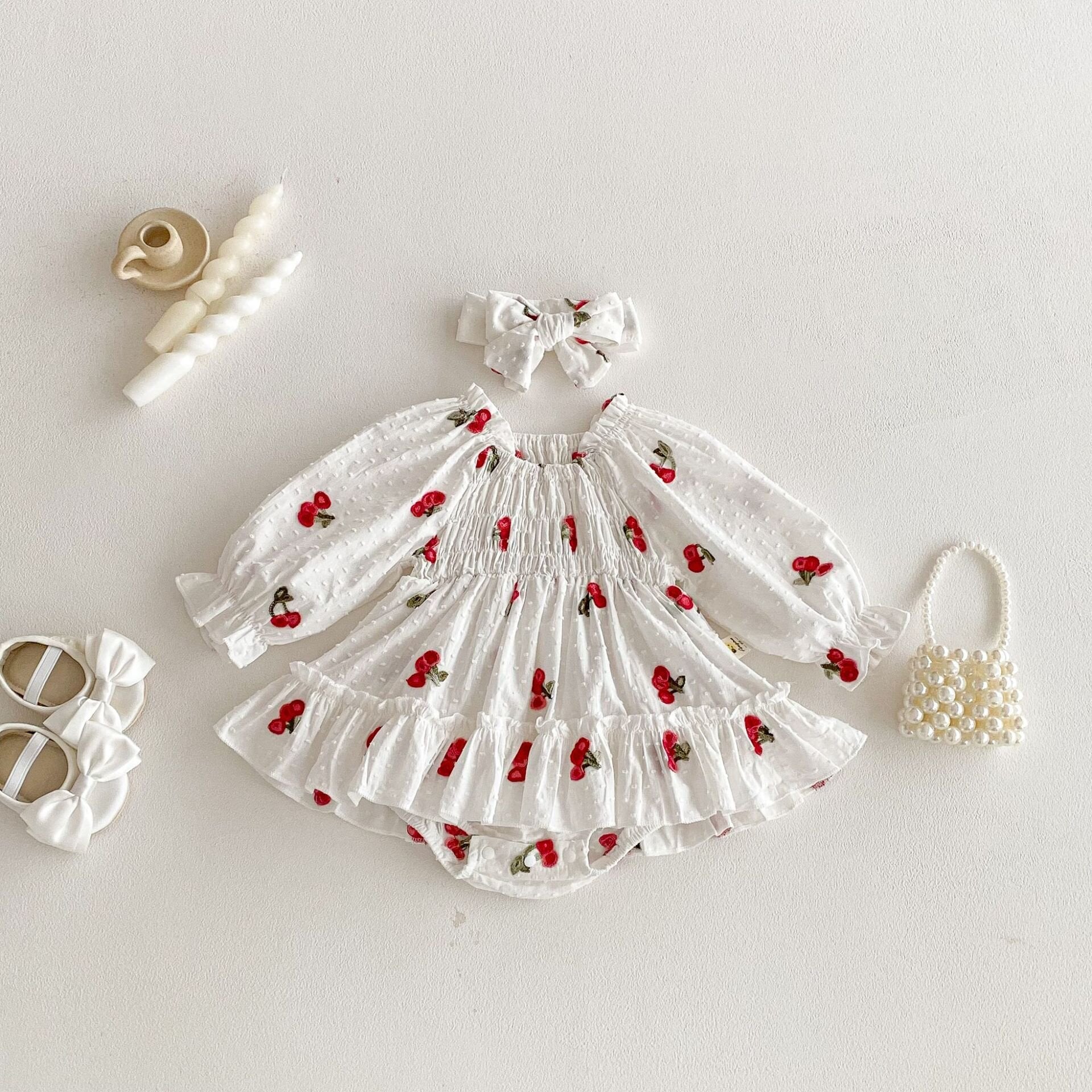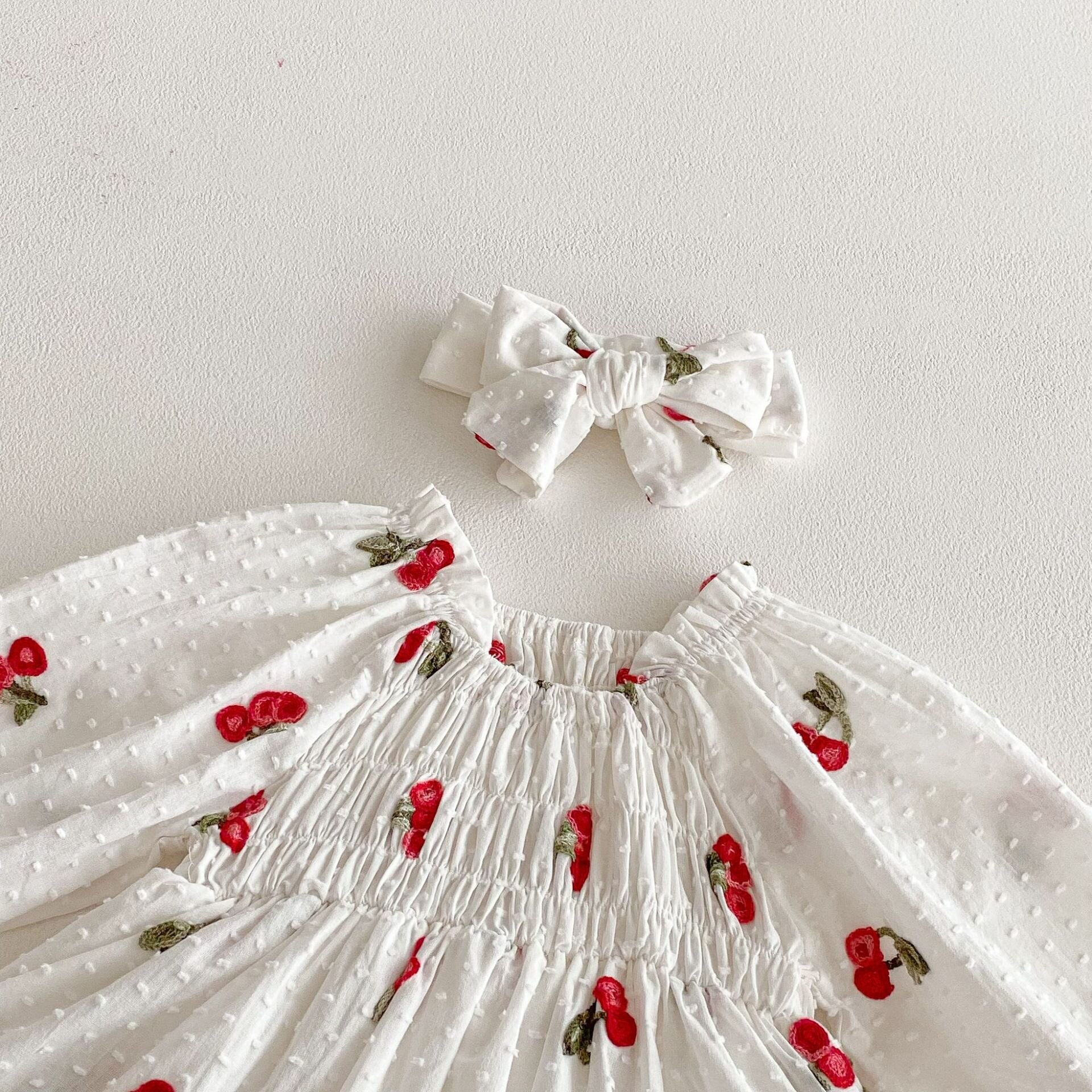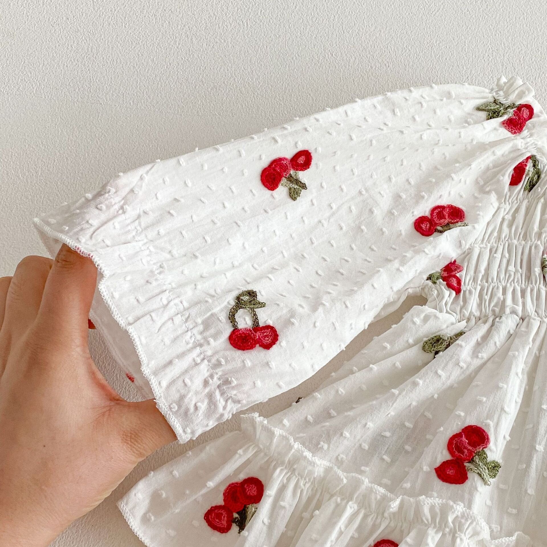 一面に散りばめられたチェリー柄が目を惹く、スカート付きのロンパース(ジャンプスーツ)です。 主な生地に高品質なコットンを95%使用し、赤ちゃんの繊細な肌を優しく包む、ふっくらと柔らかな質感に仕上げました。