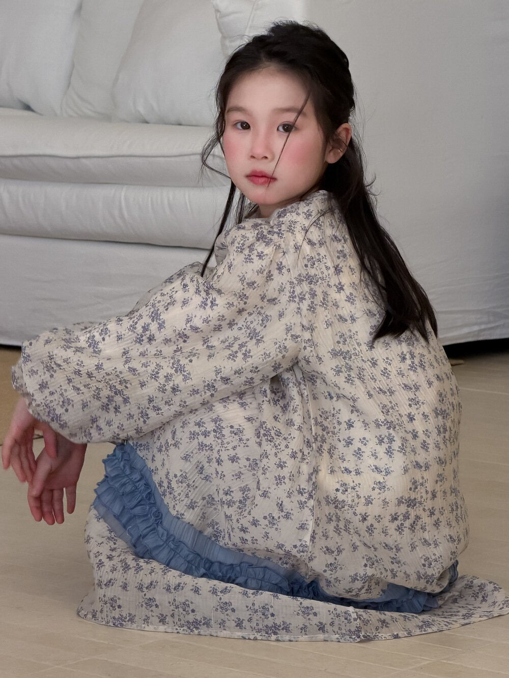 肌に優しいコットン100%の生地を使用し、表面には繊細な凹凸のあるシボ加工を施しました。柔らかな生成り色のベースに、落ち着いたブルーグレーの小花が散りばめられた、どこか懐かしく上品なボタニカルプリントです。裏地も綿素材を採用しており、お子様のデリケートな肌にもさらりと心地よく馴染みます。