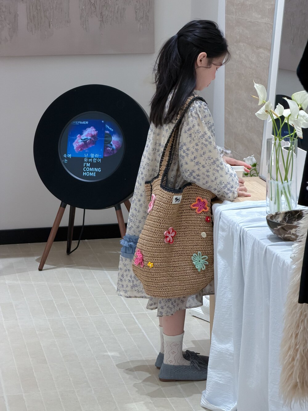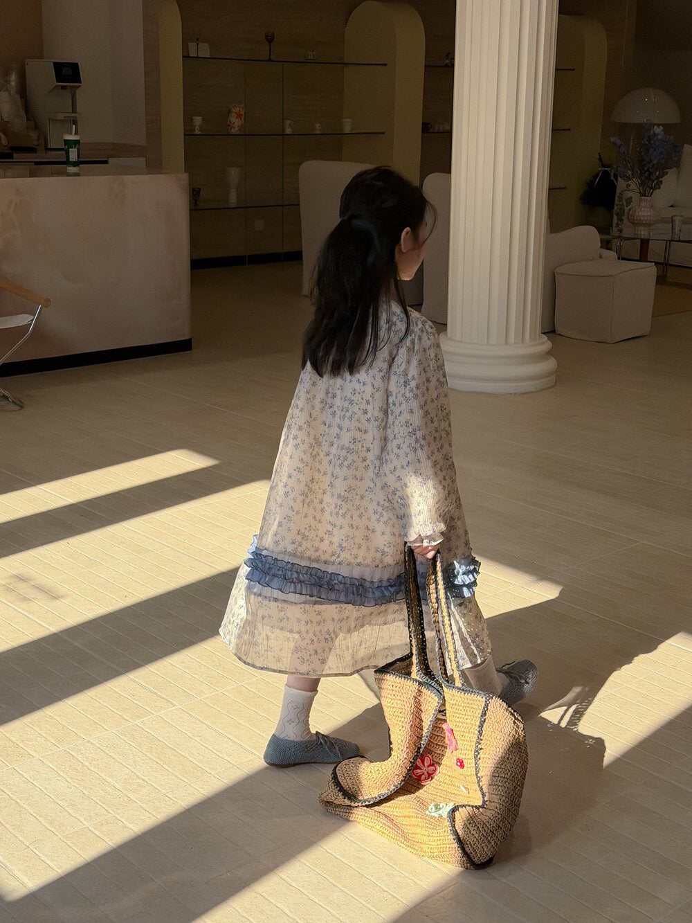 ふんわりとしたボリューム袖と、裾にあしらわれた異素材のフリルが、歩くたびに可憐に揺れ動きます。生地は伸び縮みしないタイプですが、その分しっかりとしたハリがあり、綺麗なAラインシルエットを崩さずキープしてくれます。細部まで丁寧に縫製されており、上品な雰囲気が漂う一着です。